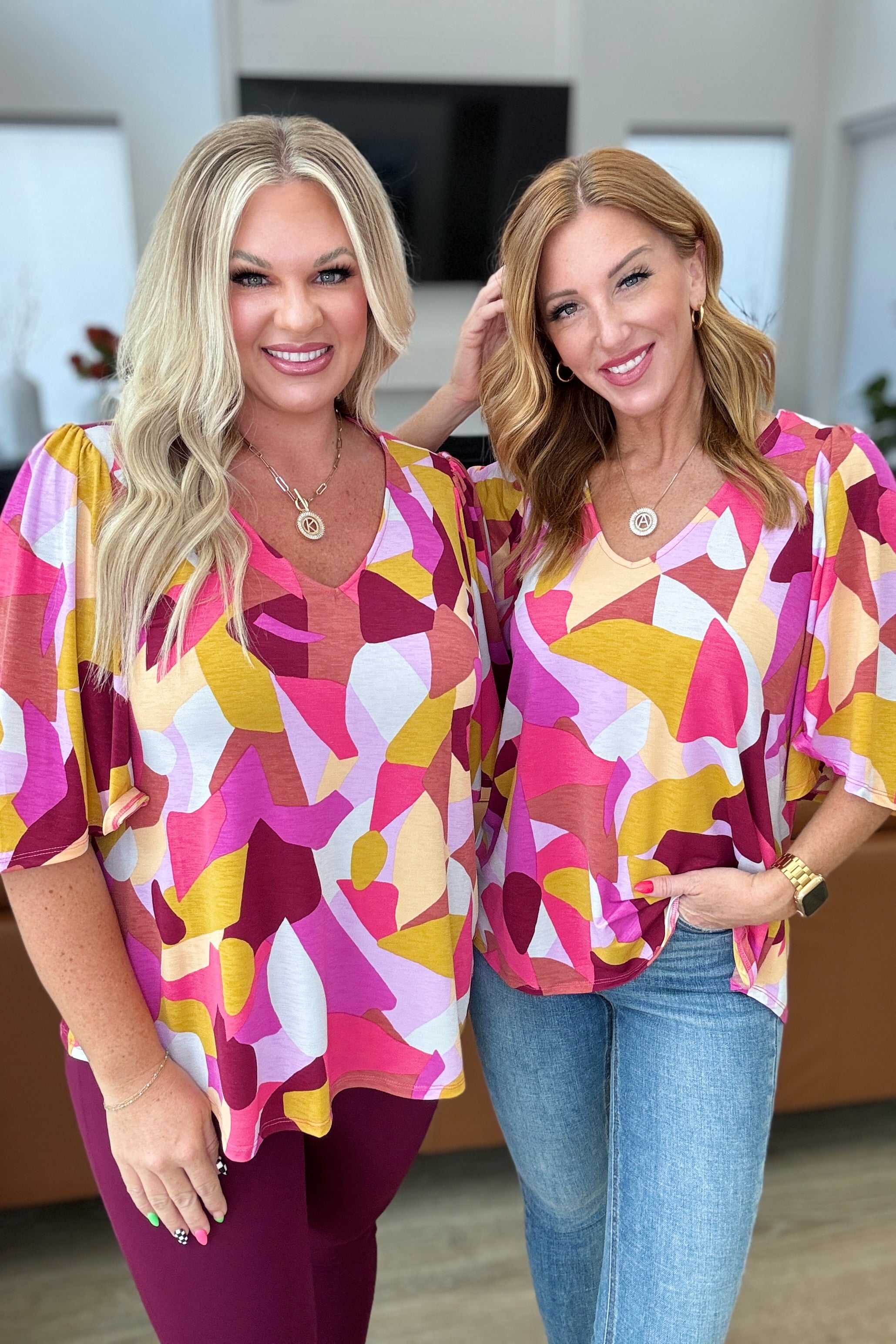 The Cali Blouse in Magenta and Mustard Abstract is a stylish and versatile piece, perfect for any occasion. Made with high-quality bulgari fabric, the blouse has a comfortable and stretchy fit. The v-neckline and bell sleeves add a touch of elegance, while the wrinkle-resistant feature makes it easy to maintain. Upgrade your wardrobe with this must-have blouse.