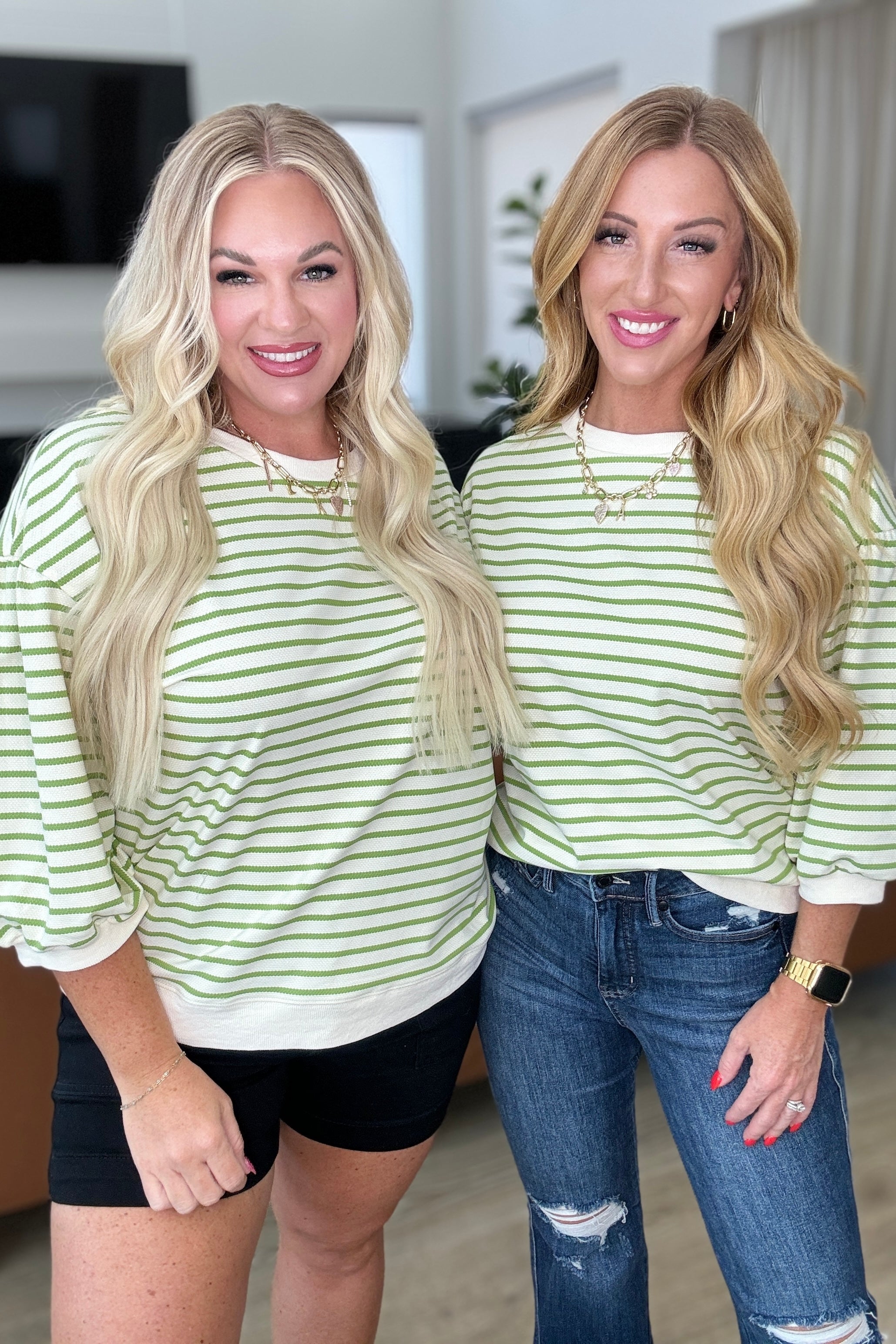 Add a playful touch to your wardrobe with our Enrichment Time Striped Top! Made with midweight sweater knit for a high-stretch, comfortable fit. Featuring a round, ribbed neckline, balloon sleeve, and exaggerated ribbed hem. Perfect for a quirky and fun look.