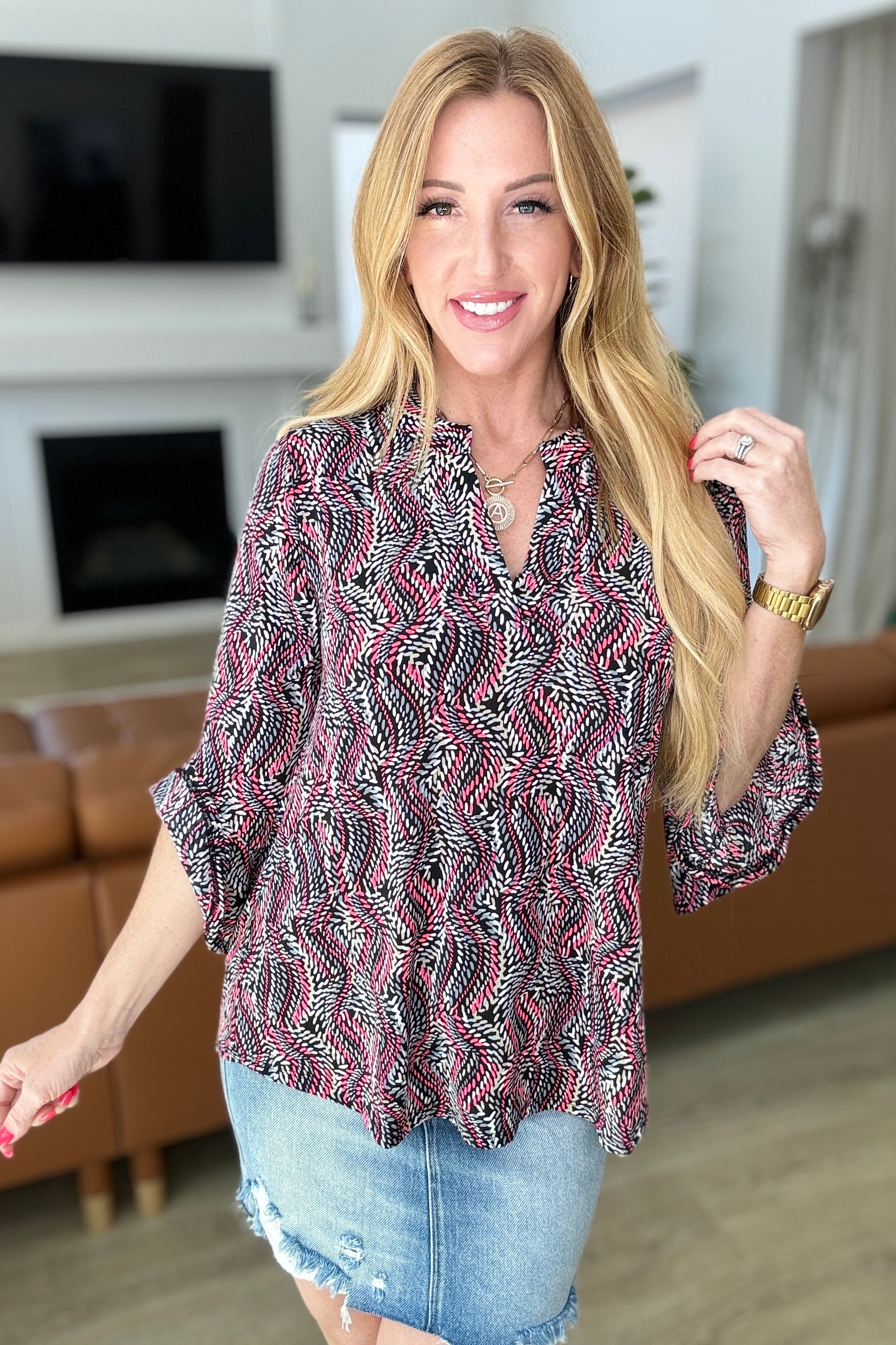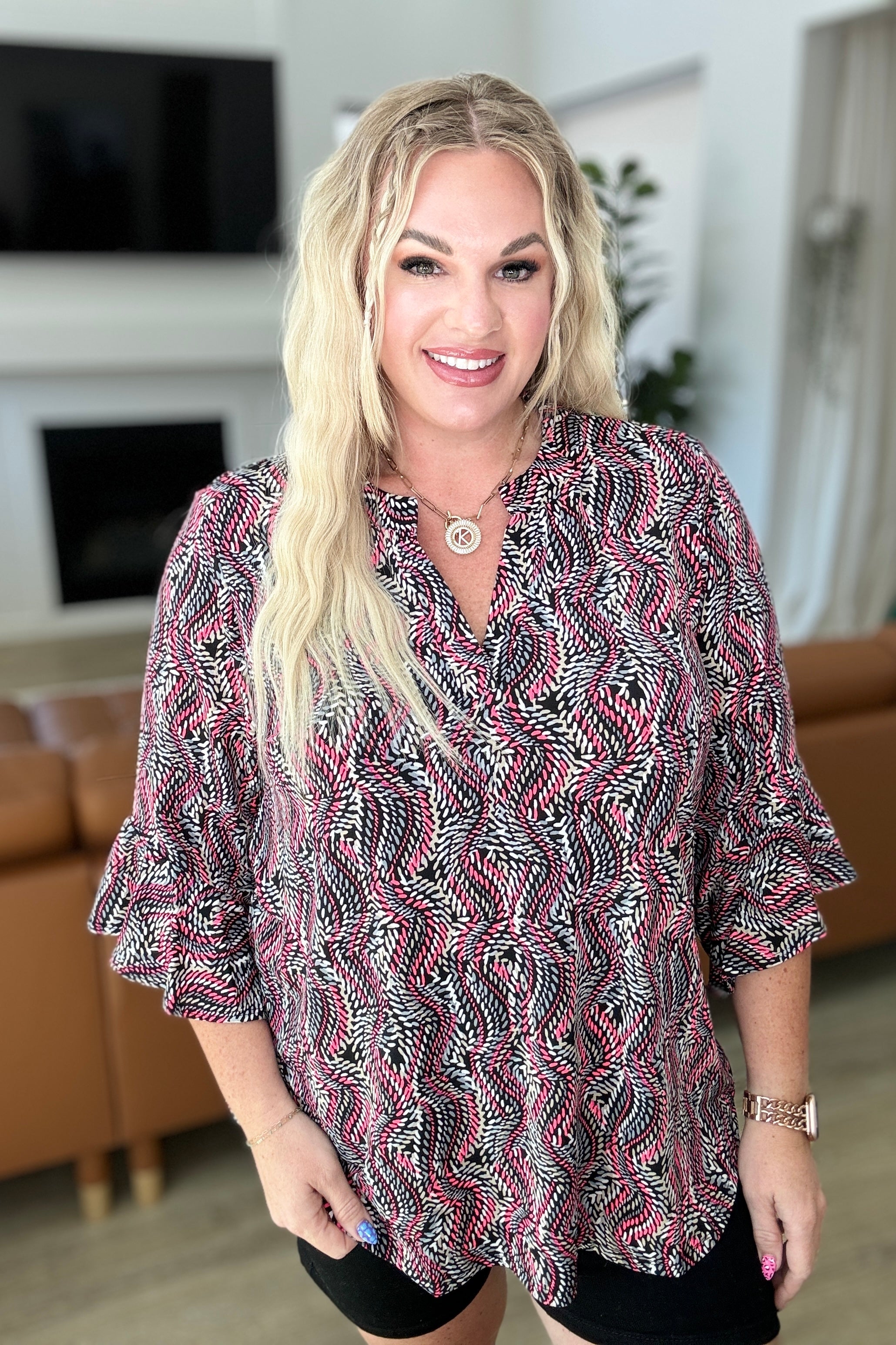 Upgrade your wardrobe with our Lizzy Bell Sleeve Top. Made with easy-to-wear bulgari fabric, the Lizzy v-neckline and 3/4 length bell sleeves provide both comfort and style. Stand out with the cutest print and make a statement wherever you go.