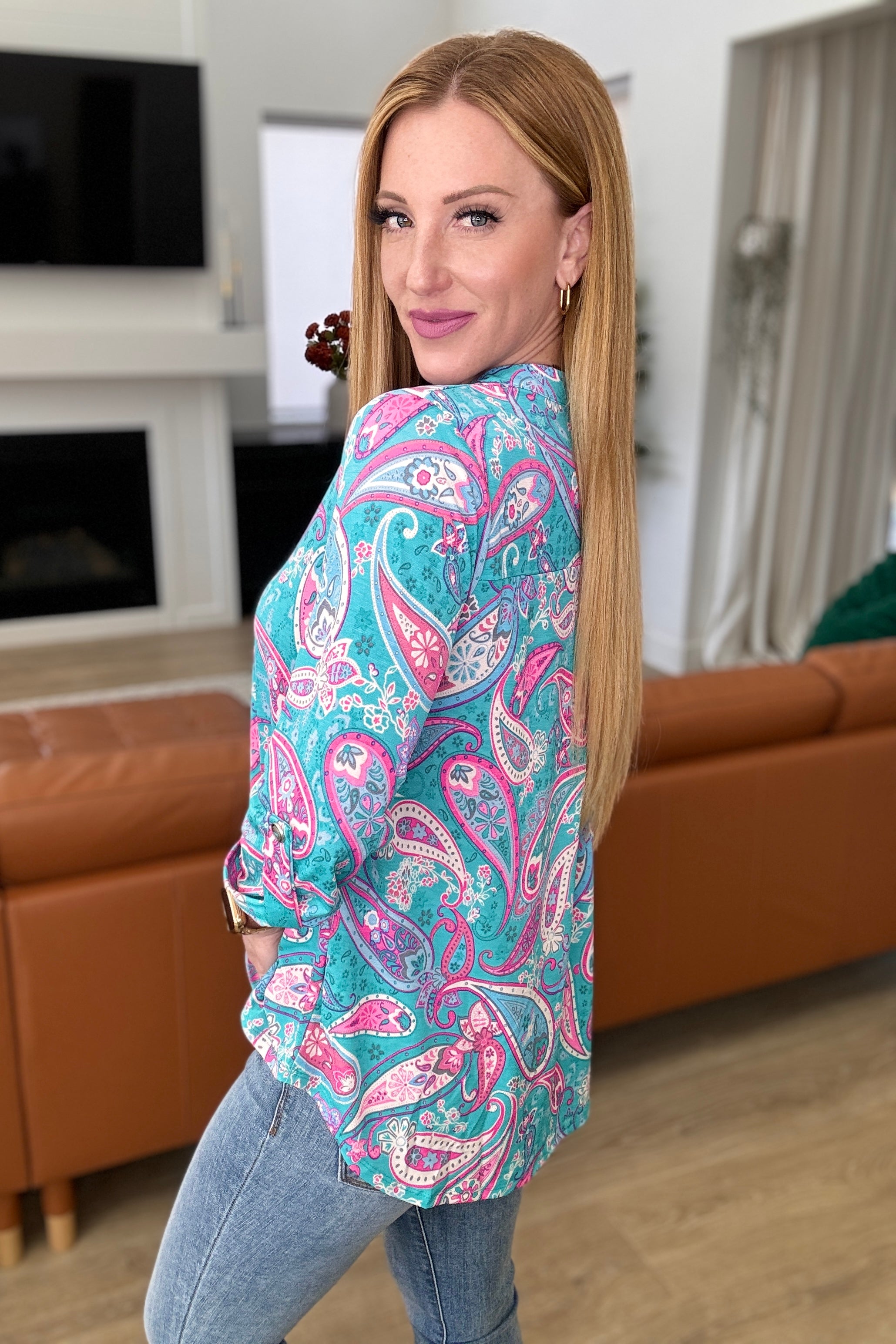 Transform your closet with the Lizzy Top in Aqua and Pink Paisley. Made from Bulgari, this top features a gabby neckline and button rolled sleeve tabs for a comfortable, yet eye-turning piece. The 3/4 sleeve and scoop hem add flow to the already stylish piece. Experience comfort and style in one with the Lizzy Top.