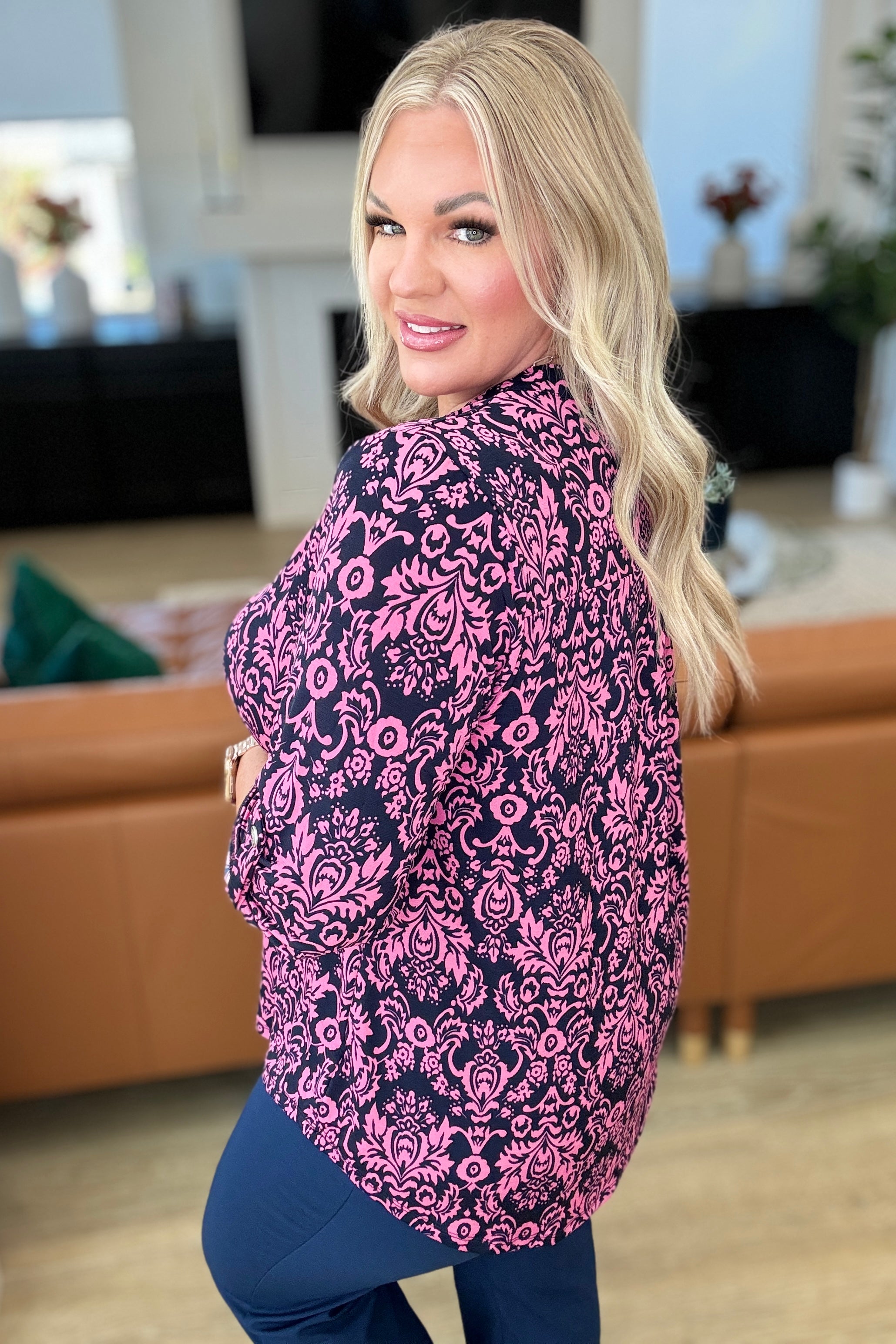 Transform your closet with the Lizzy Top in Pink and Navy Damask. Made from Bulgari, this top features a gabby neckline and rolled sleeves with button tabs for a comfortable, yet eye-catching piece. The 3/4 length sleeve and scoop hem add flow to the already stylish piece. Experience comfort and style in one with the Lizzy Top.
