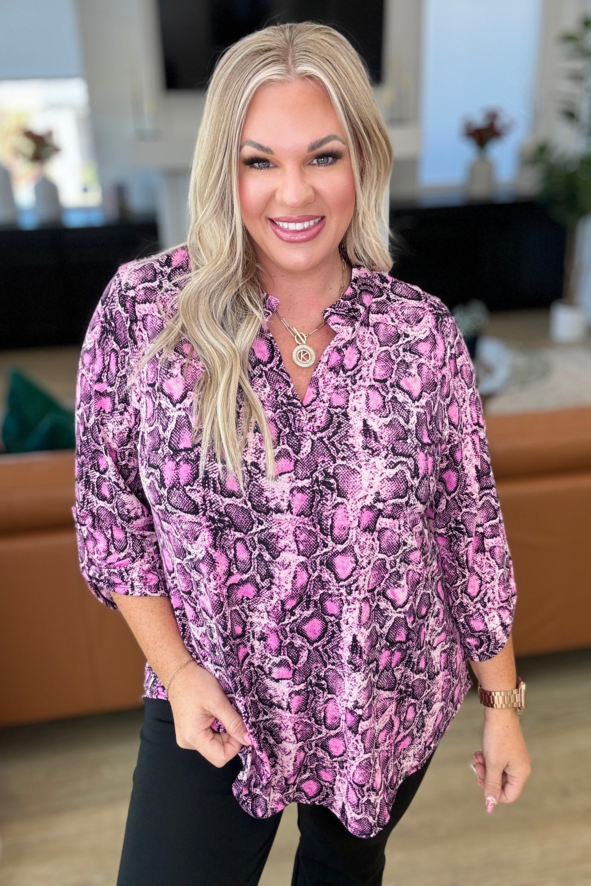 Transform your closet with the Lizzy Top in Magenta Abstract Animal Print. Made from Bulgari, this top features a gabby neckline and rolled sleeves with button tabs for a comfortable, yet eye-catching piece. The 3/4 length sleeve and scoop hem add flow to the already stylish piece. Experience comfort and style in one with the Lizzy Top.