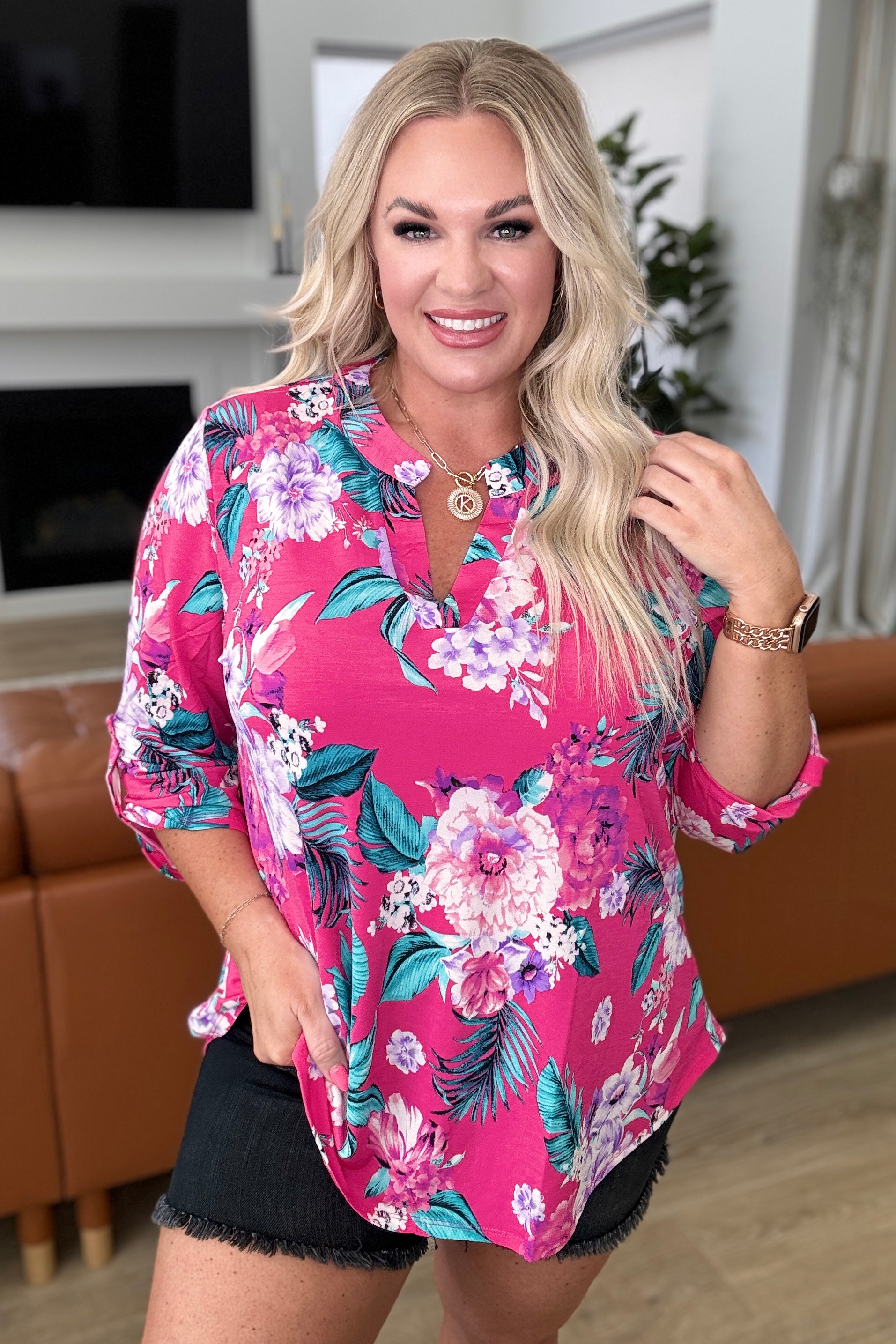 Transform your closet with the Lizzy Top in Magenta and Teal Tropical Floral. Made from Bulgari, this top features a gabby neckline and button rolled sleeve tabs for a comfortable, yet eye-turning piece. The 3/4 sleeve and scoop hem add flow to the already stylish piece. Experience comfort and style in one with the Lizzy Top.