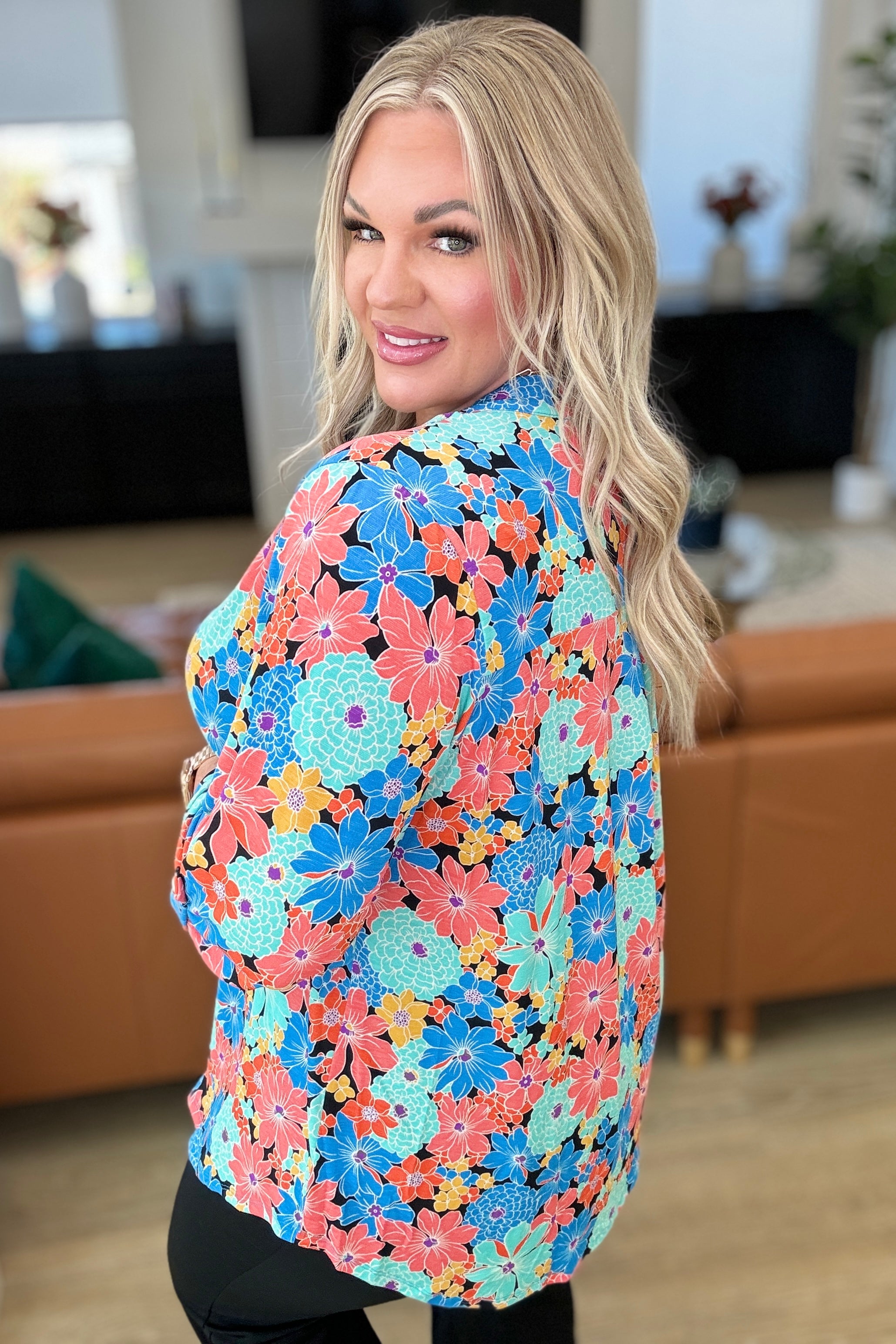 Transform your closet with the Lizzy Top in Royal and Jade Floral. Made from Bulgari, this top features a gabby neckline and button rolled sleeve tabs for a comfortable, yet eye-turning piece. The 3/4 sleeve and scoop hem add flow to the already stylish piece. Experience comfort and style in one with the Lizzy Top.