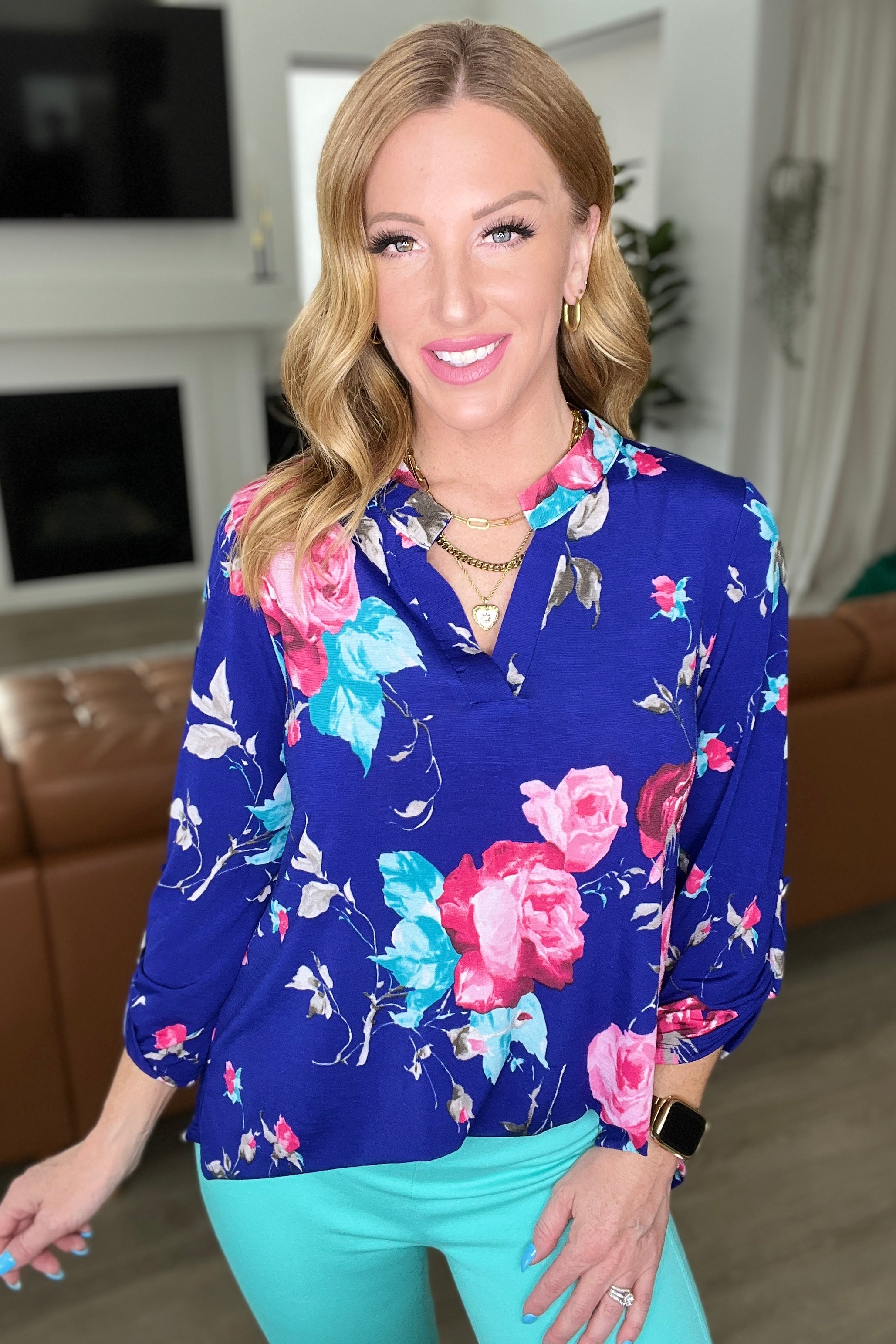 Transform your closet with the Lizzy Top in Royal Floral. Made from Bulgari, this top features a gabby neckline and button rolled sleeve tabs for a comfortable, yet eye-turning piece. The 3/4 sleeve and scoop hem add flow to the already stylish piece. Experience comfort and style in one with the Lizzy Top.