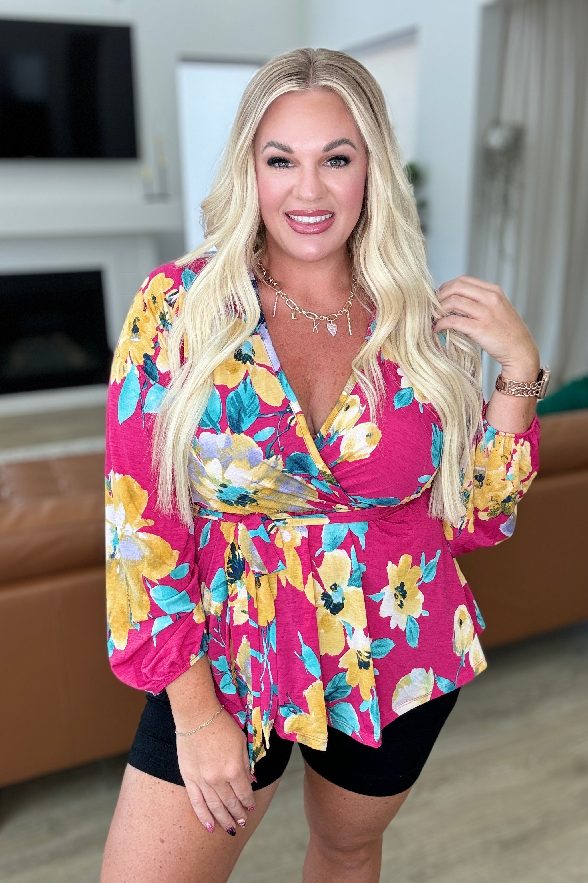 Experience the beauty of spring with our Spring to Be Sprung V-Neck Floral Blouse! Made with soft and flowy Bulgari fabric, this blouse features a flattering faux wrap V-neck, balloon sleeves, and a cased elastic sleeve cuff for added comfort. The elastic waistline with a functional tie create a figure-flattering silhouette. Complete the look with the scooped hem for a touch of femininity. Spring is in full bloom with this blouse!