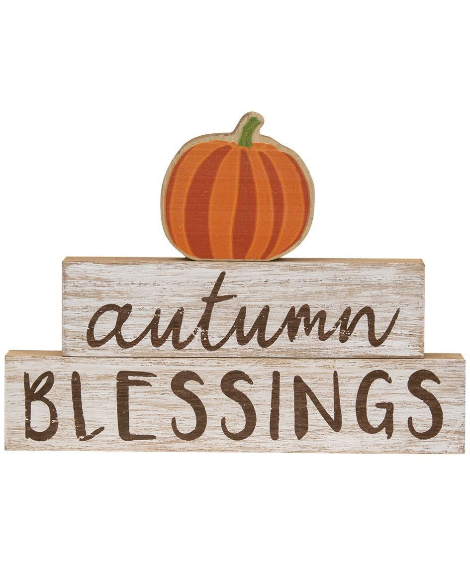 The three-piece set of Autumn Blessings Pumpkin Stackers reminds that blessings abound. Two of the wood stackers have a distressed white finish and the words 'autumn' and 'blessings' while the third piece is an orange pumpkin with a green stem. The stackers are ideal for displaying on shelves, book cases, counter or desk.