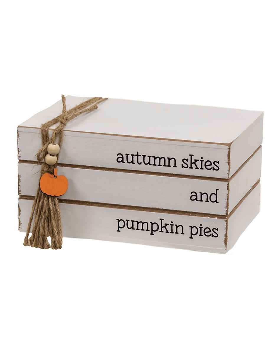 Bring a popular accent to Fall-time decor with the Autumn Skies and Pumpkin Pies Stacked Wooden Books. This single wooden piece is designed to look like three white stacked books with rough edges. The stack reads ‘autumn skies and pumpkin pies’ in black text. The books are bound with a wrapped jute cord that ends in a tassel with wooden beads and an orange pumpkin cut out. This book stack looks great with other Autumn accessories or used as a base to display candles, sitters and small signs.