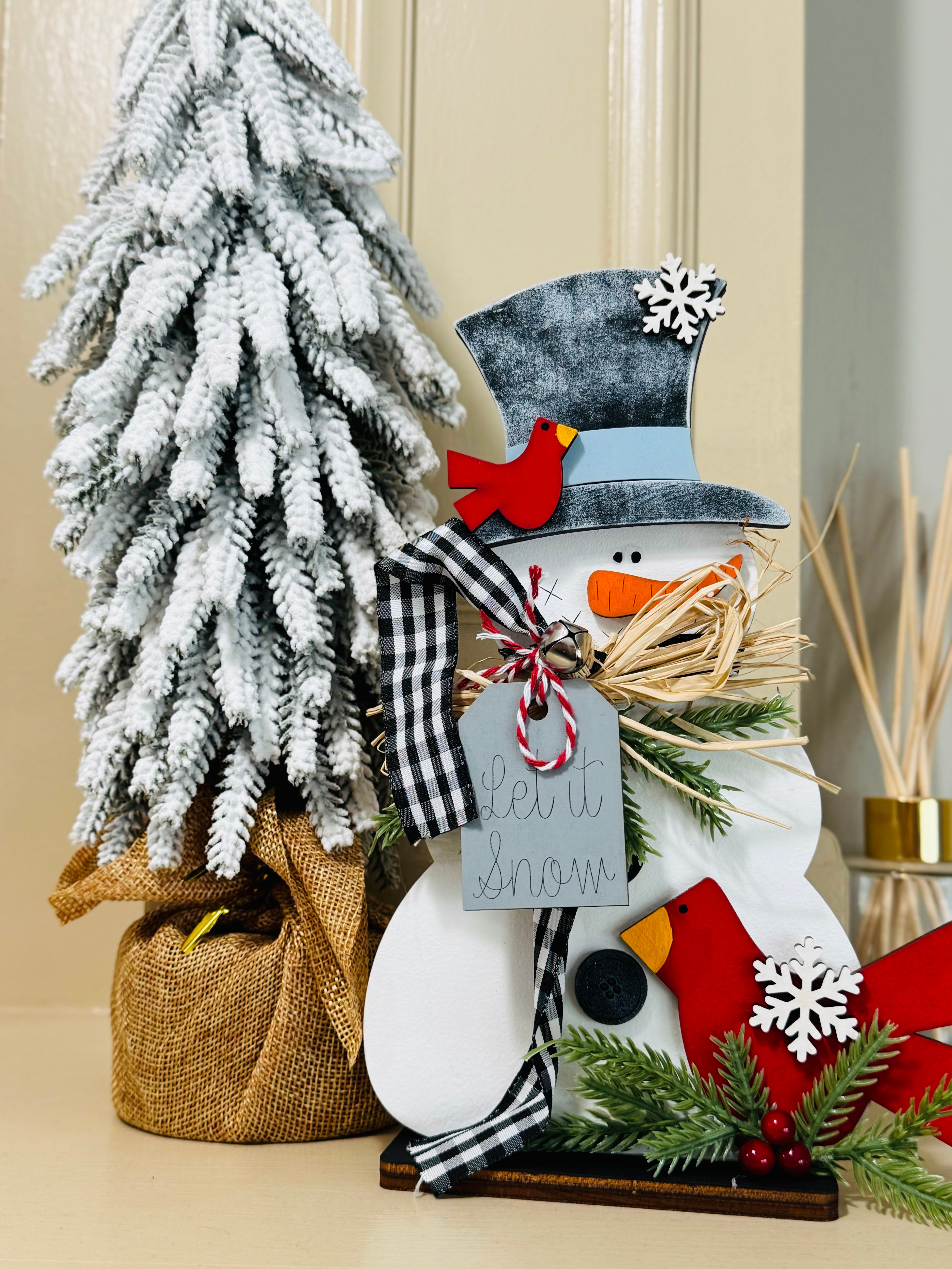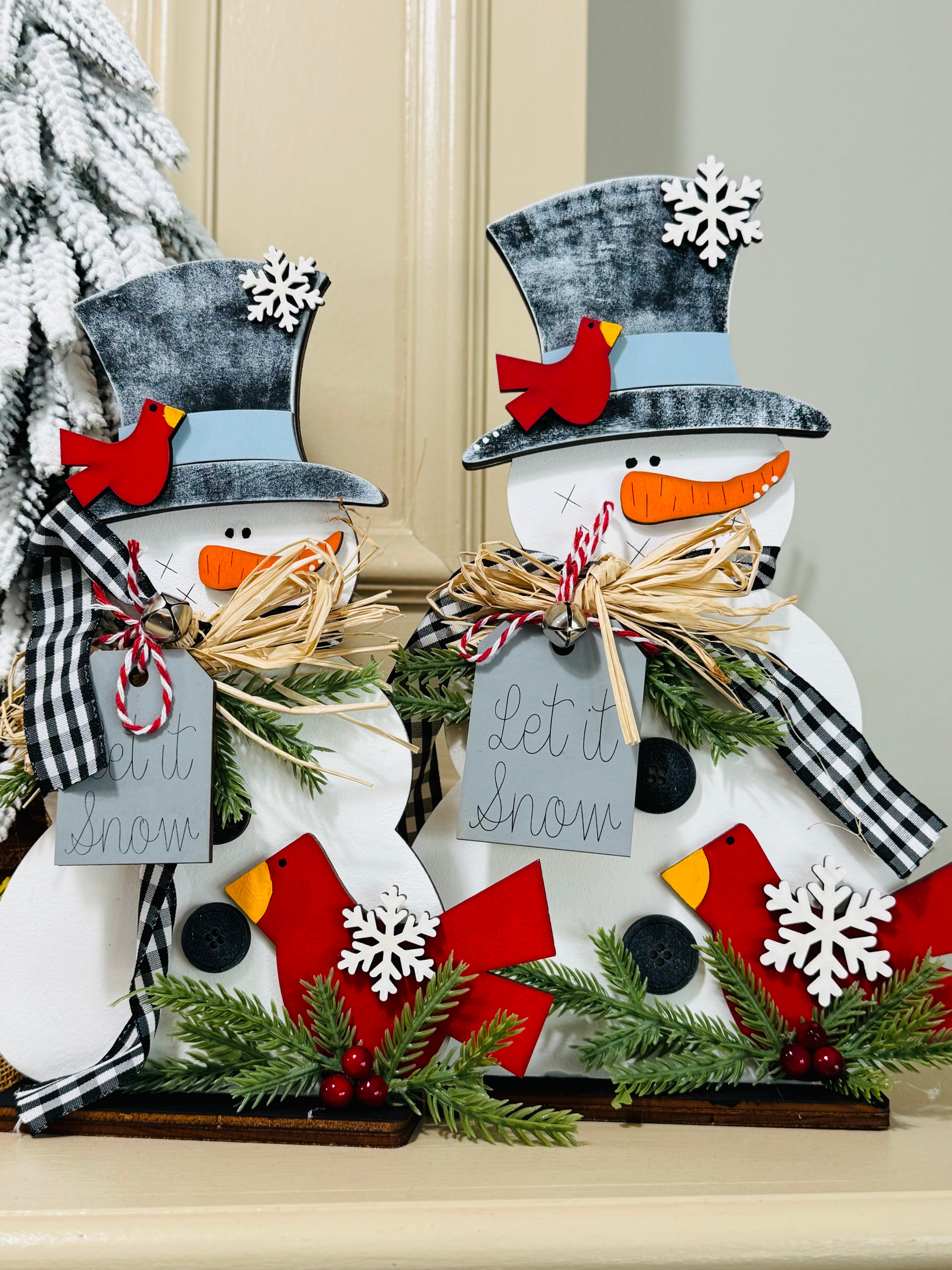 Hand painted birch plywood, three dimensional detailing including winter greenery, finished with ribbon and jute twine