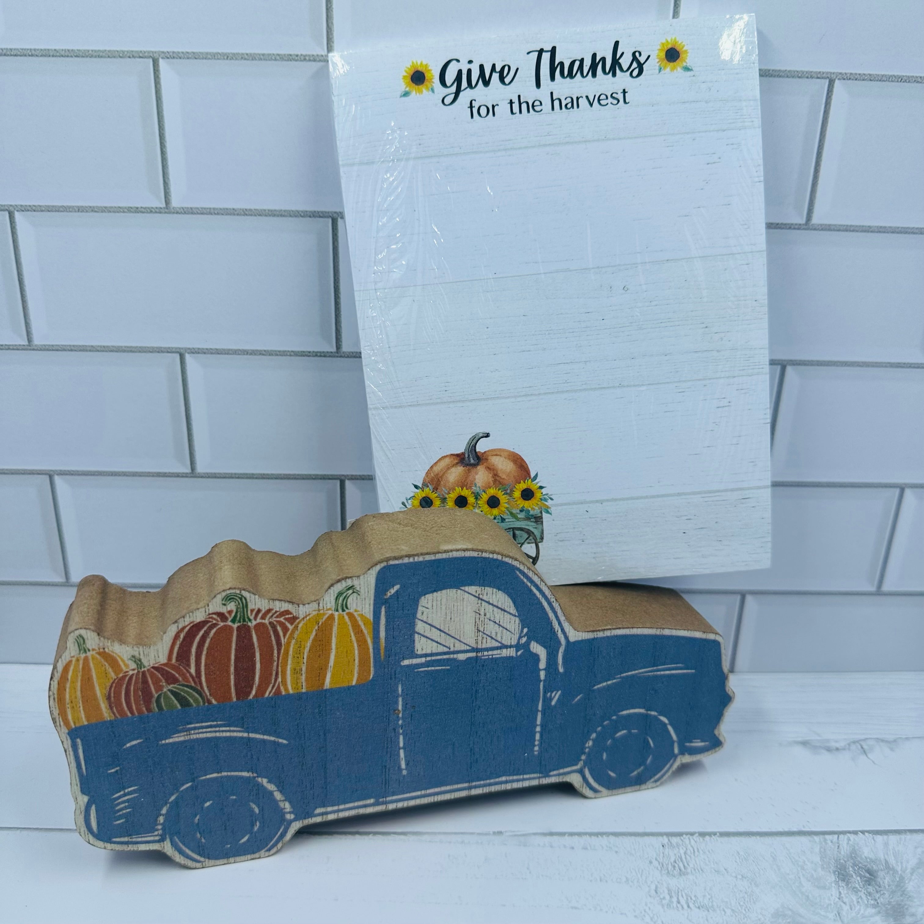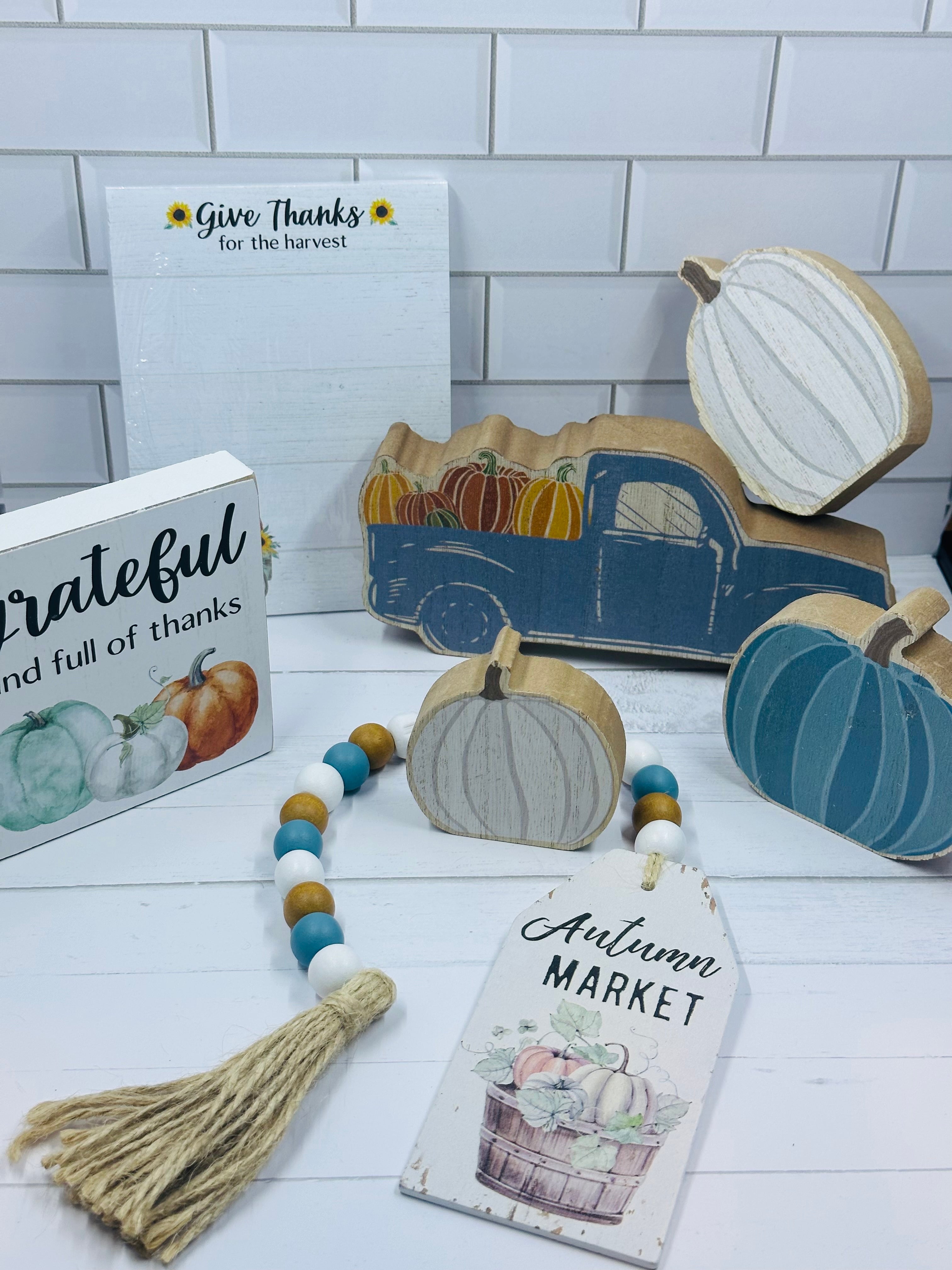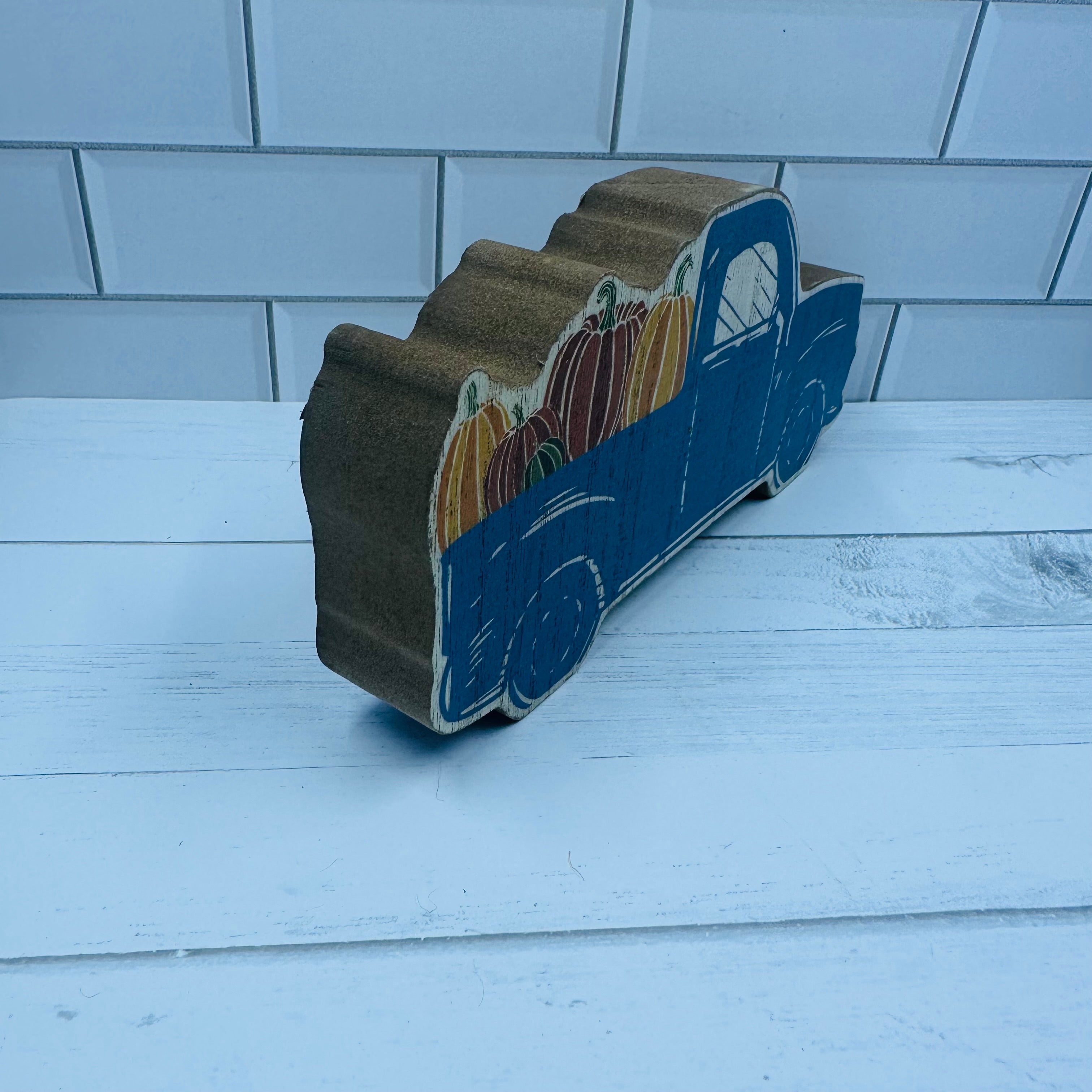 Add a truckload of festive Fall charm to the farmhouse with the Chunky Blue Pumpkin Truck Sitter. This wooden sitter features the shape of a pickup truck in slate blue carrying a bed full of orange and green pumpkins. Raw wood edges and light distressing give this adorable truck a vintage feel that will pair perfectly with any Fall, farmhouse décor. Add autumn foliage and pumpkins for a charming centerpiece. Measures 3" high by 7" wide by 1" deep.