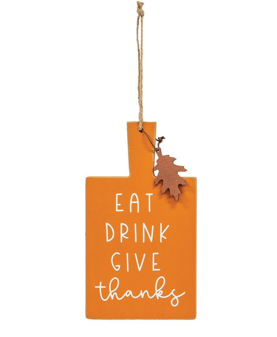 Celebrate the bounty of Fall with the Eat Drink Give Thanks Cutting Board Sign Ornament. This cute wooden cutting board shaped ornament has an orange finish with lightly distressed edges and reads ‘Eat Drink Give Thanks’ in white text and script. It is topped with a small wooden oak leaf cutout and a jute cord for easy hanging. This cutting board is at home in the kitchen or decorating the dining room for Fall-time feasts. Measures 7" high by 4" wide with a .25" depth.