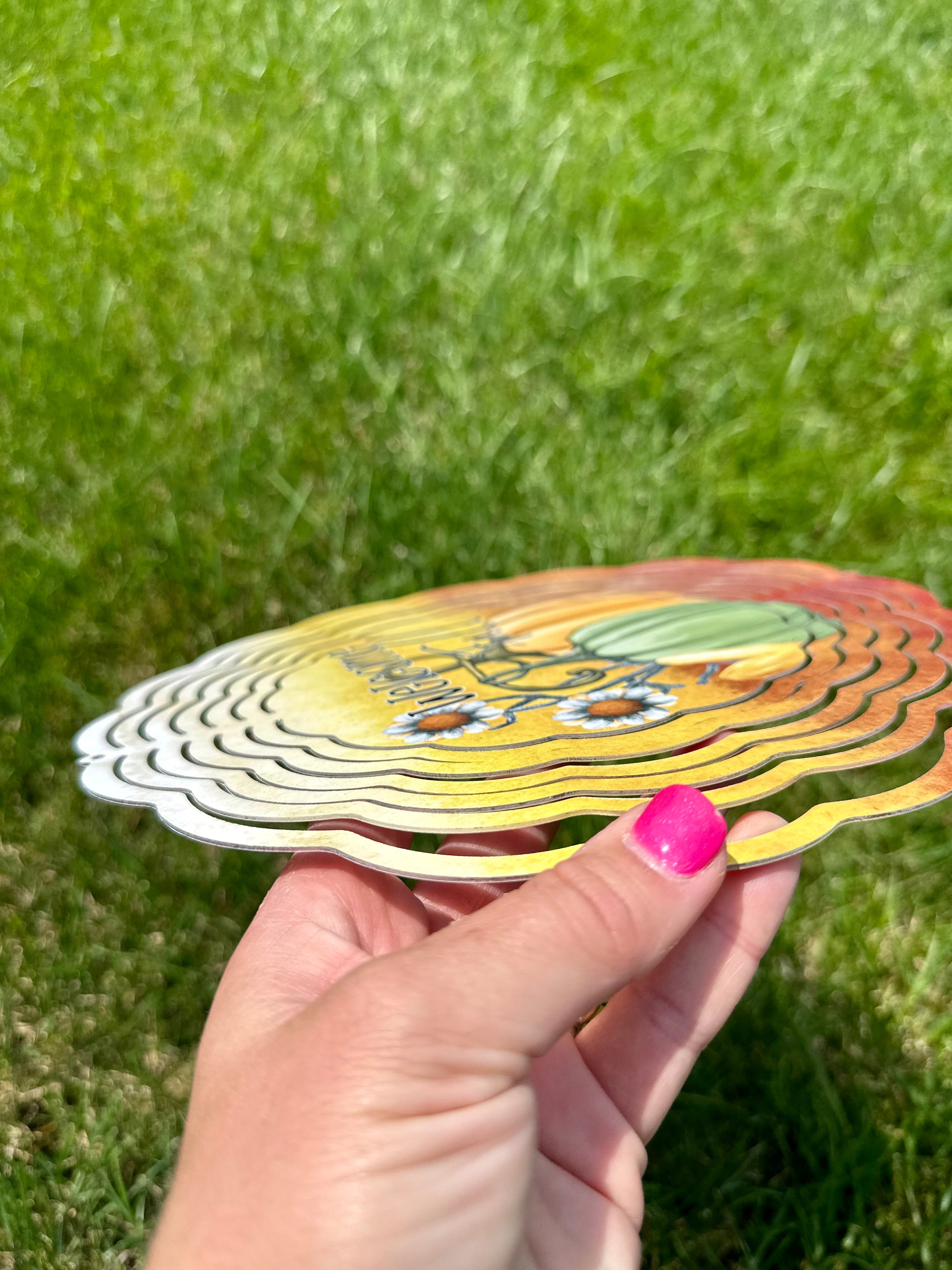 10 Inch Aluminum Double Sided Wind Spinner. Comes with Hook to hang. Ships Flat. Hold top of spinner and pull the middle towards you to fan out.