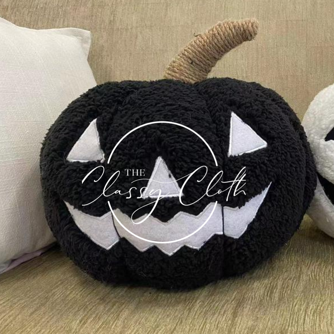 This Halloween, decorate your home with this fun and festive Sherpa pillow, featuring a spooky black pumpkin pattern. Cozy and soft, this pillow will bring the spirit of the holiday into your home.