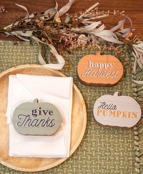 These pumpkin cutout sitters are made of wood and come in green, white and orange with text that reads, "give thanks", "happy harvest" and "hello pumpkin". The background is faded shiplap art to give it that pop of detail. Each pumpkin stands 3"H x 4"W x 1"Dp