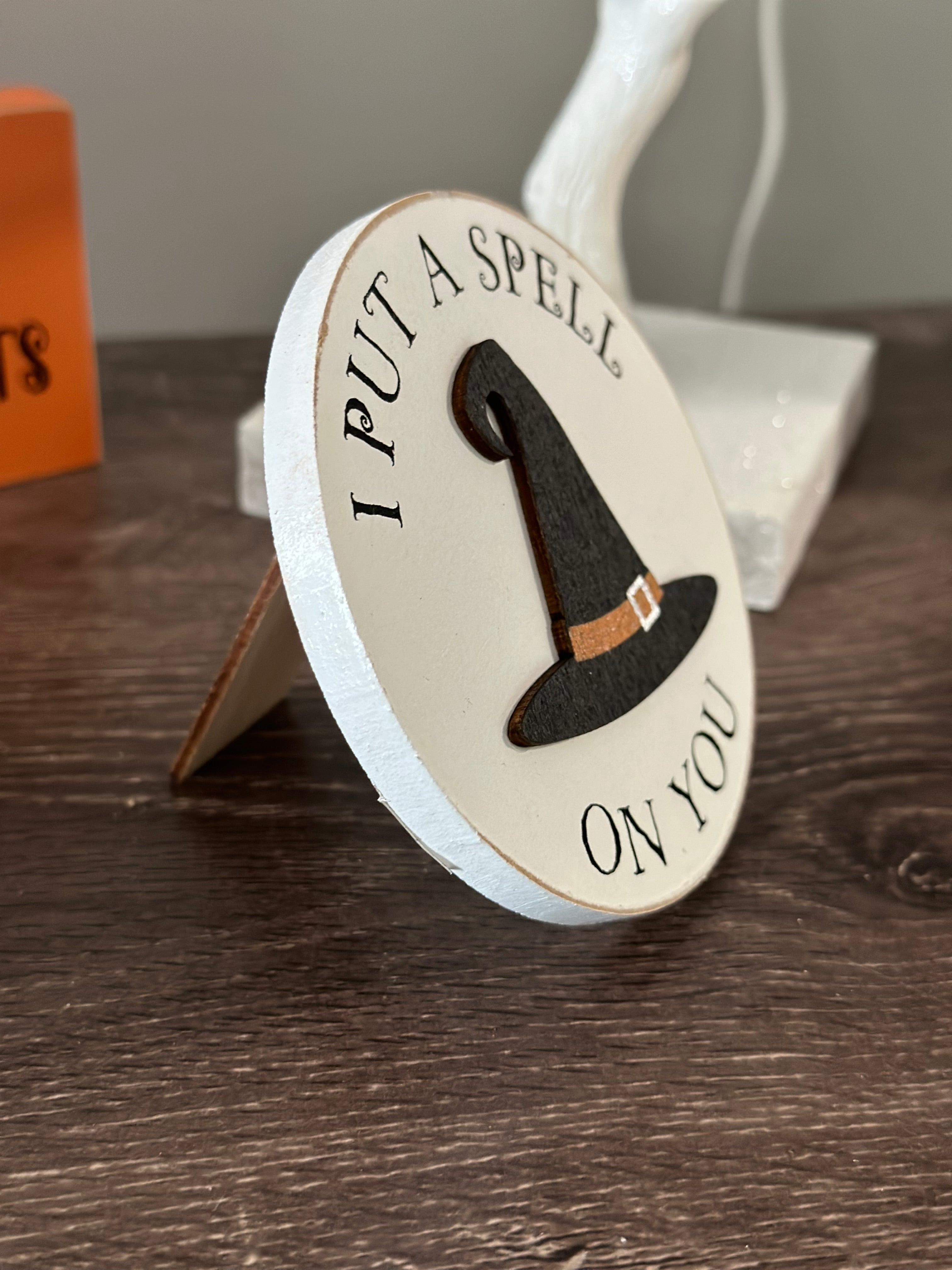 The I Put A Spell on You Circle Easel Sign will add a little magic to Halloween displays this season. This circular sign reads ‘I put a spell on you’ in black text with little spiral embellishments. It features a dimensional wooden witch hat in black with an orange hat band and silver buckle. Sign has an easel back and a D-Ring hanger for a variety of display options. This sign looks darling as part of a wall collage or paired with a few other signs and florals on a table top display. Measures 4" in diameter with a .25" depth.