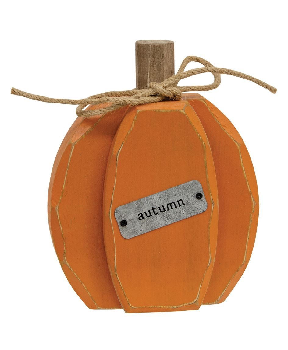 Bring warm, rustic notes to the farmhouse this Fall with the Orange Autumn Pumpkin Chunky Sitter. This sturdy wooden sitter is dimensional and has an orange finish with distressed edges. A metal plate in the center of the pumpkin reads "autumn" and the natural wood stem is tied off with a jute bow. This sitter would look lovely as part of a Fall-time centerpiece with candles and fall florals. Measures 6" high by 4.75" wide by 1.5" deep.