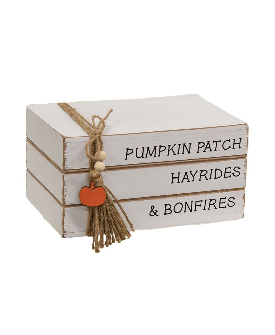 The popular book stack gets an upgrade for Autumn in our Pumpkin Patch Stacked Wooden Books. This wooden block is designed to look like three books in a stack with a white finish and distressed edges. The book spines read ‘Pumpkin Patch - Hayrides - & Bonfires.’ The stack is wrapped in a jute cord that ends in a tassel with wooden beads and a cute orange pumpkin cutout. This book stack looks darling with plush pumpkins and candles displayed around or on top.