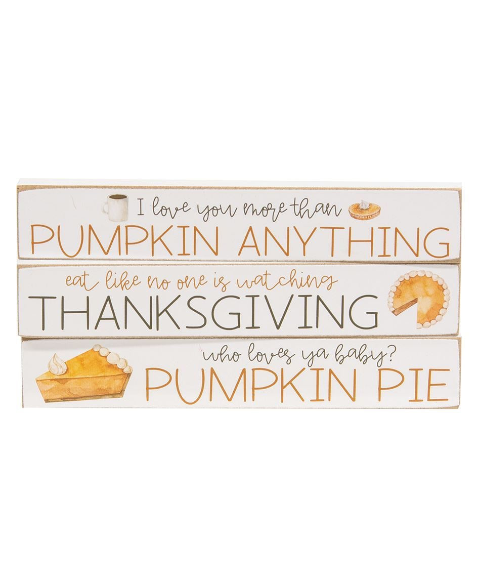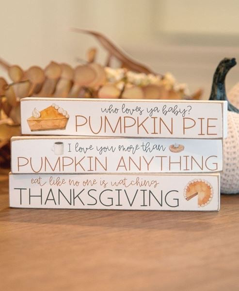 Pumpkin spice and everything nice, that’s what the Pumpkin Pie Mini Stick assortment is made of. These cute wooden blocks feature fun, watercolor style illustrations and humorous phrases in script and text. One reads ‘who loves ya baby? Pumpkin Pie.’ Another states ‘I love you more than Pumpkin Anything.’ The third reads ‘eat like no one is watching - Thanksgiving.’ Each block has an illustration of pumpkin pie and a white background with lightly distressed edges. These sticks make easy additions to shelves, trays and tabletops. They look lovely with Fall florals, pumpkins and candles. Blocks measure 1" high by 6" wide with a .5" depth.
