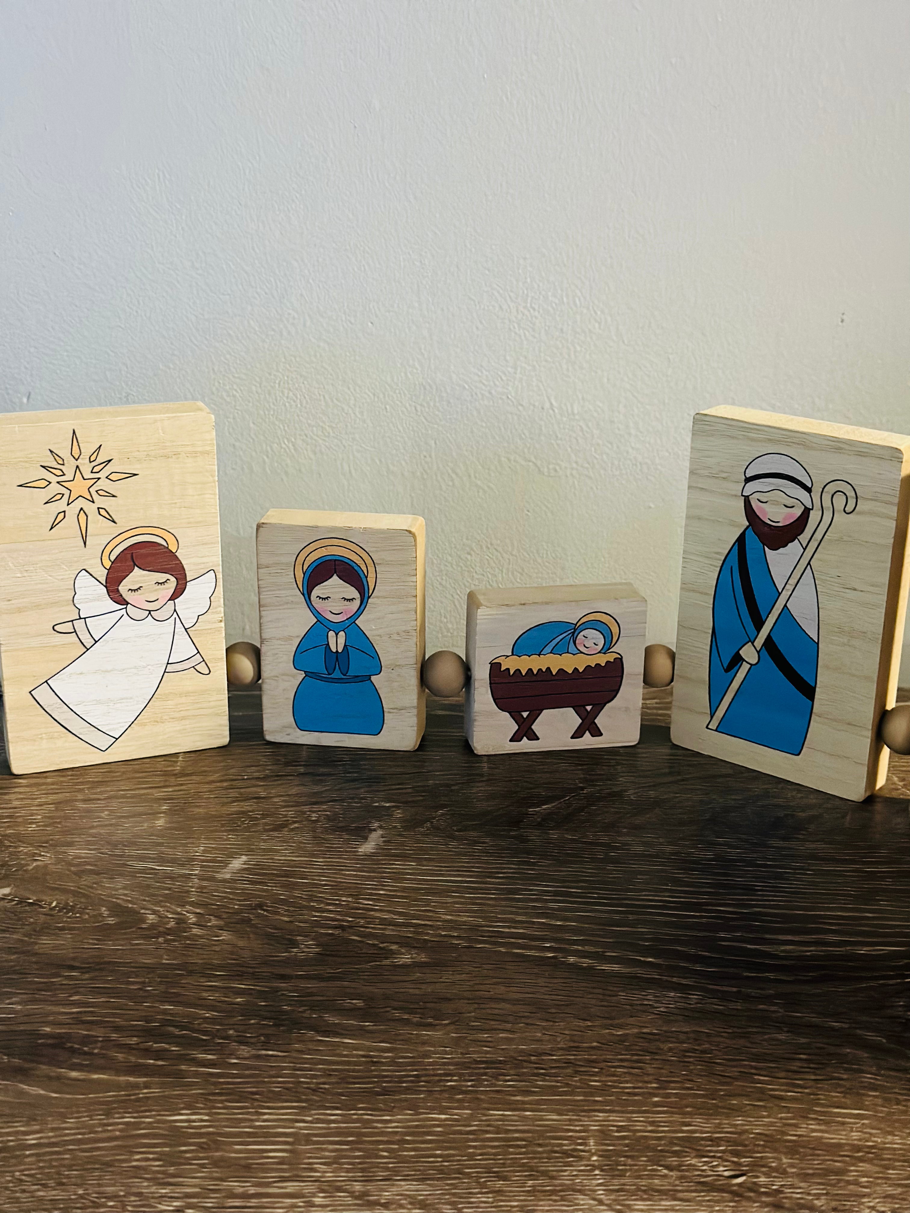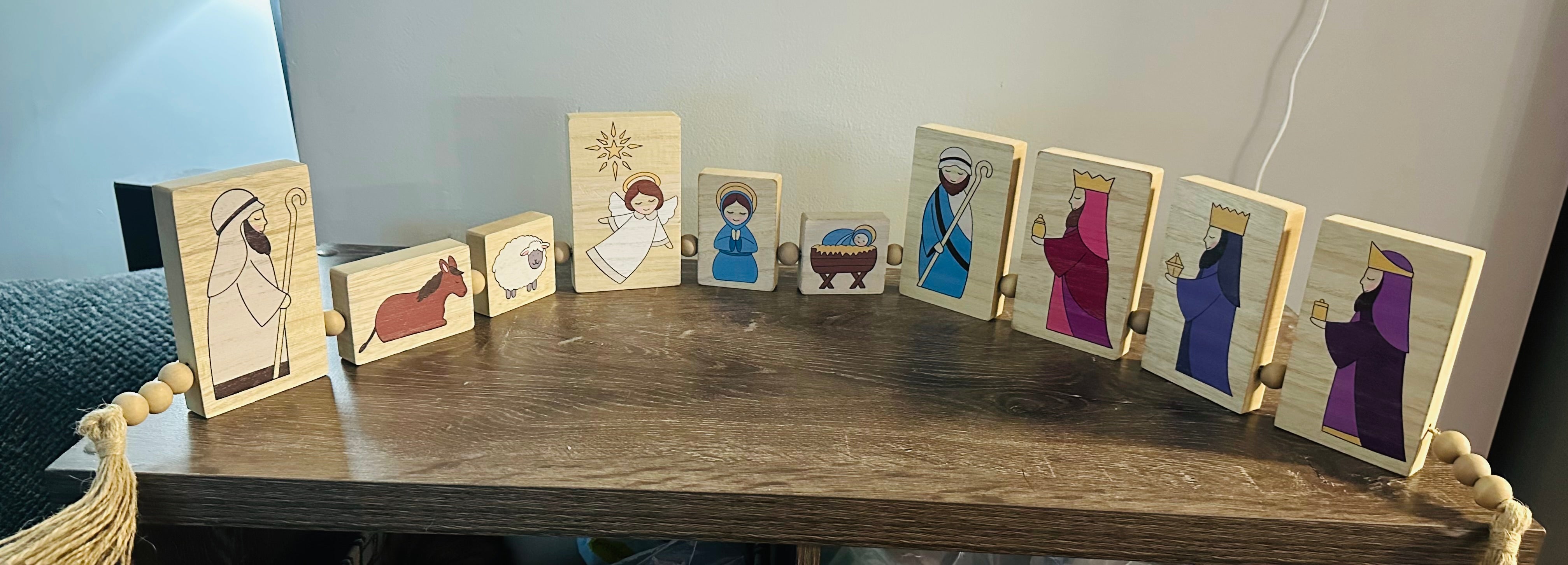 • Wood Christmas Table Top Nativity Block Sign, with Scripture printed on the back