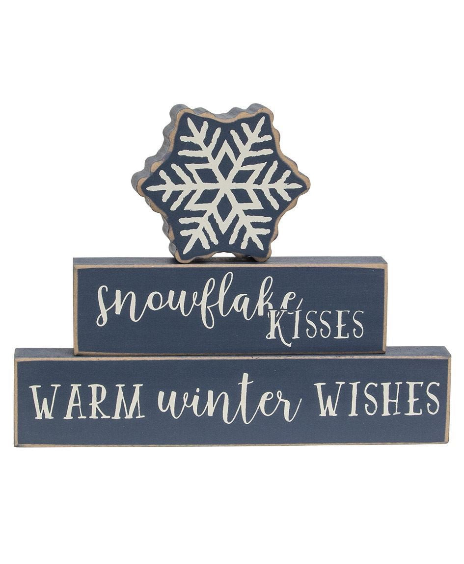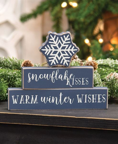 Bring whimsical Winter wishes to the farmhouse with the Snowflake Kisses Stacking Blocks set. Sporting a dark blue finish with distressed edges, this block set features a snowflake sitter with two sign blocks. The blocks are solid wood and have a .75" depth. The sitter has a 2.75" diameter and a lovely white snowflake on dark blue. One block reads ‘Snowflake kisses’ in white script and text and measures 1.5" high by 5" wide. The second sign block reads ‘Warm winter wishes’ in white and measures 1.5" high by 7" wide. Display this set together or individually and pair with frosted florals, twinkle lights, and a bead garland for a pretty arrangement.