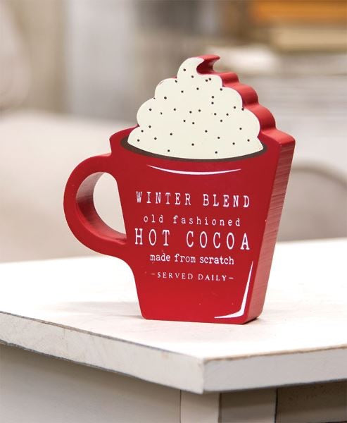 The Winter Blend Hot Cocoa Chunky Cup Sitter's cheery red mug of cocoa topped with whipped cream will have family and friends asking for the real deal. The sturdy, wood sitter is designed to look like a red mug with 'winter blend, old fashioned, hot cocoa, made from scratch, served daily' lettered on the front. The whipped cream on top is detailed with chocolate sprinkles. Measures 6" high x 4.75" wide by 1.75" deep.