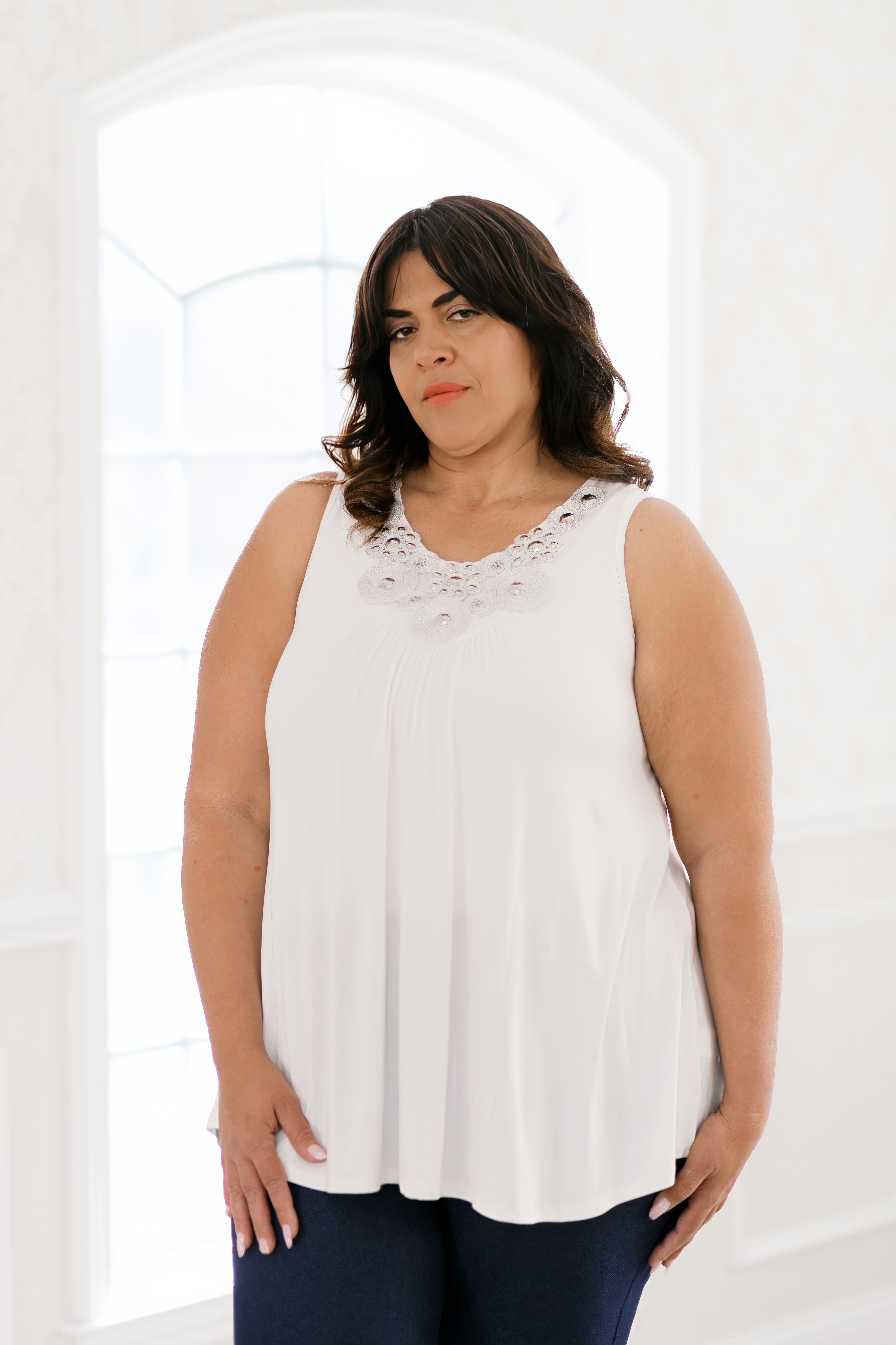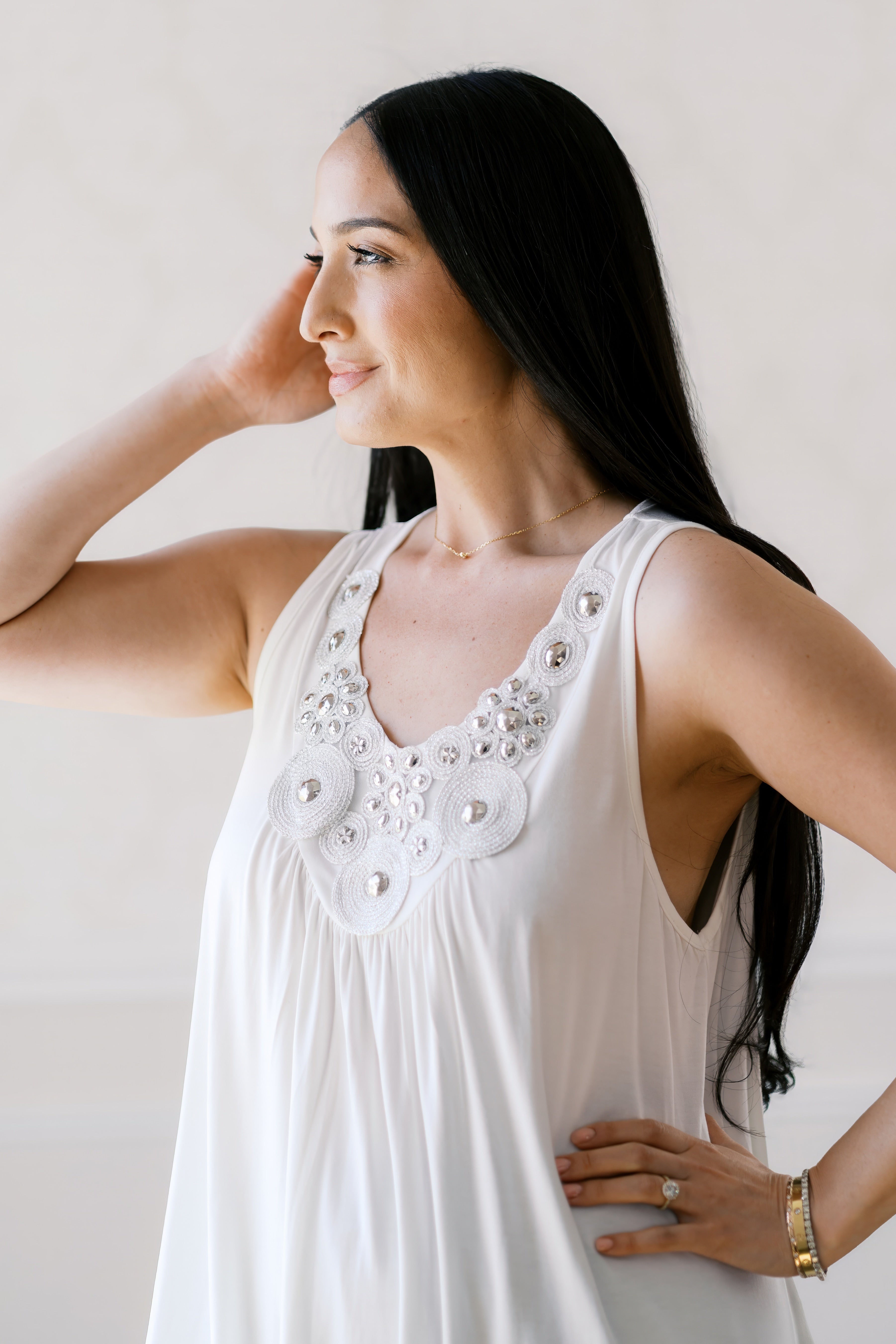 Sparkle and shine in our Starlit Sparkle Tank! The LUREX beaded neck trim adds an extra touch of elegance, while the solid jersey tank top ensures a comfortable fit. Perfect for any occasion, this tank is sure to make a statement with its unique and playful design.