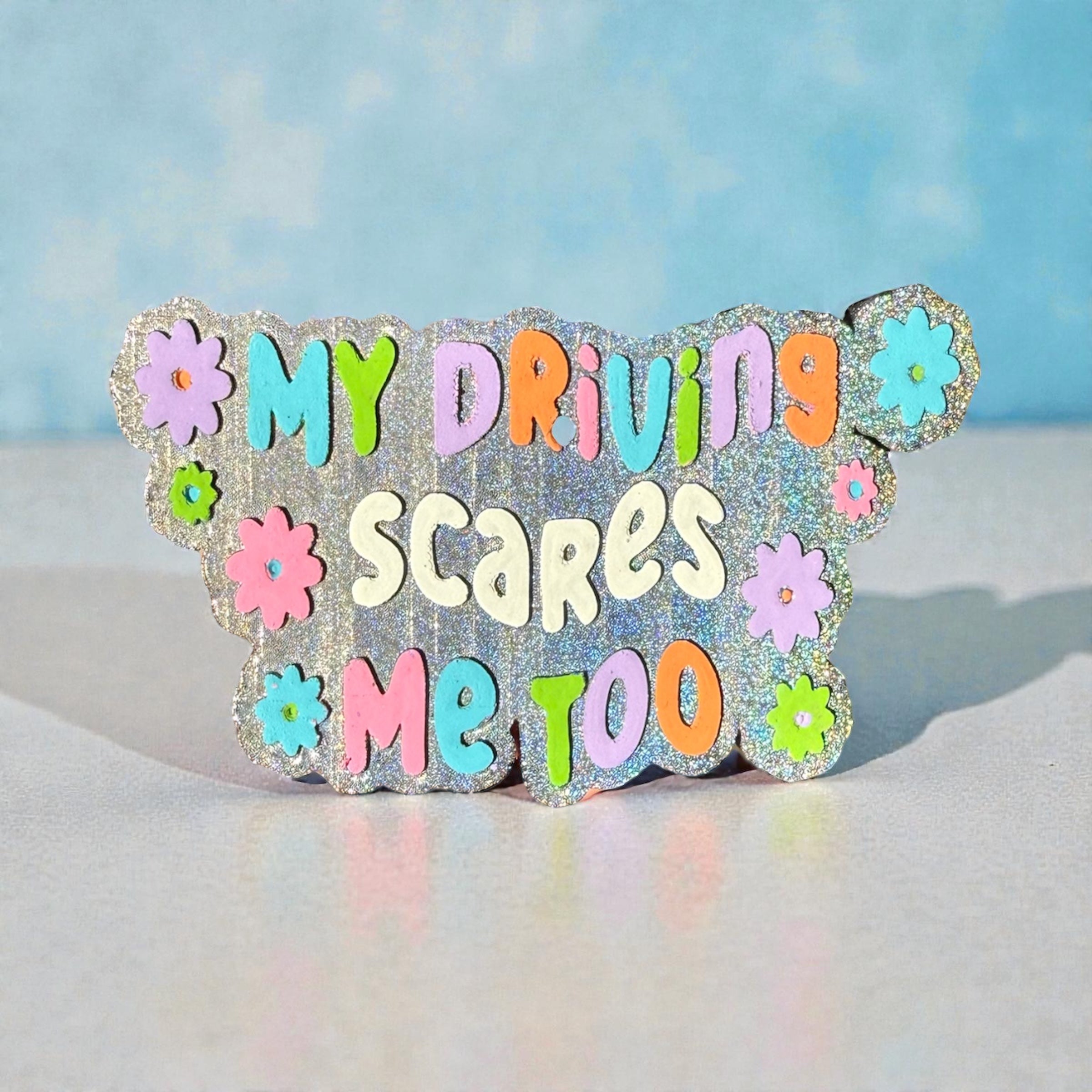 Laugh out loud with this hilarious freshie that gets it—"My Driving Scares Me Too!" Featuring a fun holographic glitter design that catches the light, it's the perfect conversation starter for your car, home, or as a gift for that friend who needs a good chuckle. Self-aware humor meets long-lasting fragrance in this playful pick. Available in all our signature scents, because even nervous drivers deserve to smell amazing!