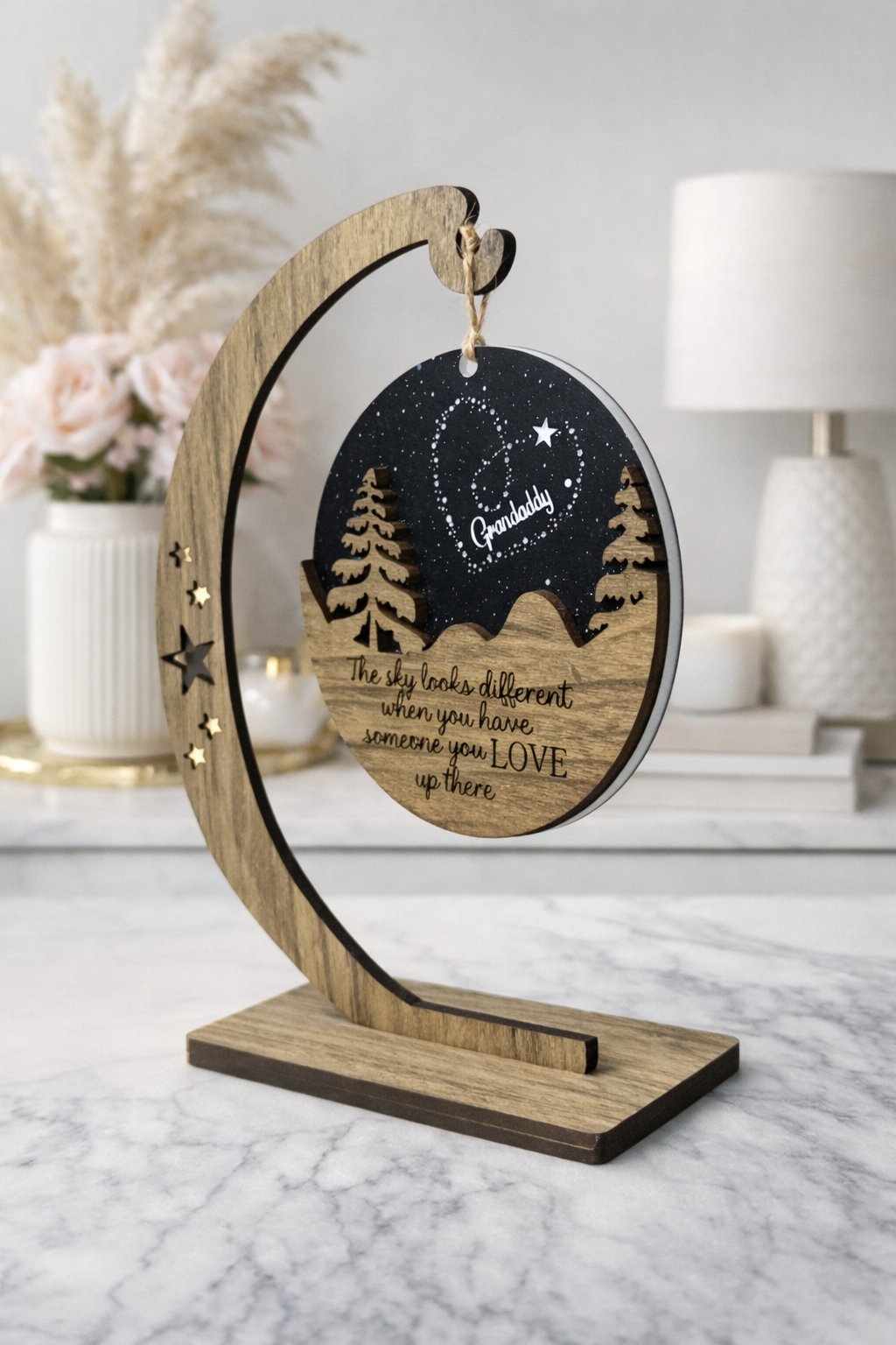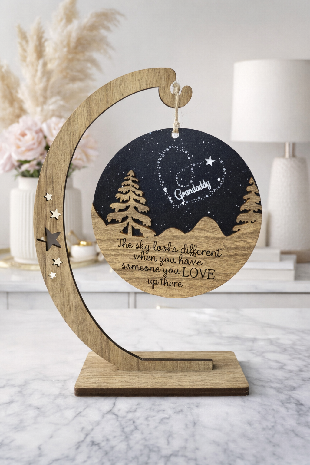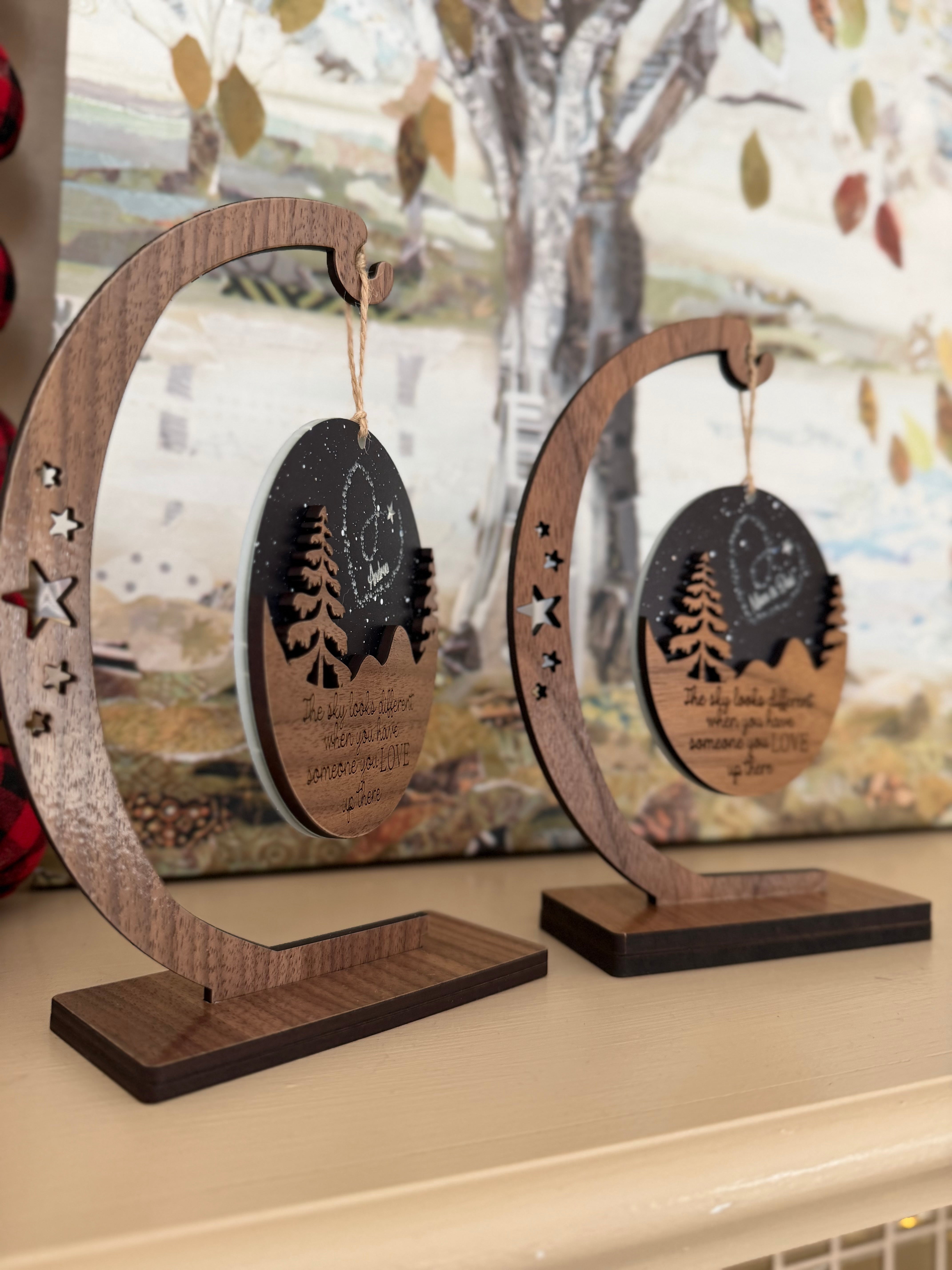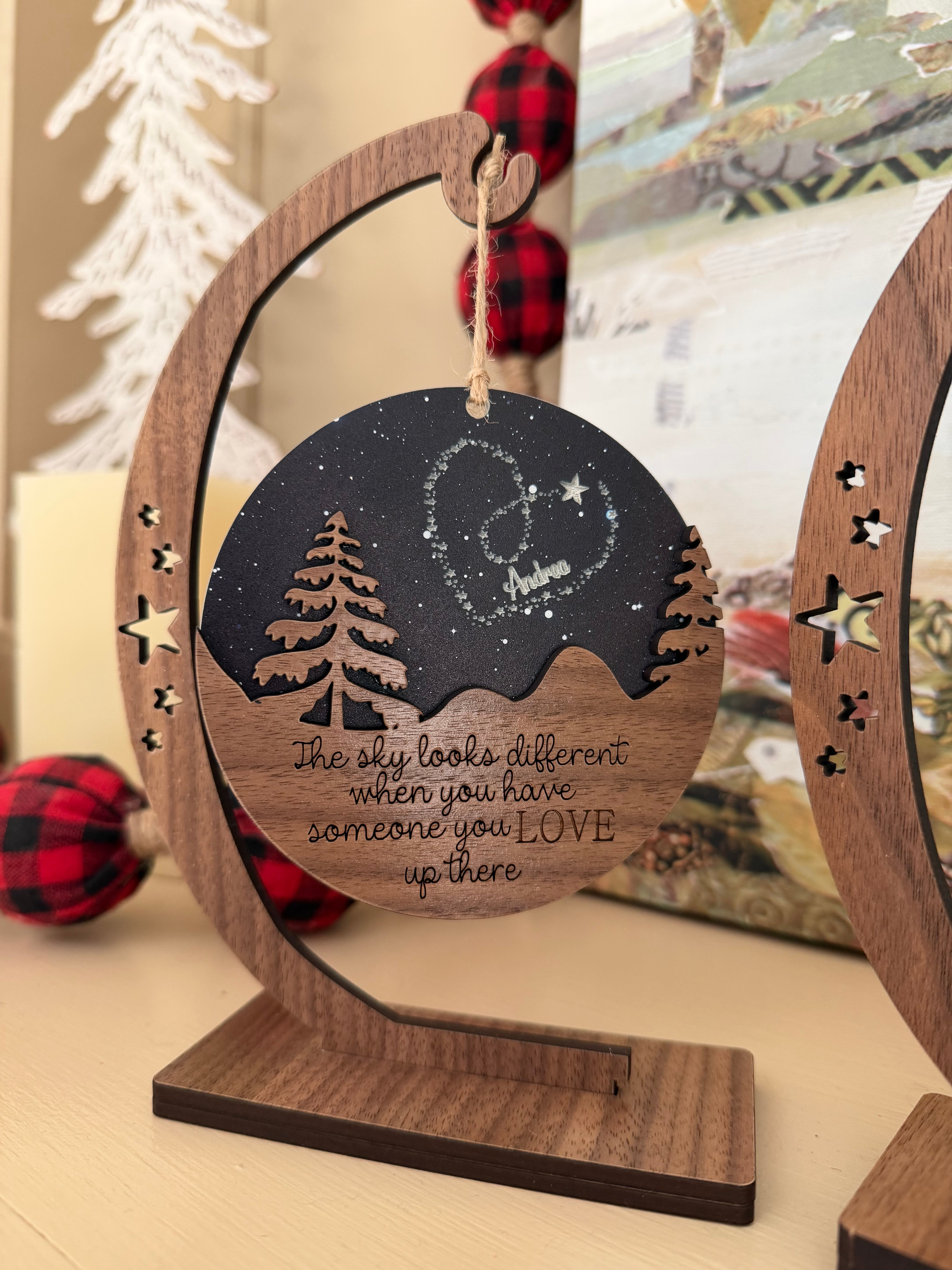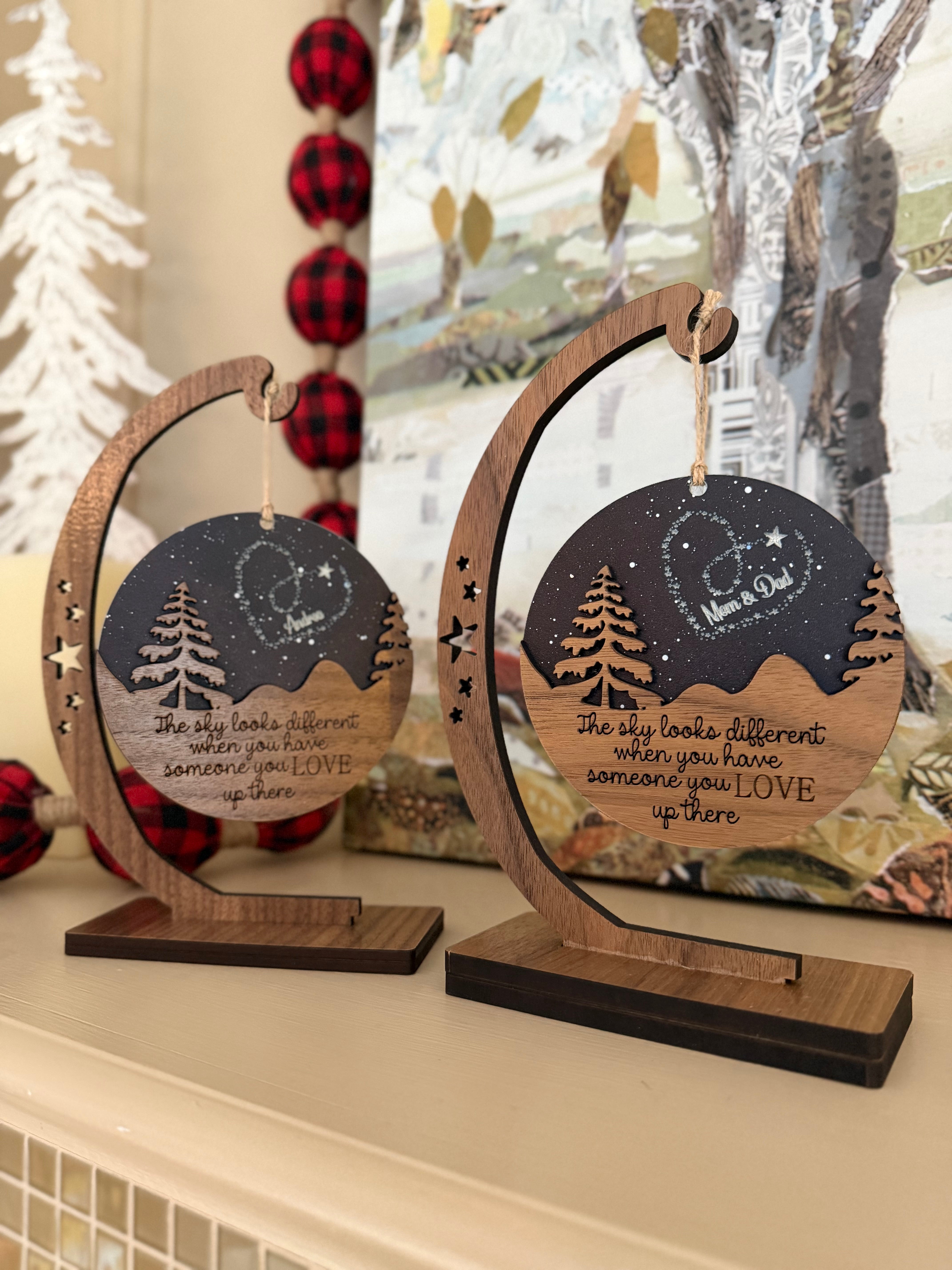 A simple and elegant way to honor and remember those you love. This memorial ornament features a beautiful starry sky design paired with natural wood details, creating a timeless keepsake for any space.