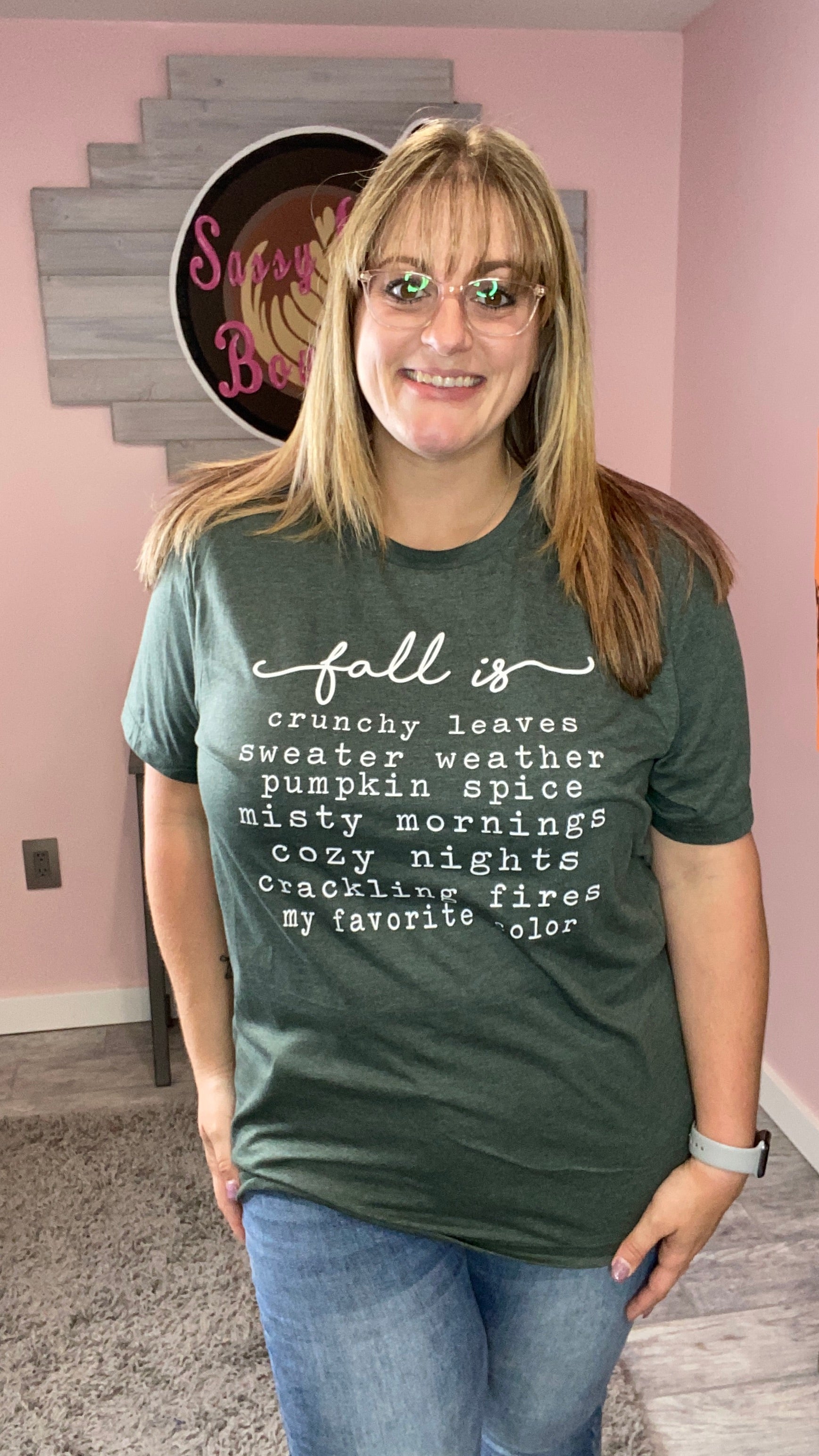 These are all the things I love during Fall!! This is a heathered forest, unisex Bella Canvas Tee. I can wear a large or XL.