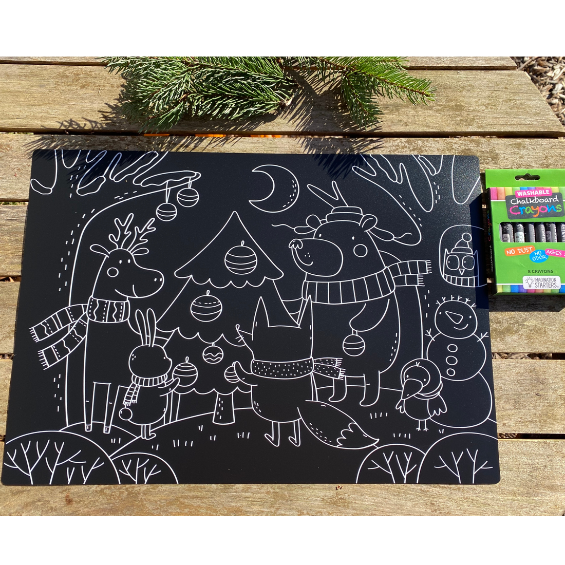 Whether its snowing outside or balmy these adorable animals will put you in the holiday spirit! All of our placemats can be used with chalk, dustless chalk, chalk crayons or Imagination Starters Chalkboard Crayons. To clean, just wipe off with a wipe. Each mat measures 12"x17" and has forest friends printed on one side and is blank on the other.