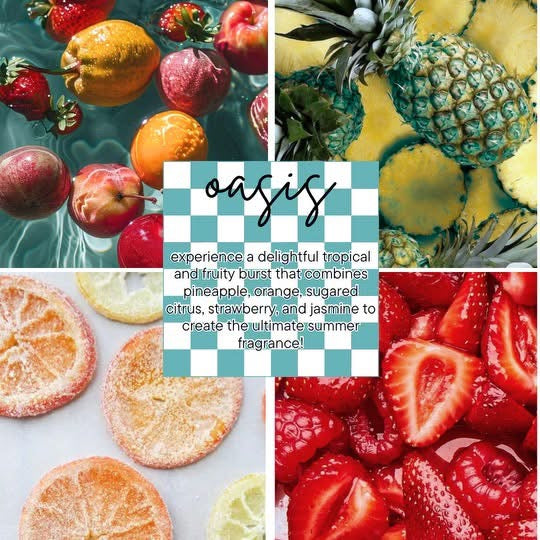 Oasis - experience a delightful tropical and fruity burst that combines pineapple, orange, sugared citrus, strawberry and jasmine to create the ultimate summer fragrance.