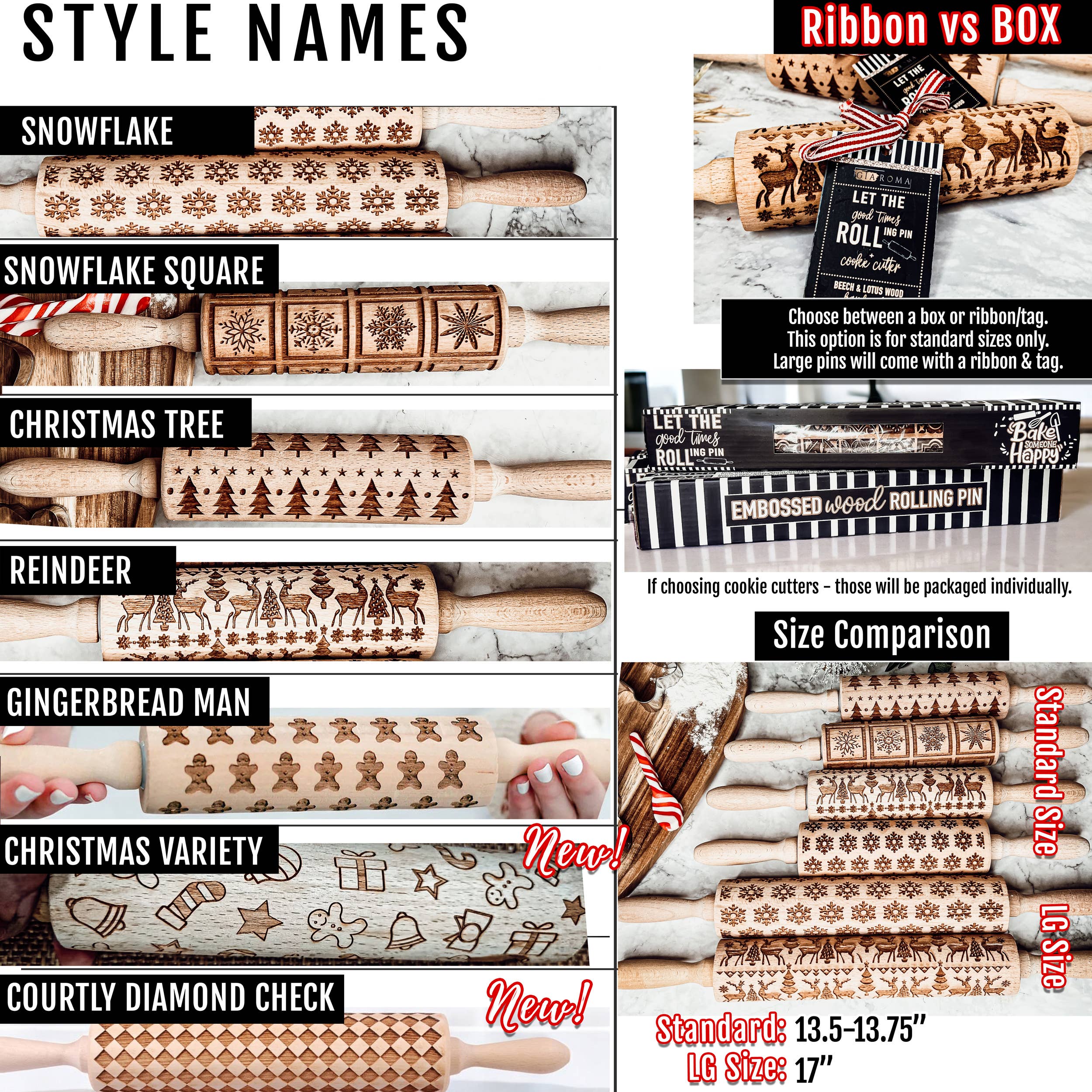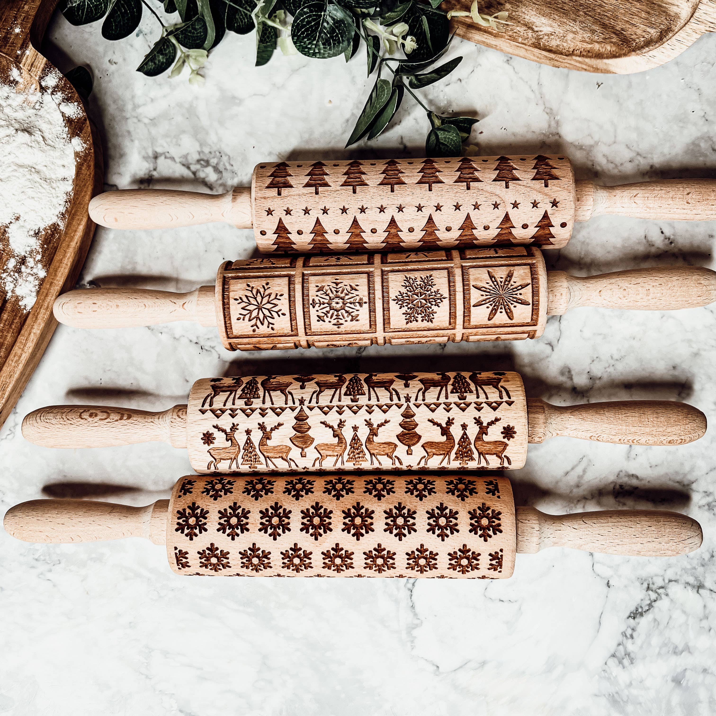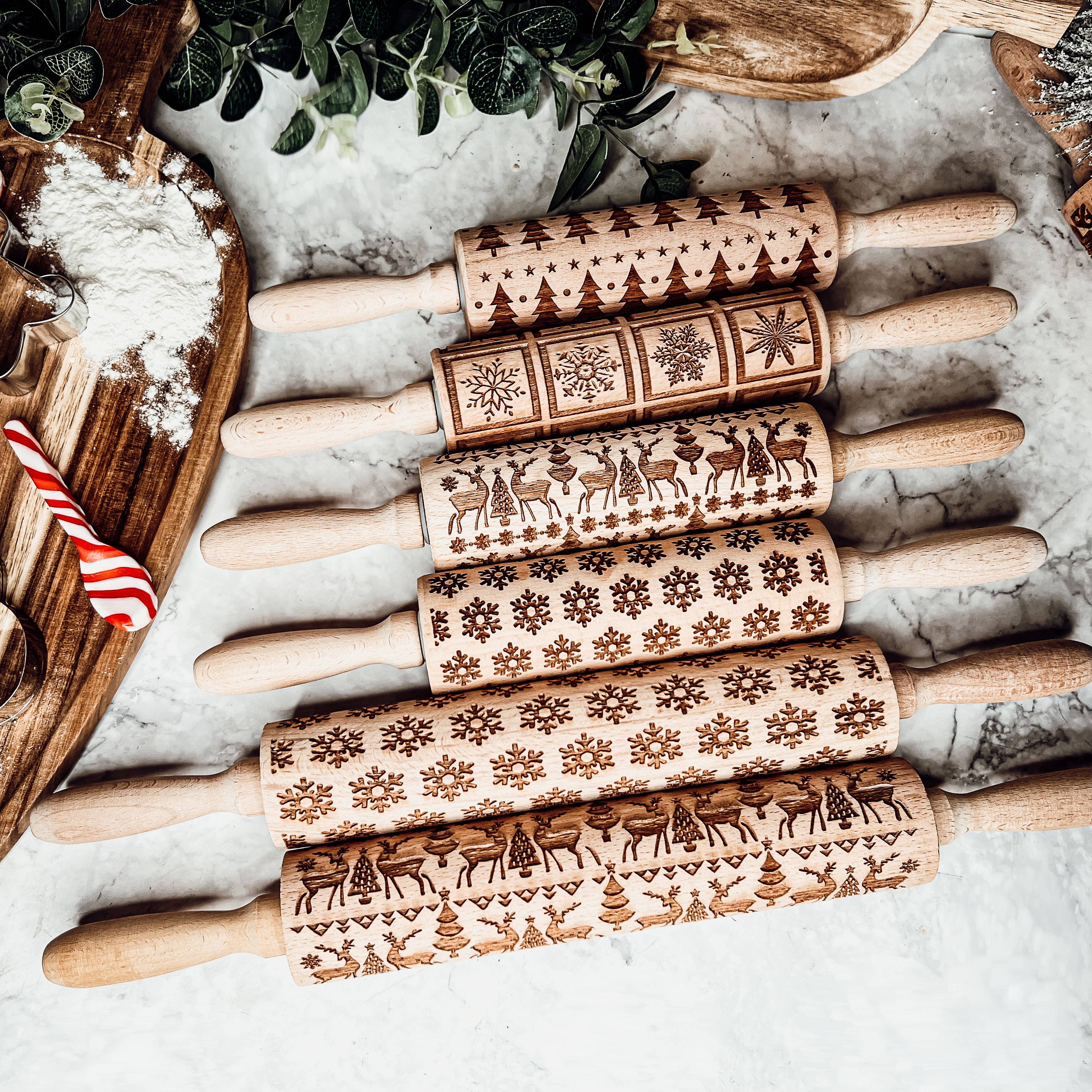 Each rolling pin is embossed with a fun holiday design perfect for cookie making!