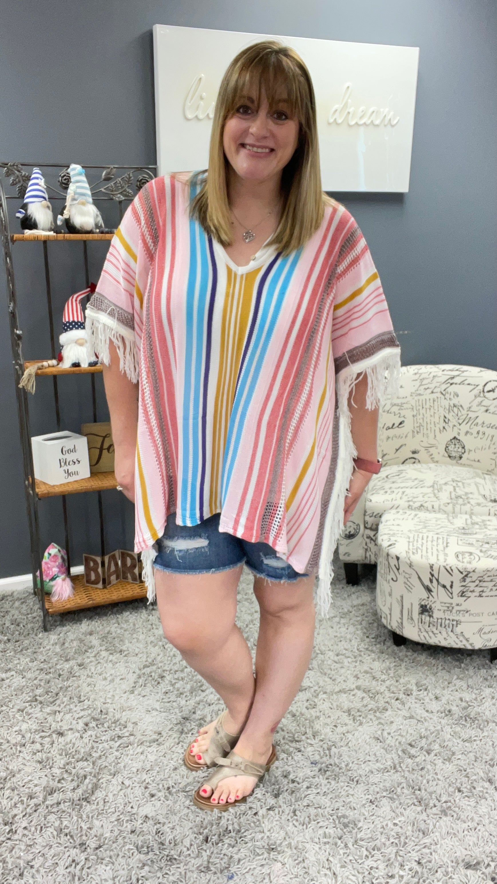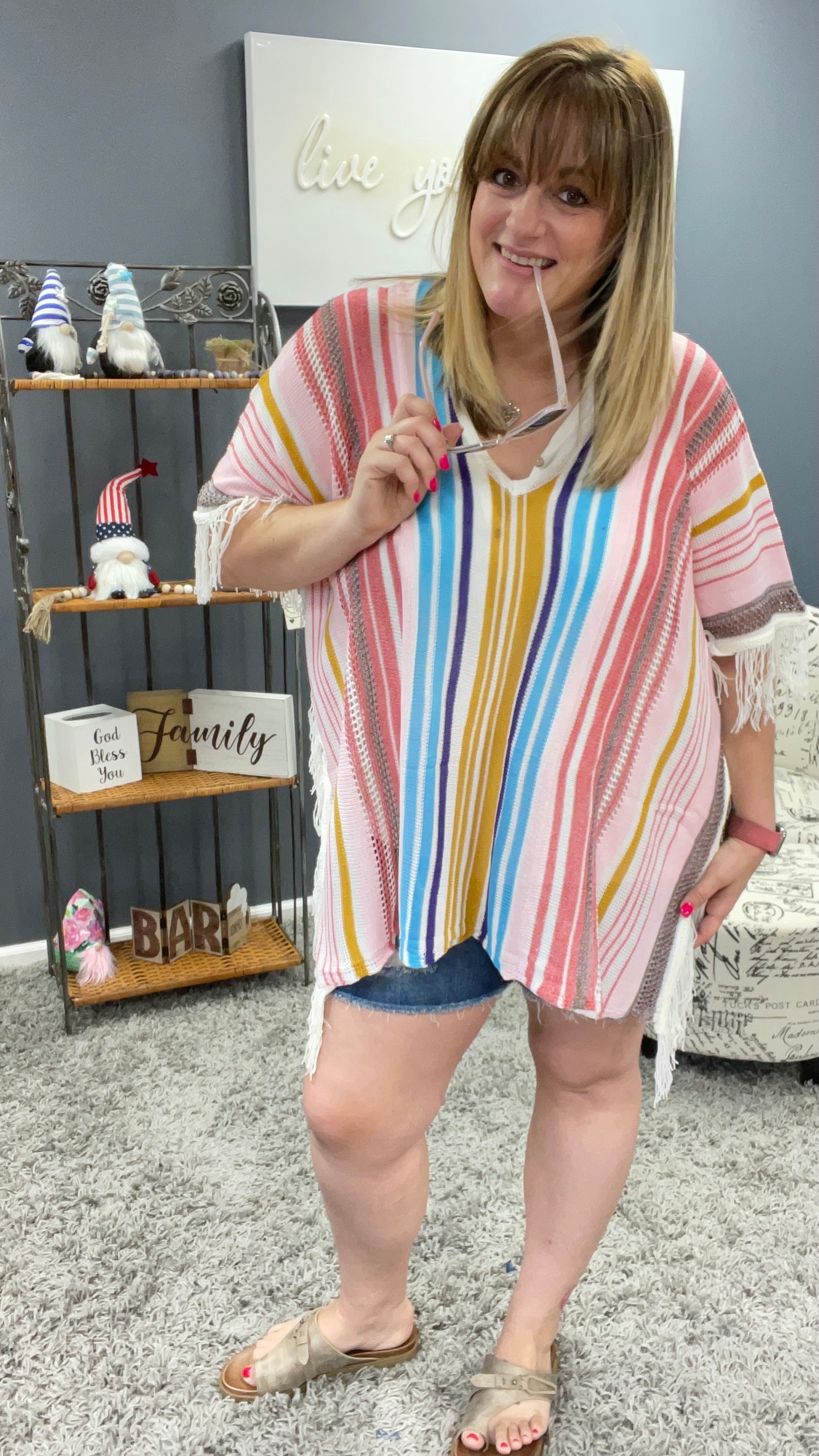 This fun striped multi-color bohemian style beach cover-up is such an amazing choice for any spring and summer vacation! We love the classic blue, purple, pink, mustard, and mixture of grey and burgundy paired with a knitted design. This Poncho style cover up features cute tassels and fits up to size 22. This super lightweight fabric will be your new best friend. Throw this on before any day at the beach or pool for the perfect cover-up!