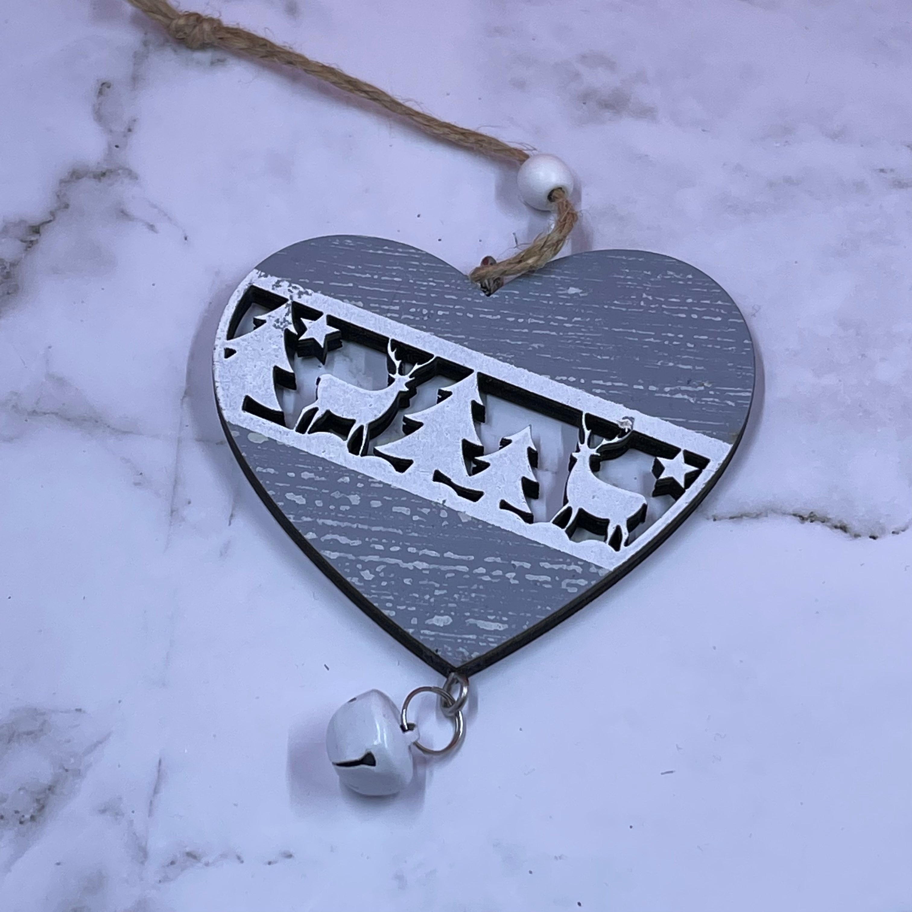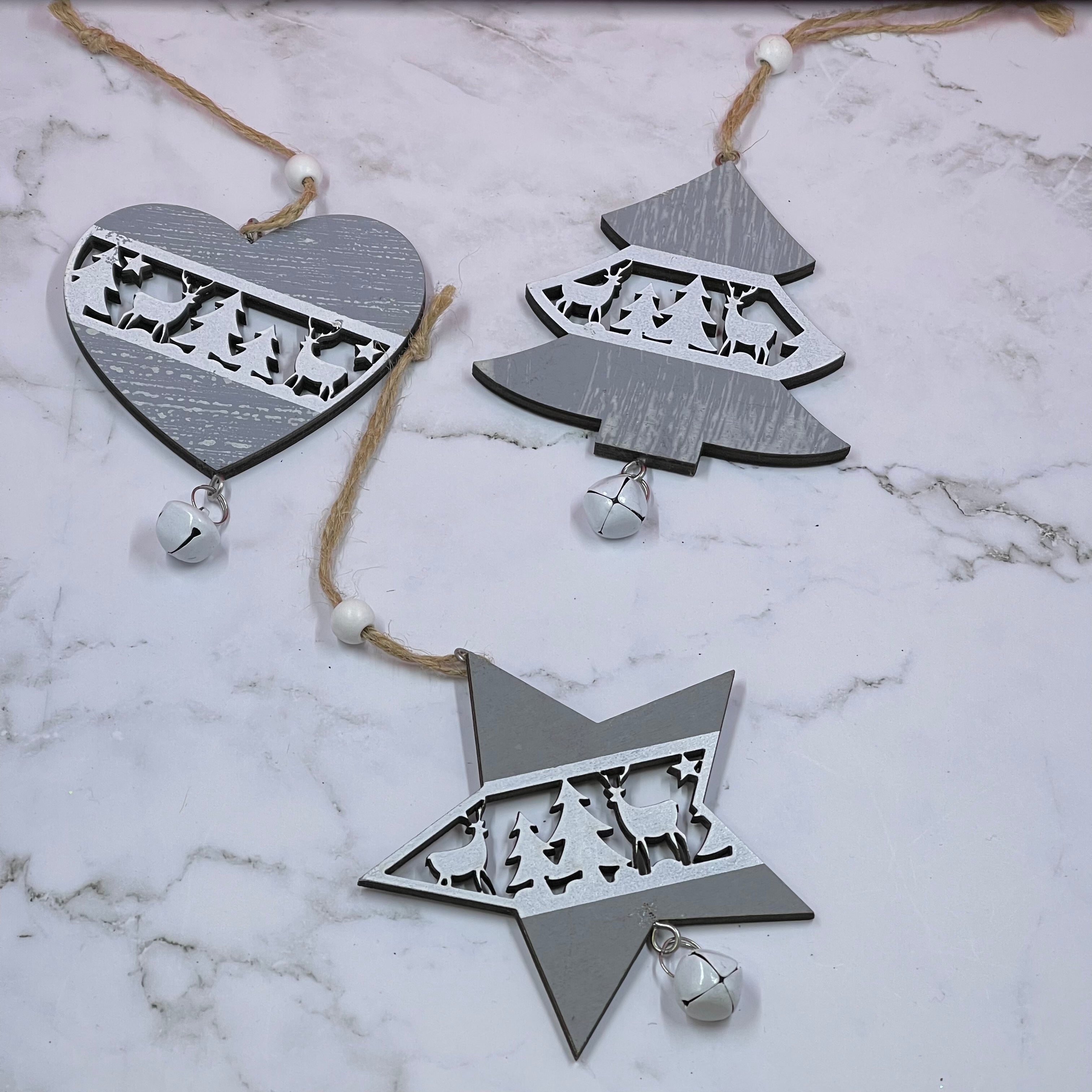Each ornament comes with a twine string with a bead for hanging and a bell at the bottom.