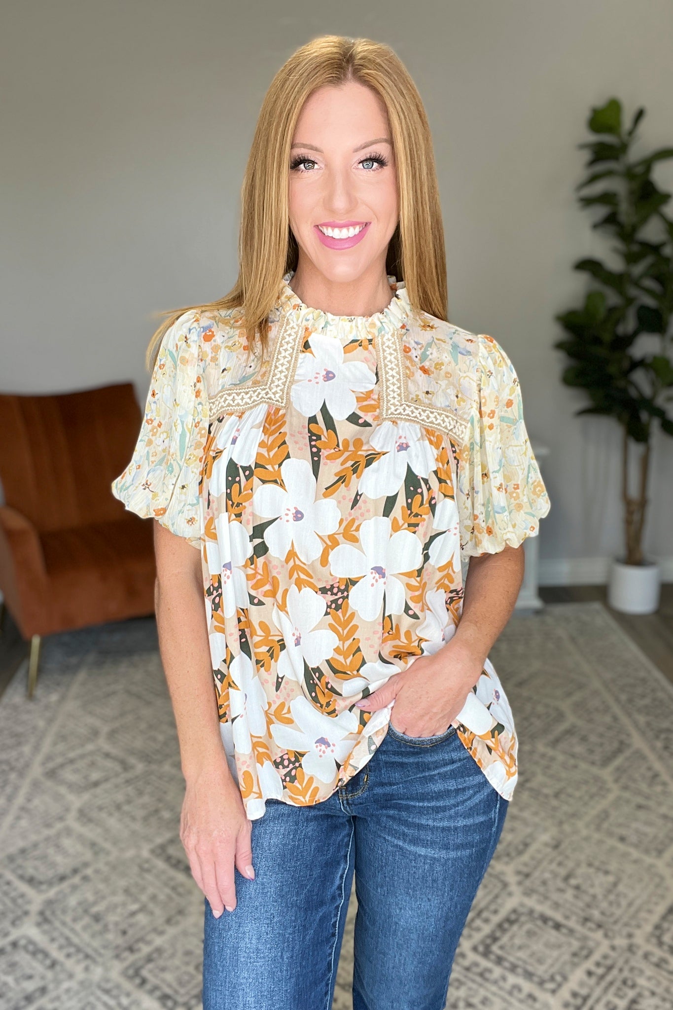 Look stylish and comfortable in the Daydreamer Mixed Floral Top! This top is designed with woven chiffon fabric, crocheted edging, a lined puff sleeve, and ruffle detail. It fits comfortably and is detailed with a keyhole button closure. A perfect choice for any occasion.