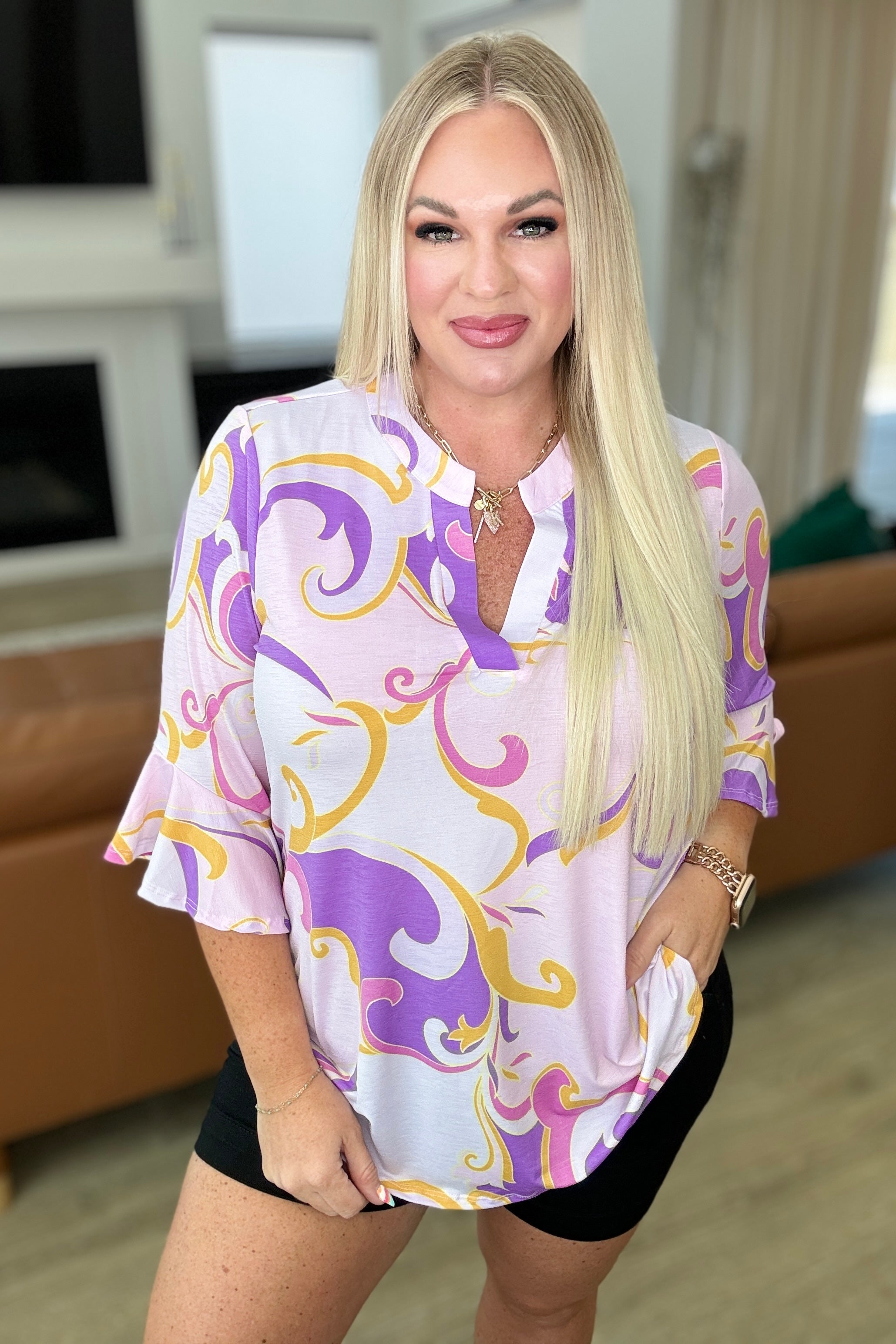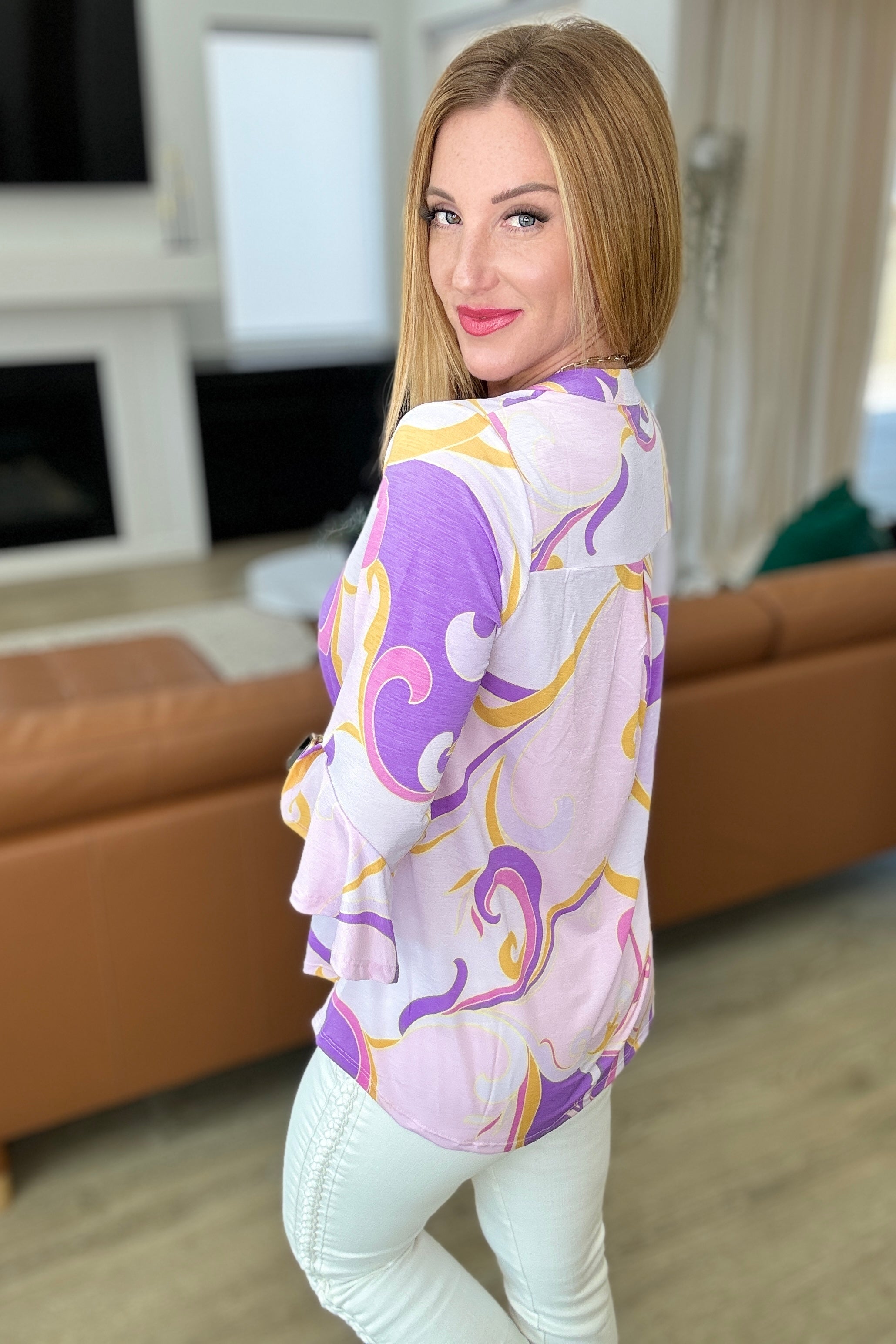 Upgrade your wardrobe with our Lizzy Bell Sleeve Top. Made with easy-to-wear Bulgari fabric, the Lizzy v-neckline and 3/4 length bell sleeves provide both comfort and style. Stand out with the cutest print and make a statement wherever you go.