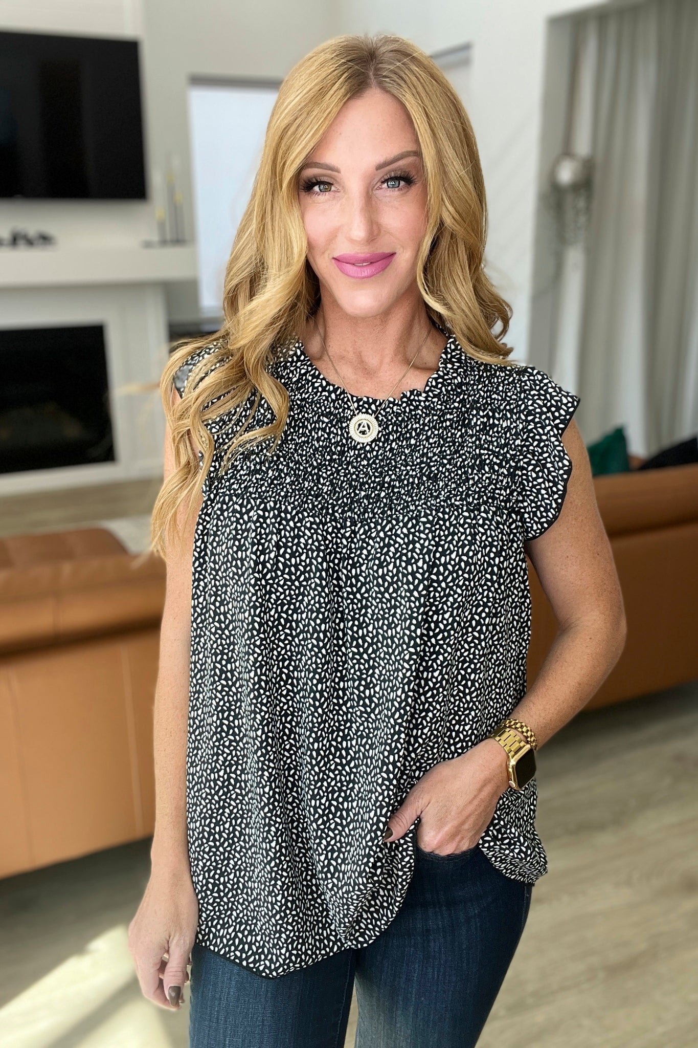 Look stunningly stylish with this Not So Conventional Cap Sleeve Top! Its smocked elastic detail, mock neckline and flutter sleeve give it a cool, modern look, while the small scale print adds a touch of class. Be the envy of all with this fashion-forward top!