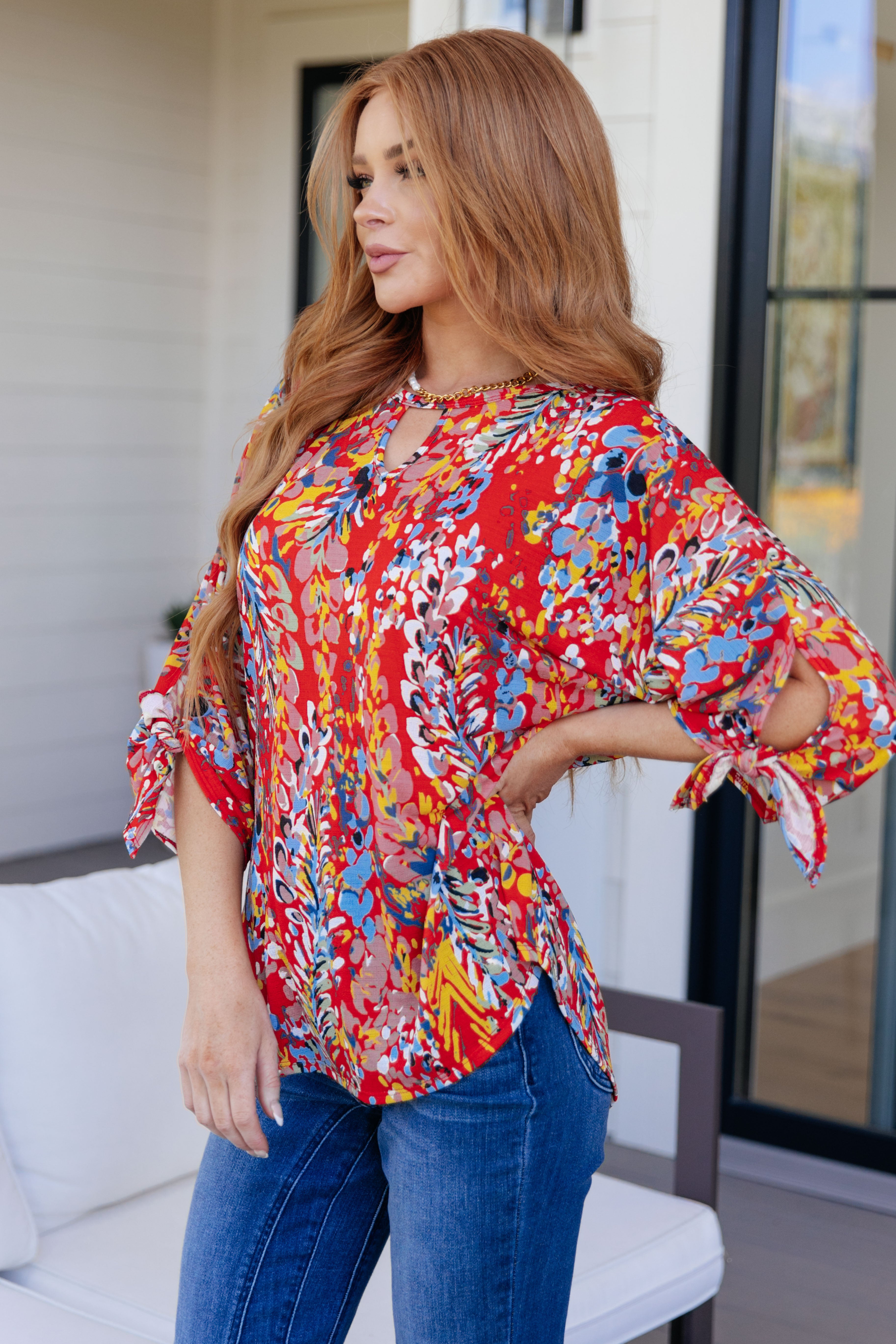 This Not So Silly Keyhole Neckline Blouse is a vibrant must-have! The water color floral print brightens up any wardrobe and the keyhole neckline cutout and self tie sleeve detail provide an unexpected, playful touch. Enjoy a unique, fashionable look that will end up a wardrobe fav!