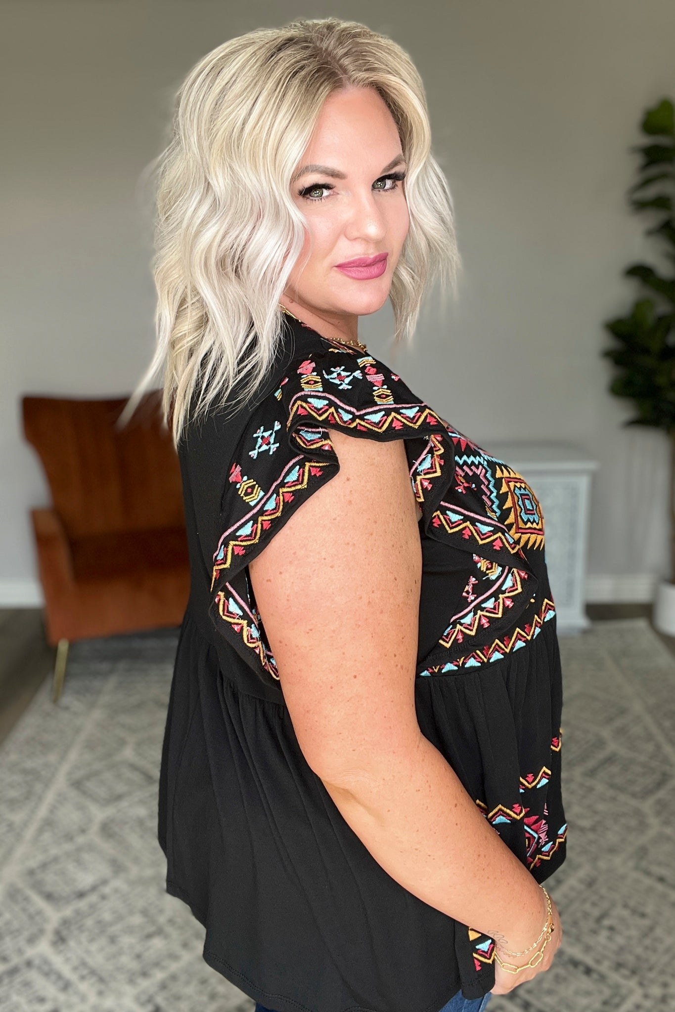 Feel beautiful and confident wearing the Sophia Embroidered Blouse. This stylish design features a v-neckline, soft jersey knit, and flutter sleeves that are adorned with delicate true embroidery. A peplum hem finishes off this stunning look, making it perfect for any occasion. What are you waiting for? Get your hands on this showstopper!