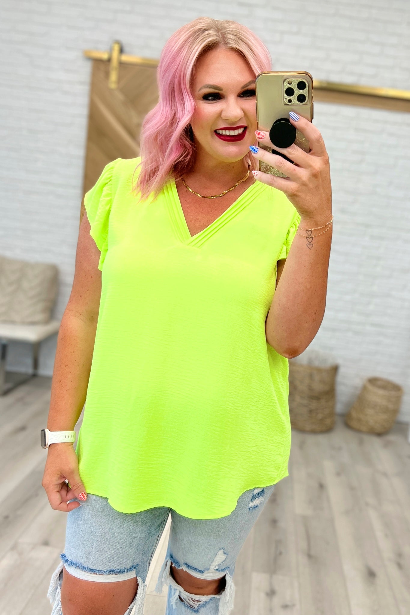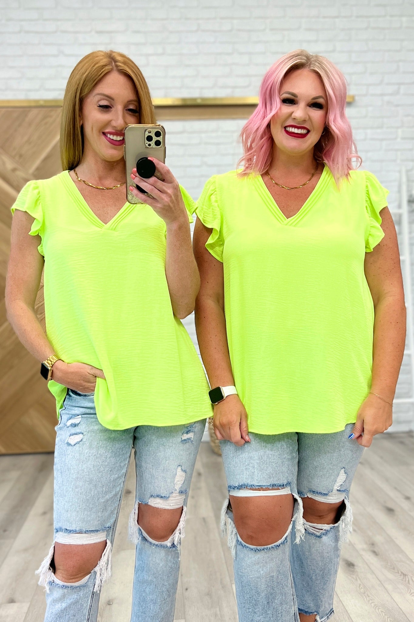 Enjoy a bright and fun night out with the daring Under Neon Lights Ruffle Sleeve Top! Featuring a bold neon yellow-green hue and ruffle sleeves, this top will have all eyes on you. With a pleated v-neckline, you'll be ready to light up the night! What are you waiting for? Let's go!