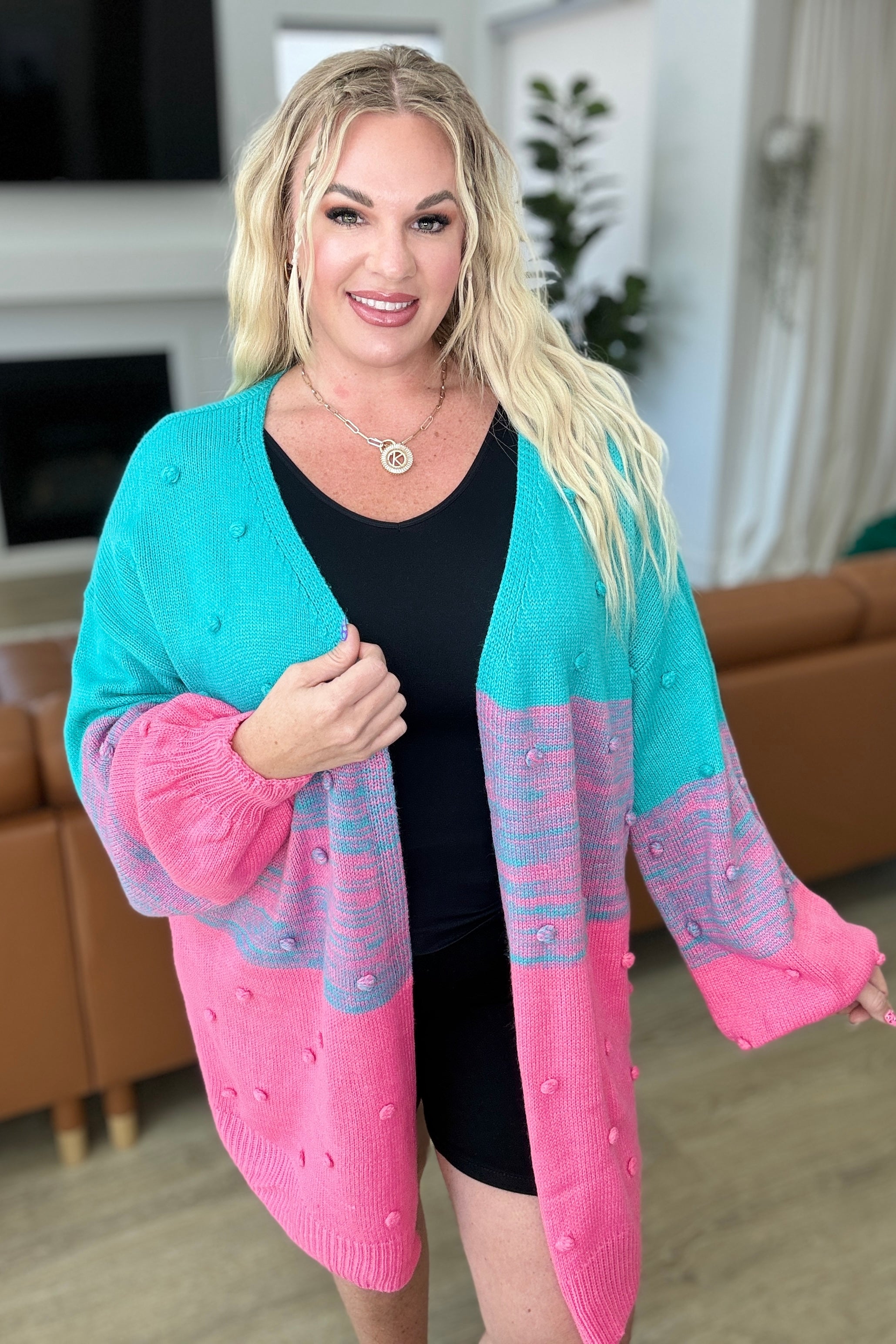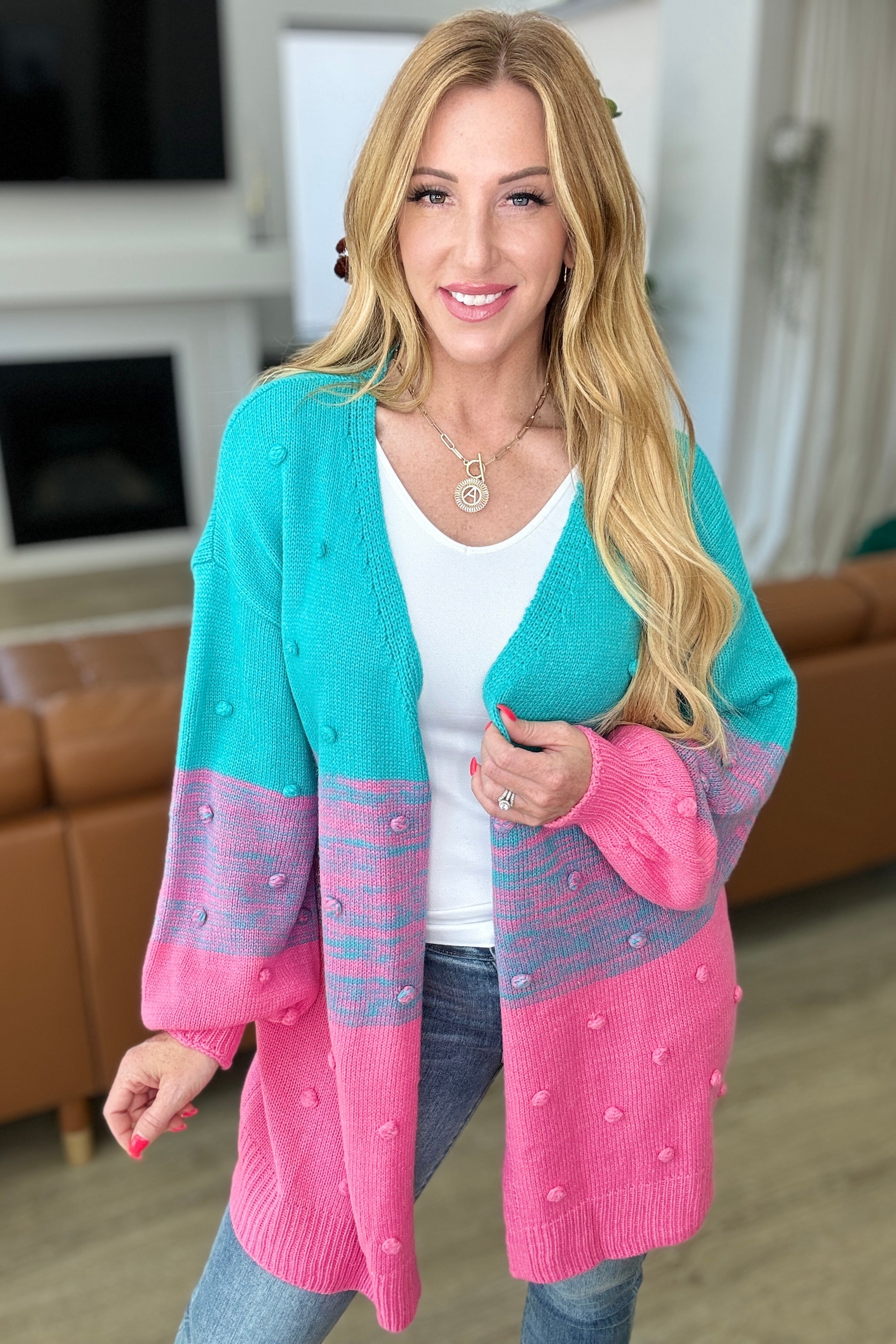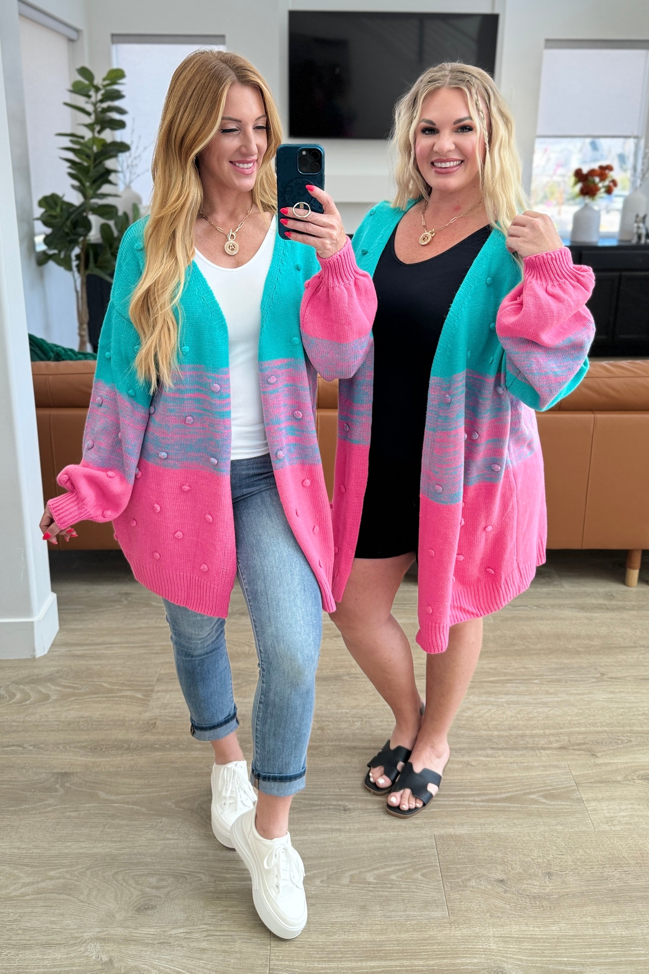 Stay cozy and stylish with our When We're Grooving Open Front Cardigan. The relaxed fit and ombre stripe add a touch of effortless cool, while pom pom accents and balloon sleeves elevate the look. Perfect for any occasion, this cardigan is a must-have for your wardrobe.