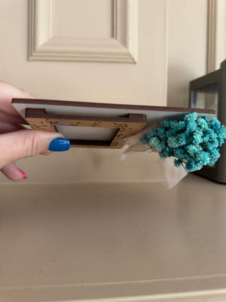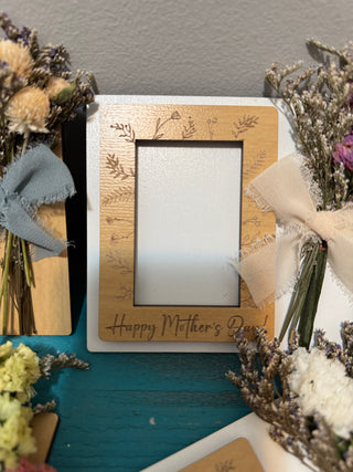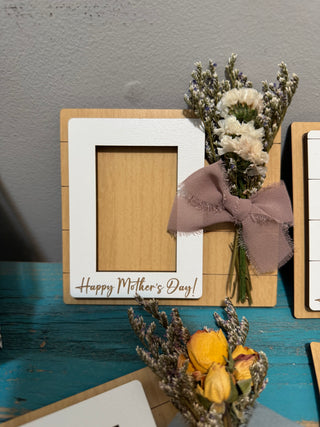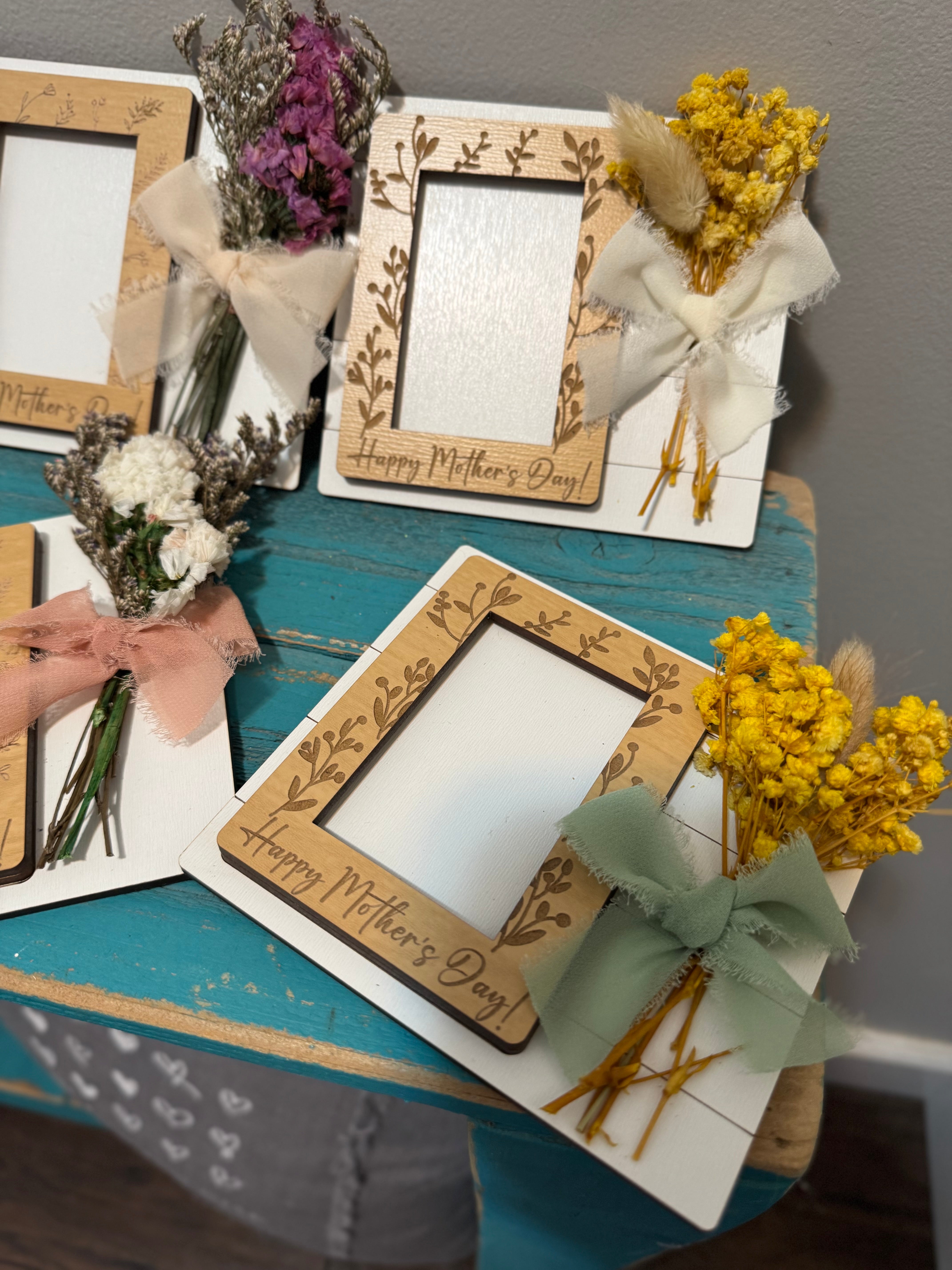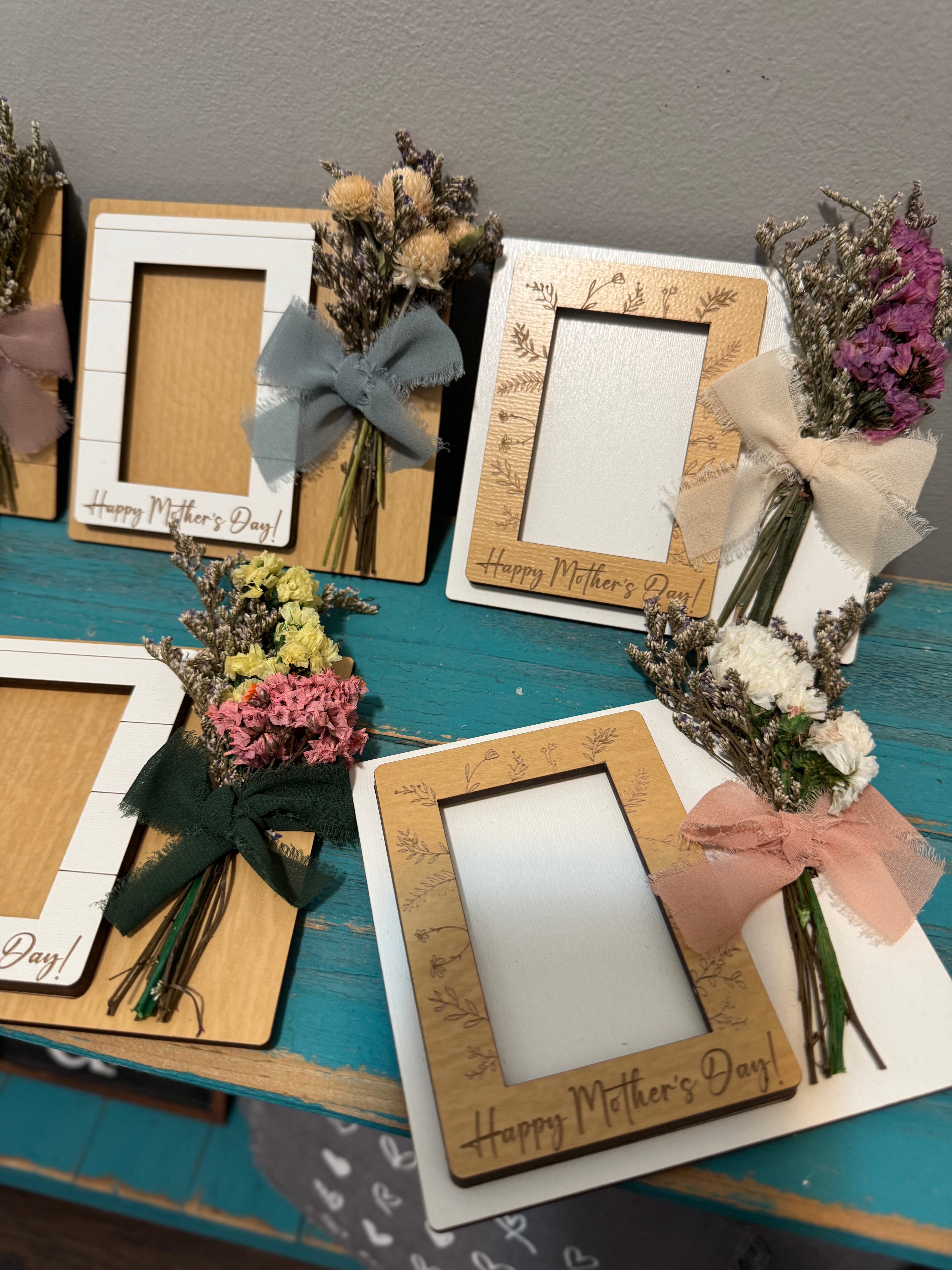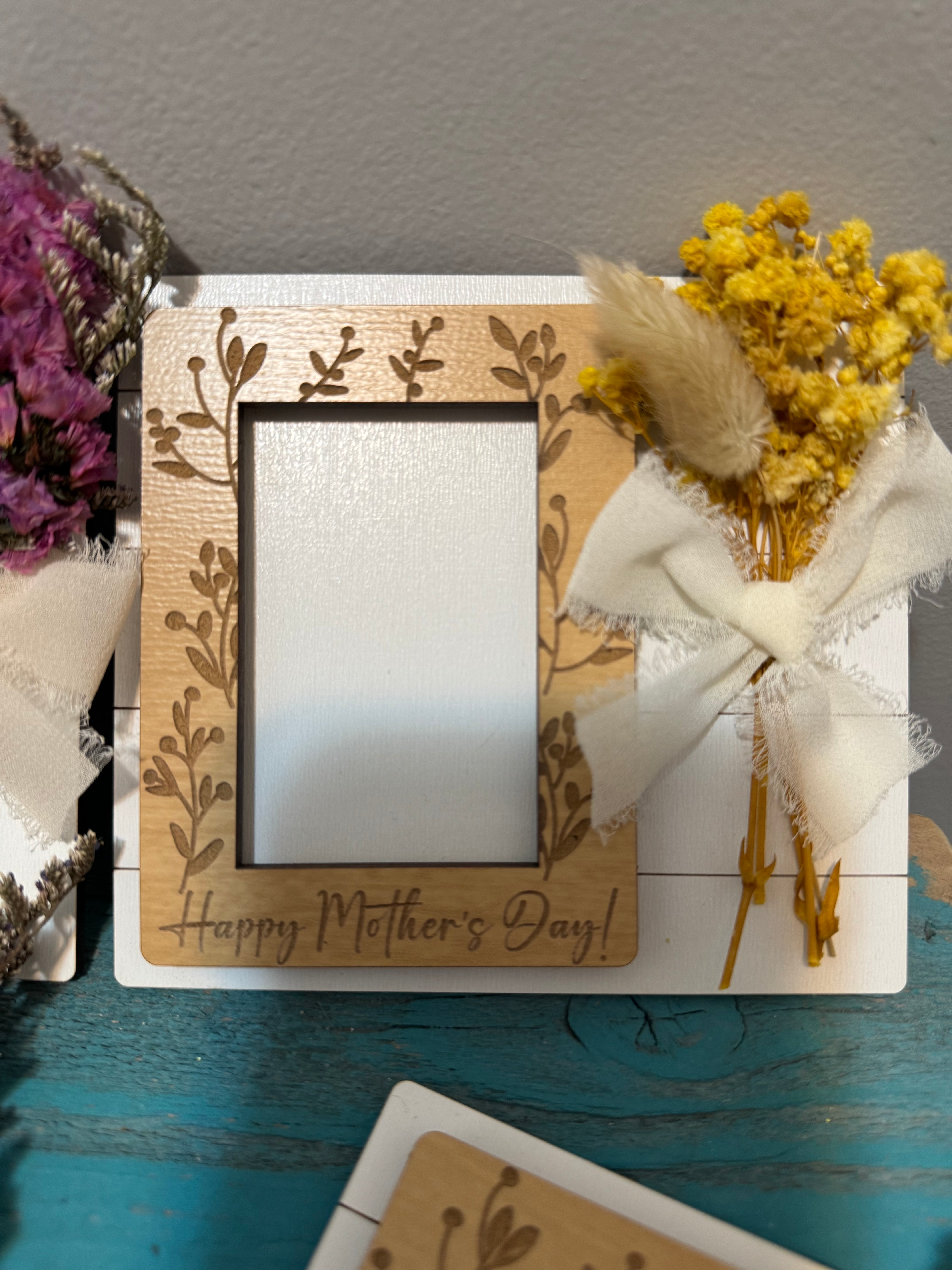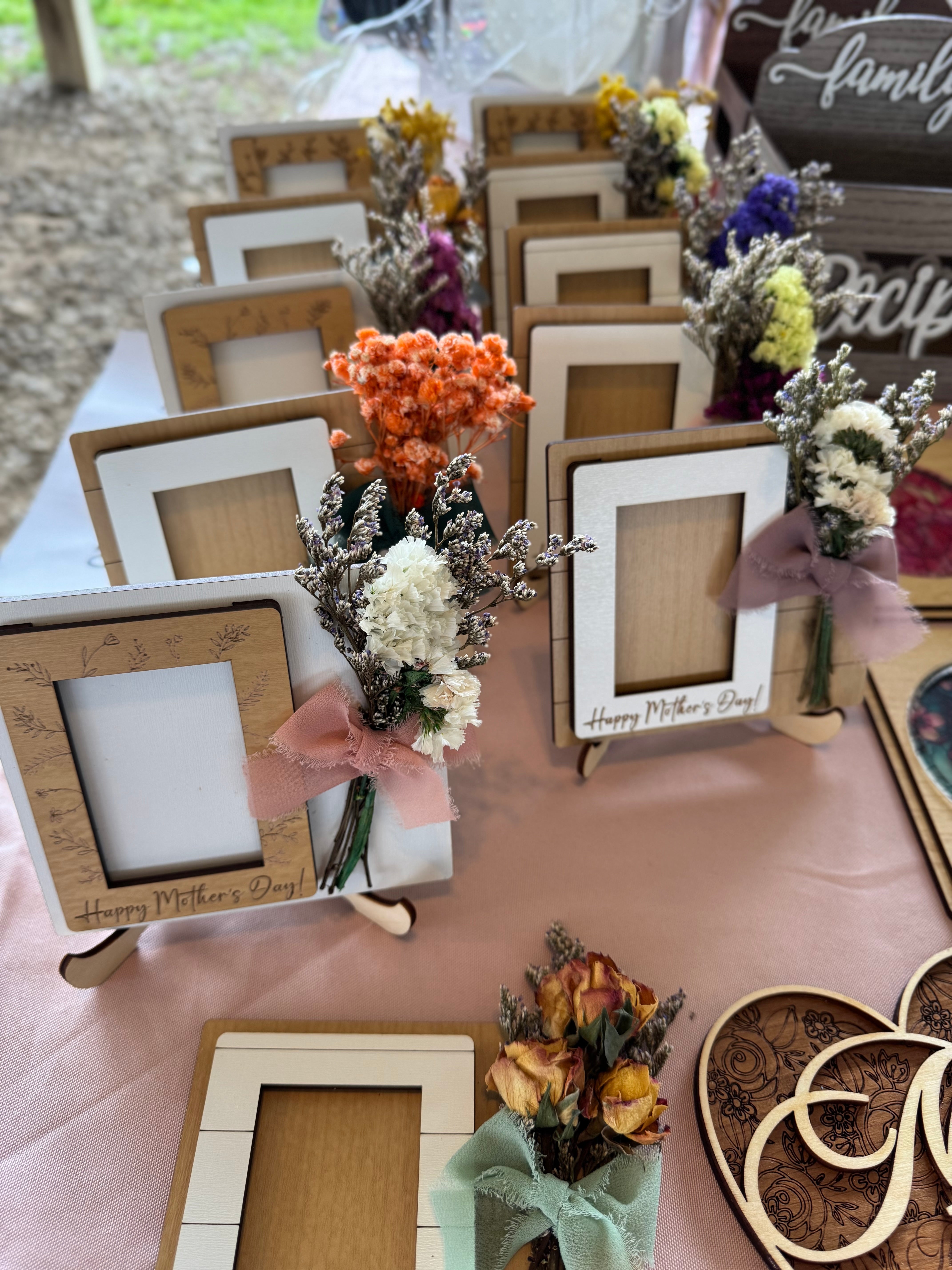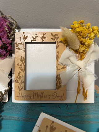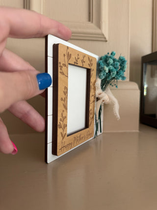 Mother’s Day photo frame! Made with faux flowers so will last forever! Fits a wallet size photo!