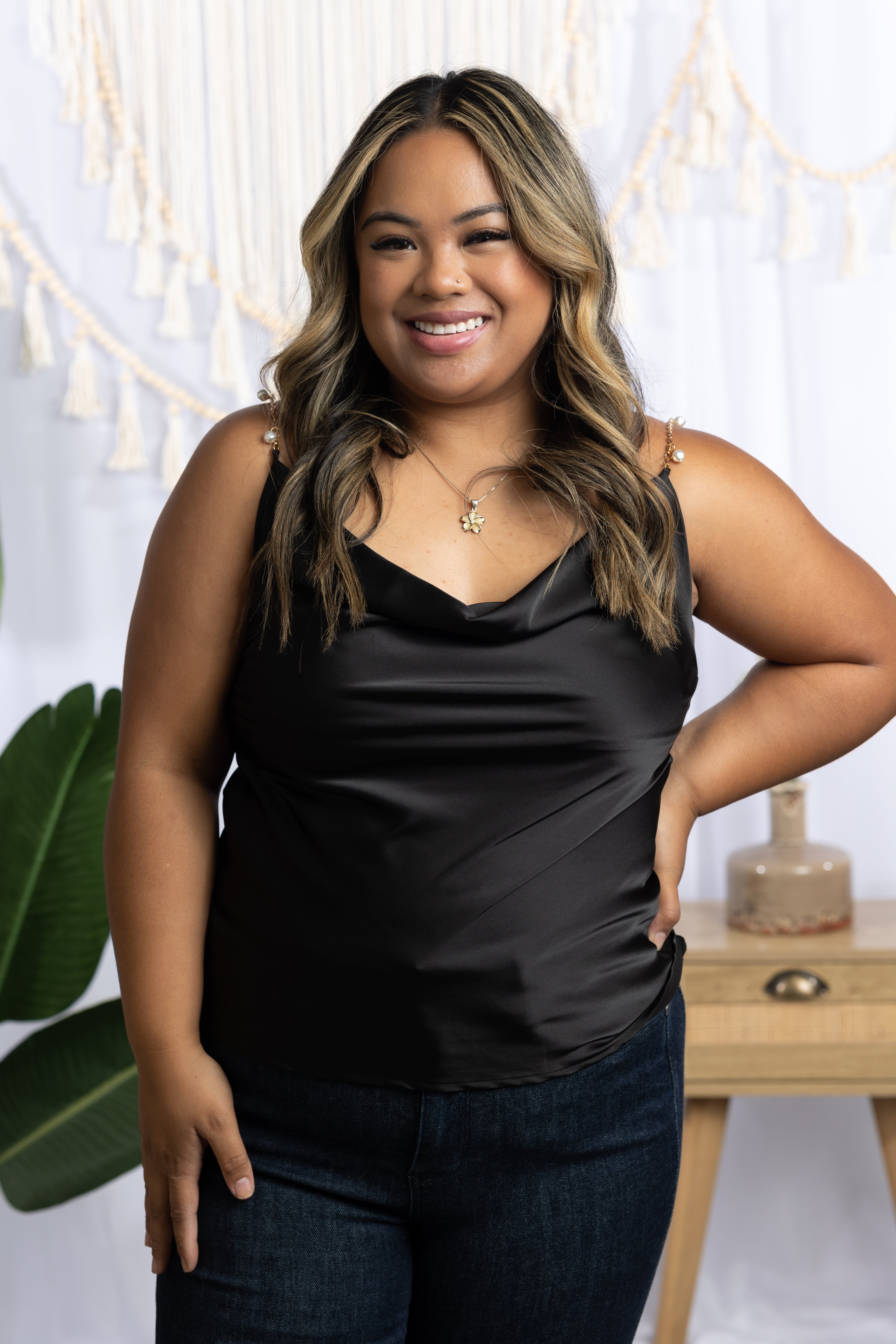 Slip into some satin & pearls – a sultry satin cami top with a great drape and luxurious golden chain straps adorned with faux pearl accents. Fancy and fashionable, this top will make you feel like a real glamour queen!
