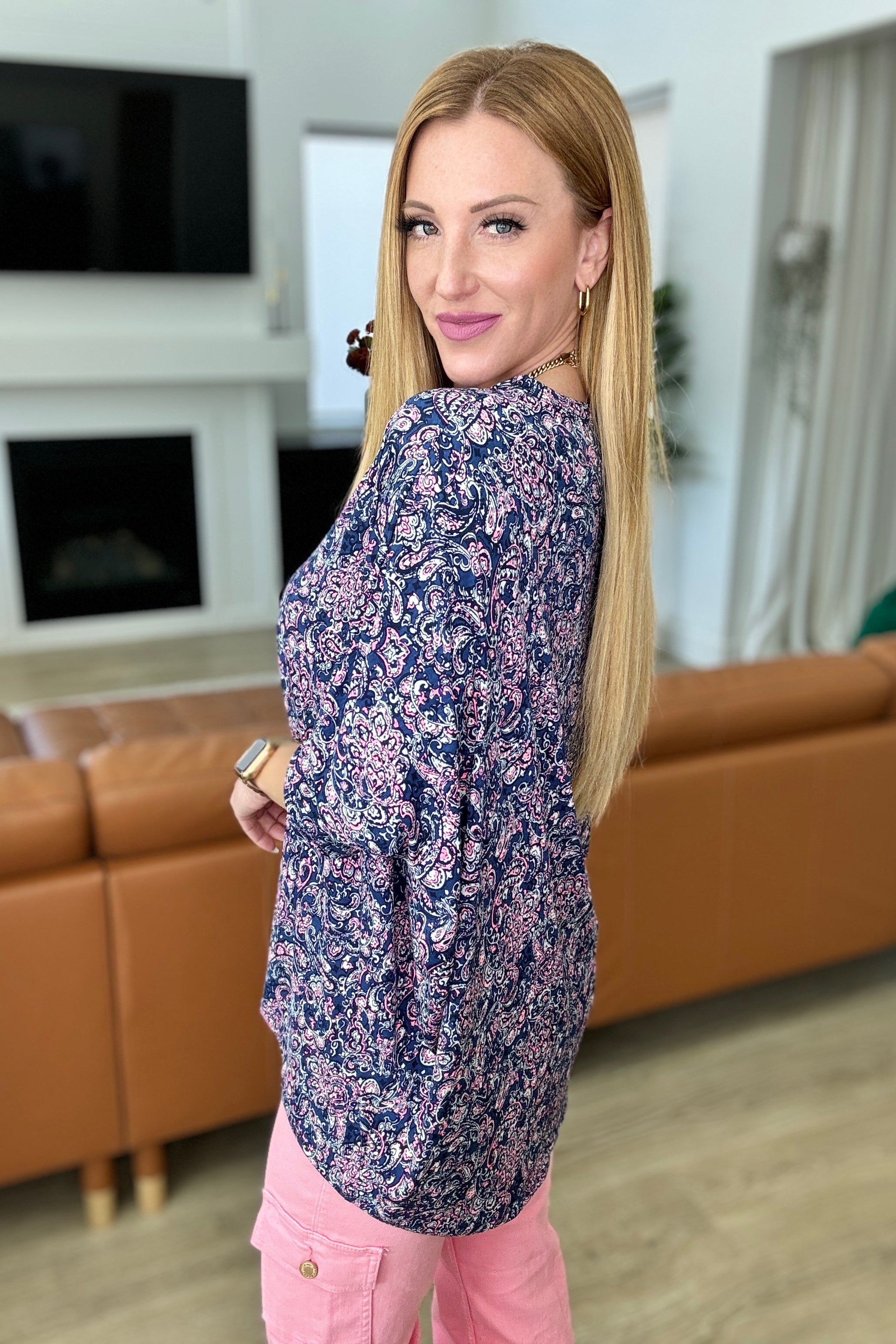 The Essentially You Top in Navy Paisley is the perfect blend of style and comfort. The boat neck and bat wing sleeve add a touch of elegance, while the high low scooped hem and banded sleeve cuff create a flattering silhouette. Made with bulgari fabric, this top is flowy, breathable, and oh-so-comfortable. (How can you resist?)