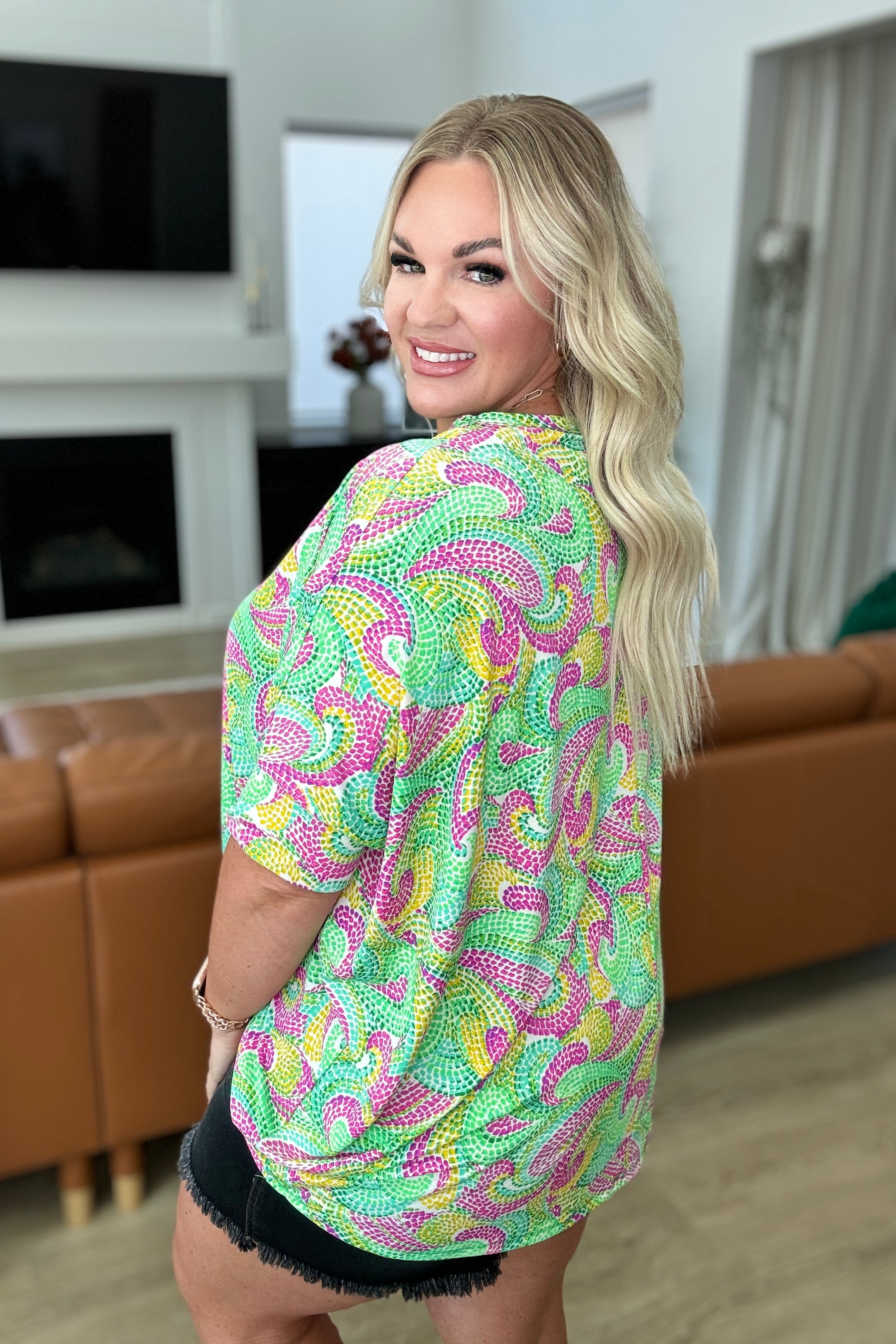 The Essentially You Top in Painted Green and Pink is the perfect blend of style and comfort. The boat neck and bat wing sleeve add a touch of elegance, while the high low scooped hem and banded sleeve cuff create a flattering silhouette. Made with bulgari fabric, this top is flowy, breathable, and oh-so-comfortable. (How can you resist?)