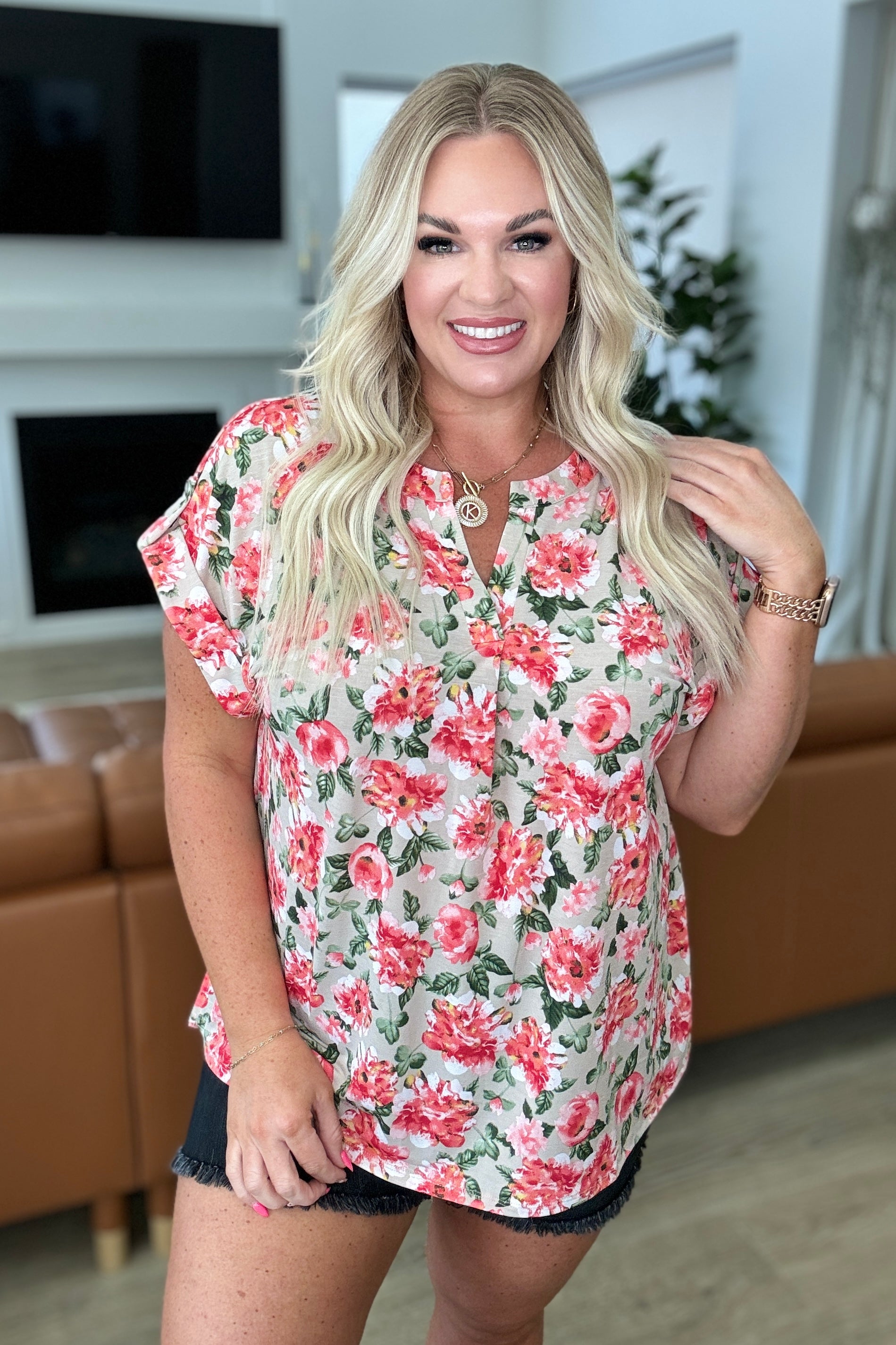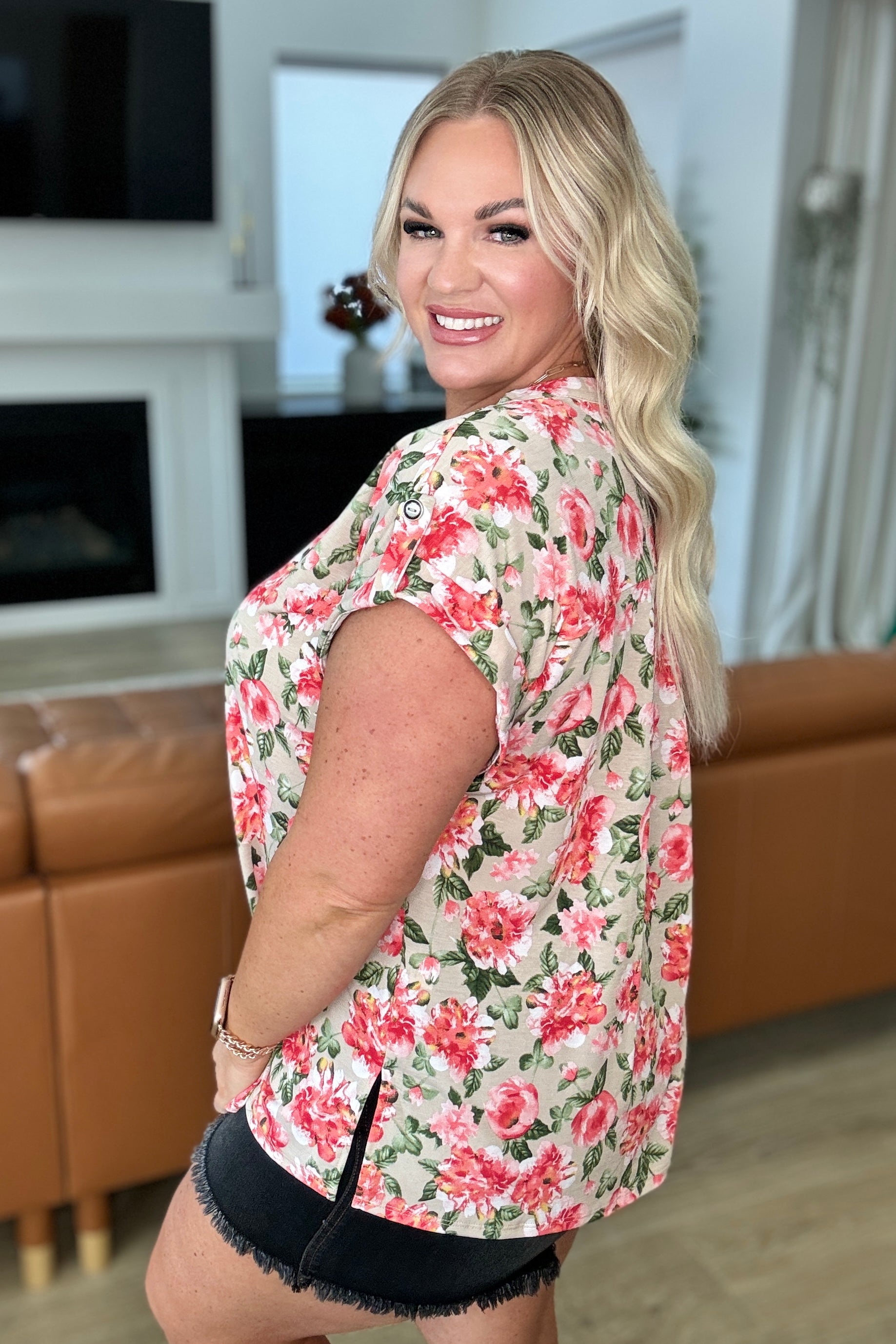 Revamp your wardrobe with the Lizzy Cap Sleeve Top in Coral and Beige Floral. Crafted from Bulgari fabric, this top boasts a playful Lizzy neckline and button rolled sleeve tabs for a unique touch. The cap short sleeve and scoop hem bring a hint of flow to this trendy piece. Enjoy both comfort and style with the Lizzy Top.