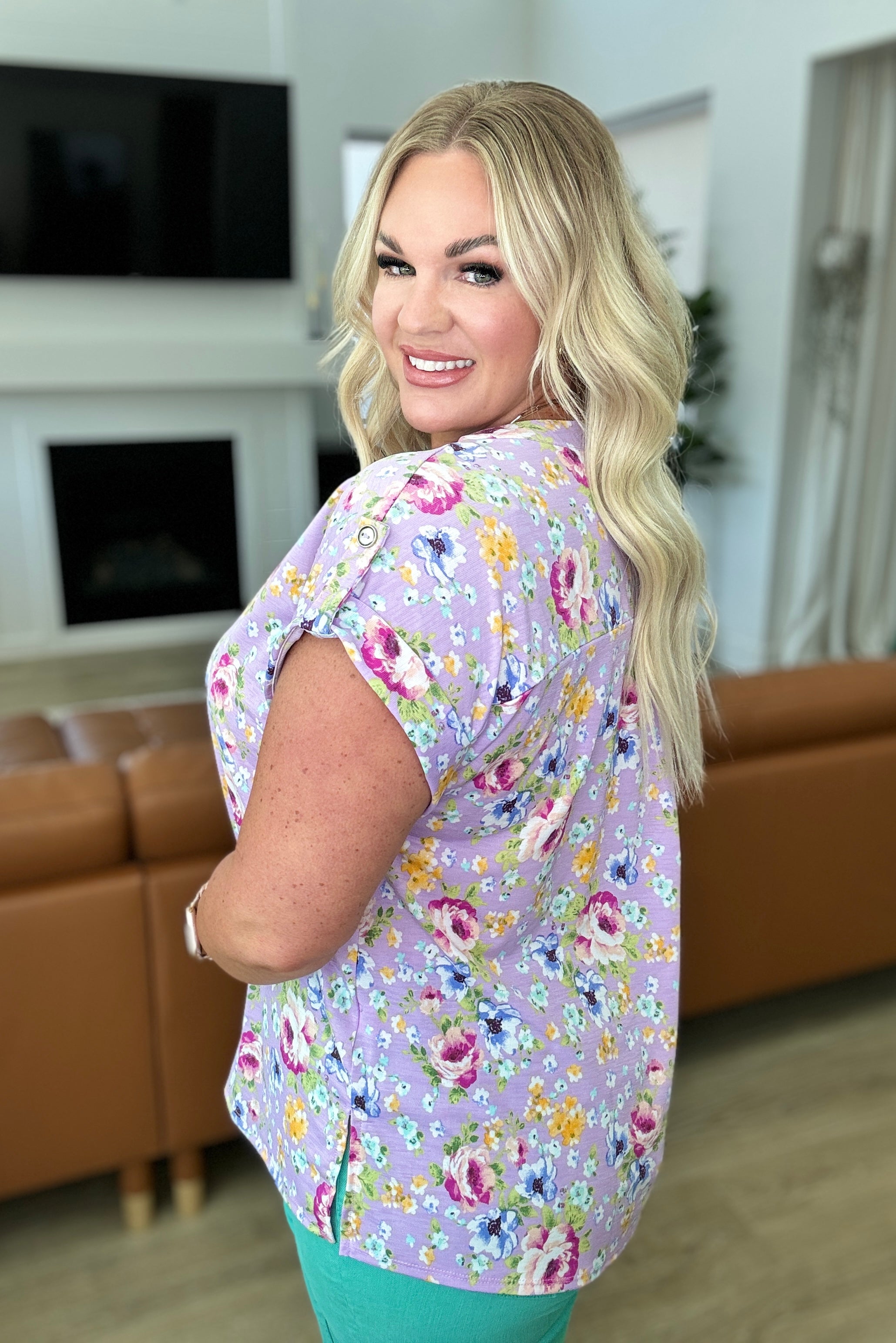Revamp your wardrobe with the Lizzy Cap Sleeve Top in Lavender and Magenta Floral. Crafted from Bulgari fabric, this top boasts a playful Lizzy neckline and button rolled sleeve tabs for a unique touch. The cap short sleeve and scoop hem bring a hint of flow to this trendy piece. Enjoy both comfort and style with the Lizzy Top.