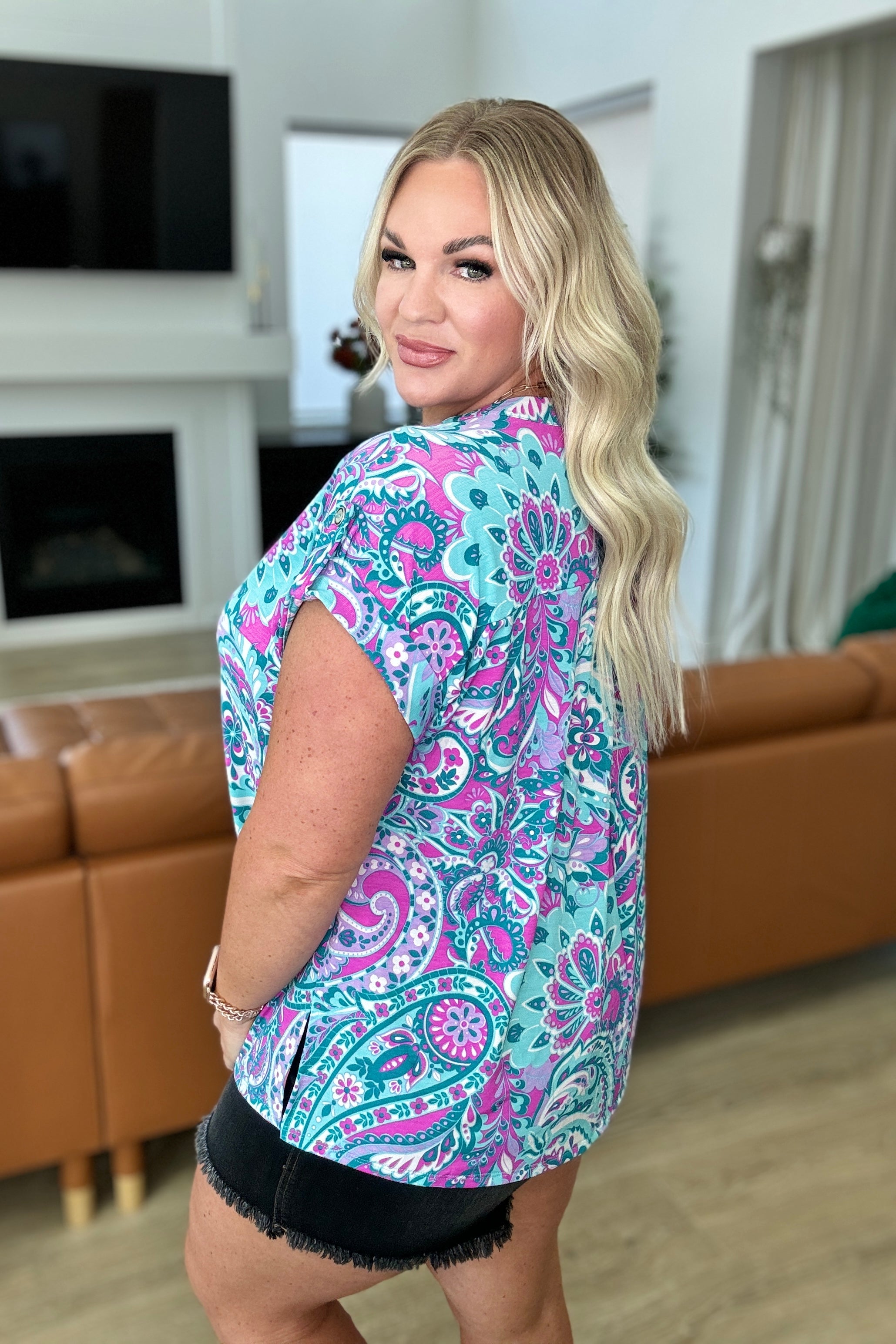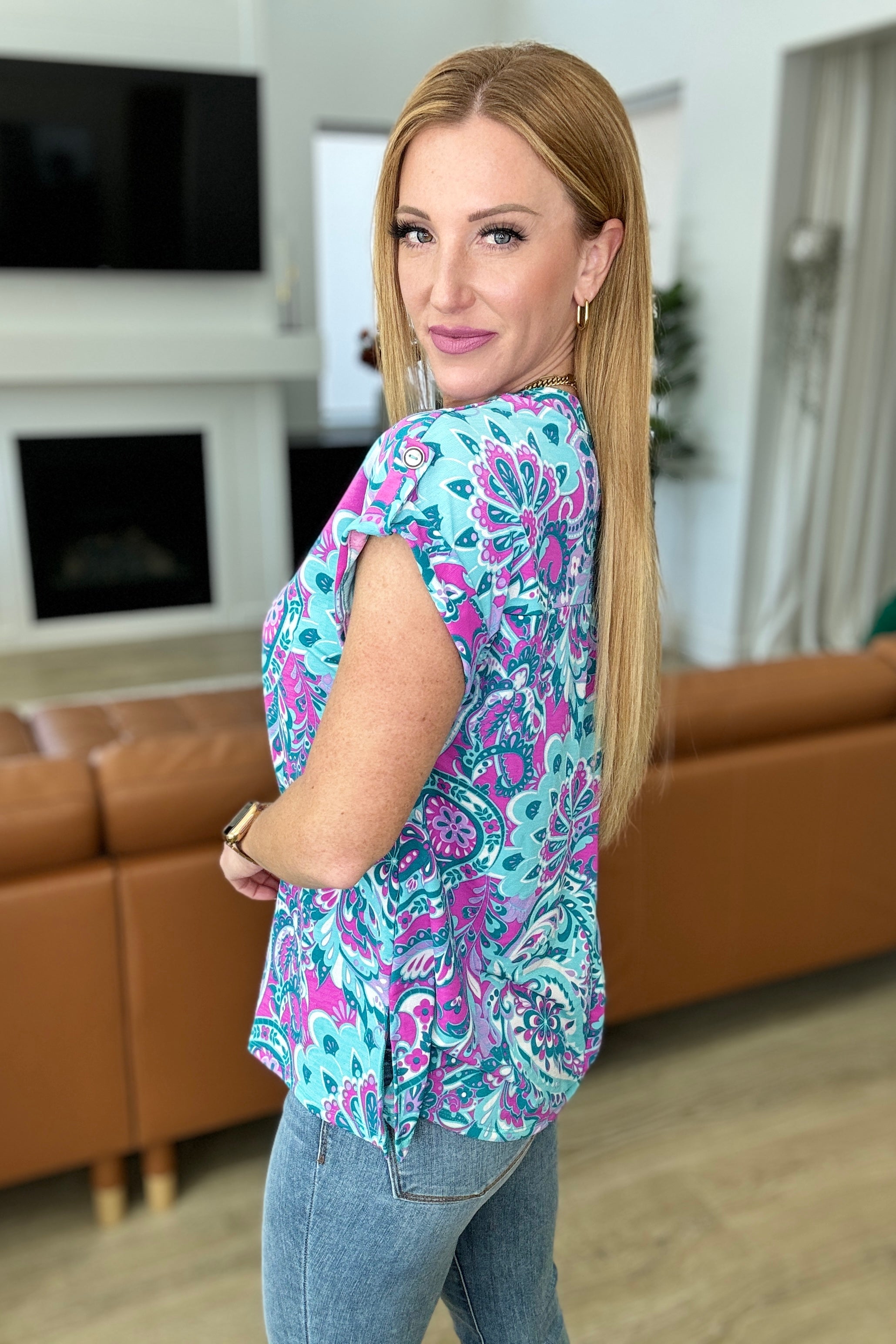 Revamp your wardrobe with the Lizzy Cap Sleeve Top in Magenta and Teal Paisley. Crafted from Bulgari fabric, this top boasts a playful Lizzy neckline and button rolled sleeve tabs for a unique touch. The cap short sleeve and scoop hem bring a hint of flow to this trendy piece. Enjoy both comfort and style with the Lizzy Top.
