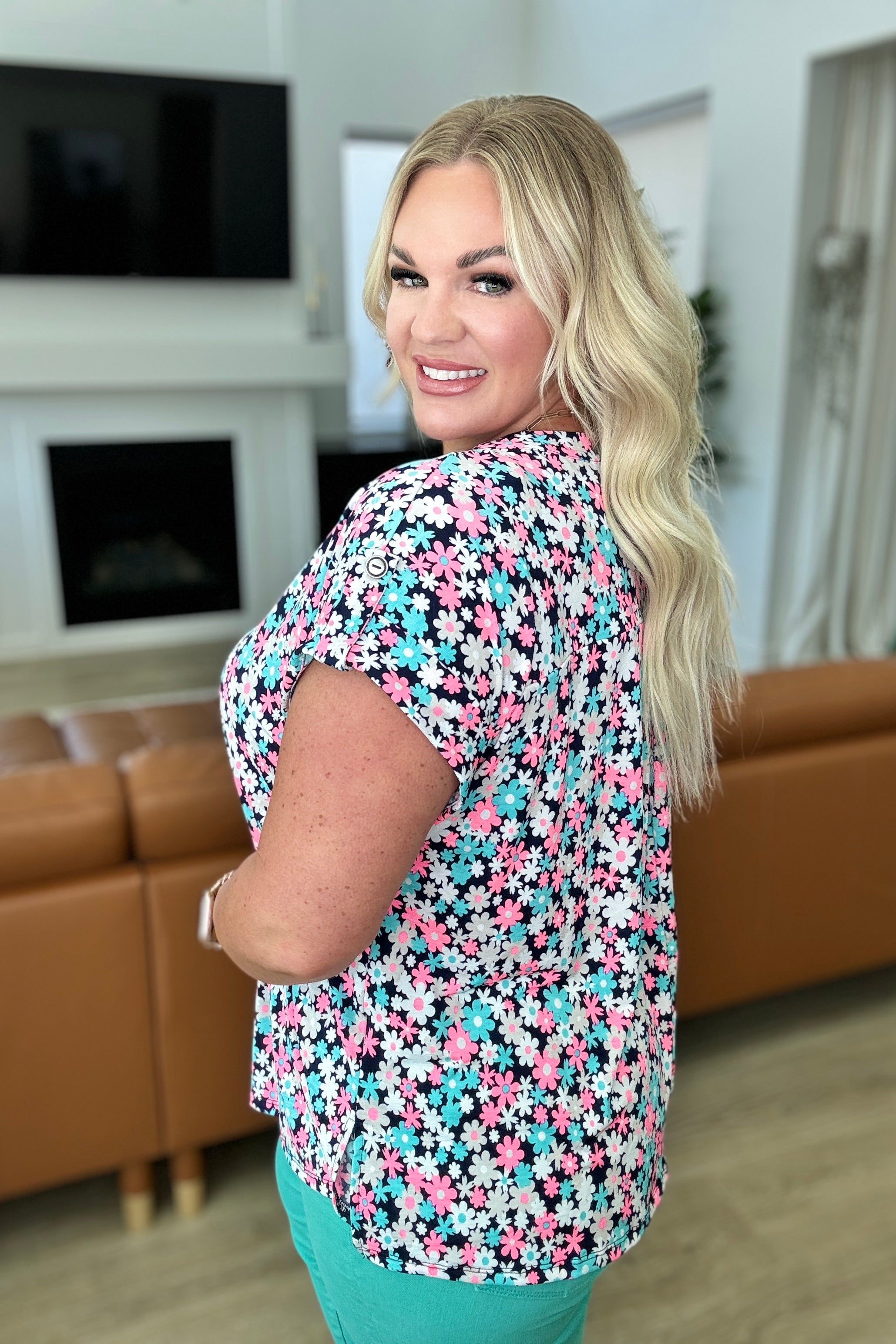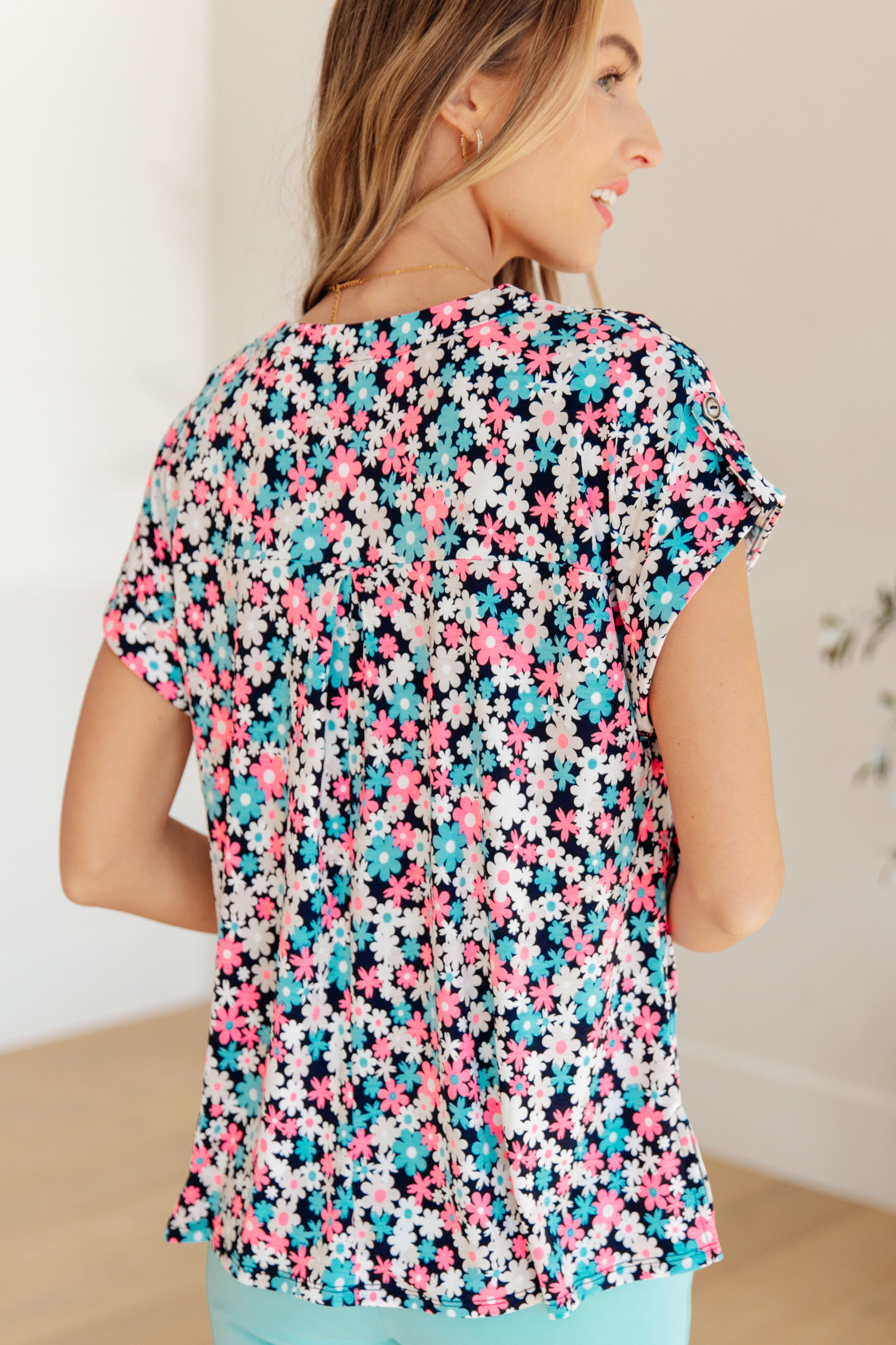 Revamp your wardrobe with the Lizzy Cap Sleeve Top in Navy and Hot Pink Floral. Crafted from Bulgari fabric, this top boasts a playful Lizzy neckline and button rolled sleeve tabs for a unique touch. The cap short sleeve and scoop hem bring a hint of flow to this trendy piece. Enjoy both comfort and style with the Lizzy Top.