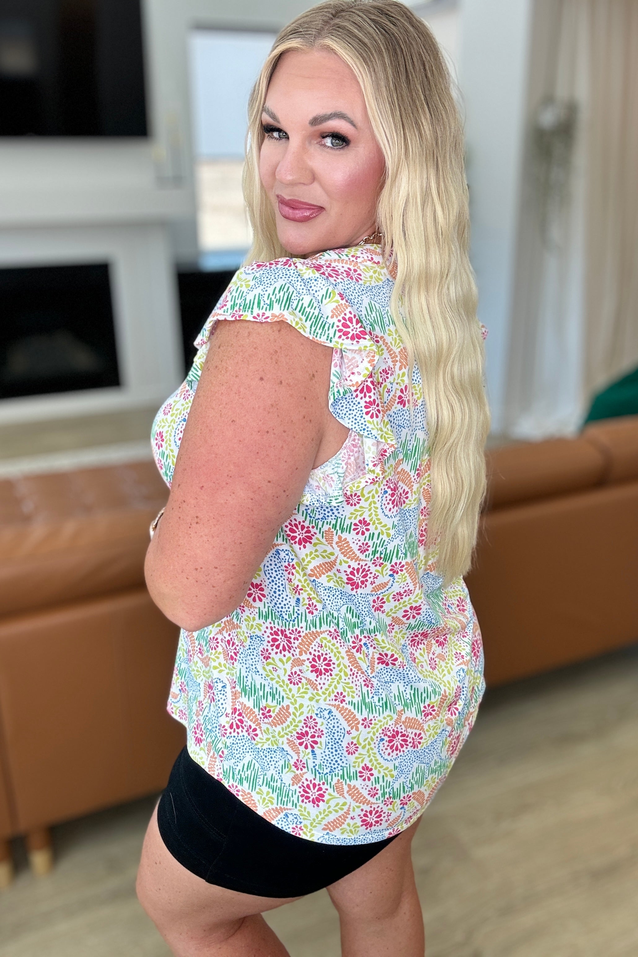 Add some flair to your wardrobe with the Lizzy Flutter Sleeve Top! This playful top features a V-neck, flutter sleeves, and a hi-low scooped hem. Perfect for any occasion, the groovy pattern adds a touch of stylish whimsy. Upgrade your style game with Bulgari's latest!